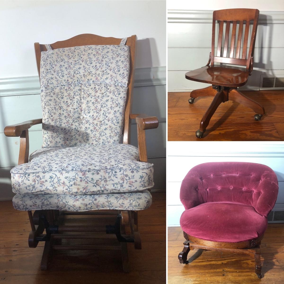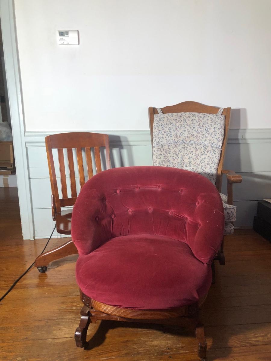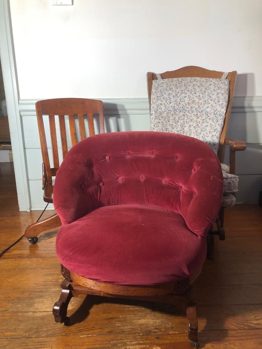 LOT 60L: Vintage Round Red Rolling Chair w/ Rocking Chair & Rolling Wooden Char