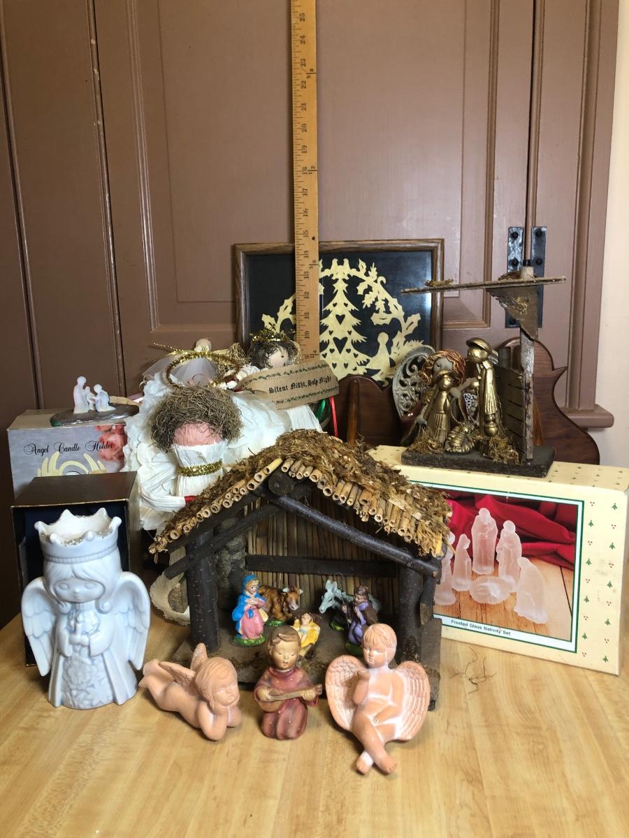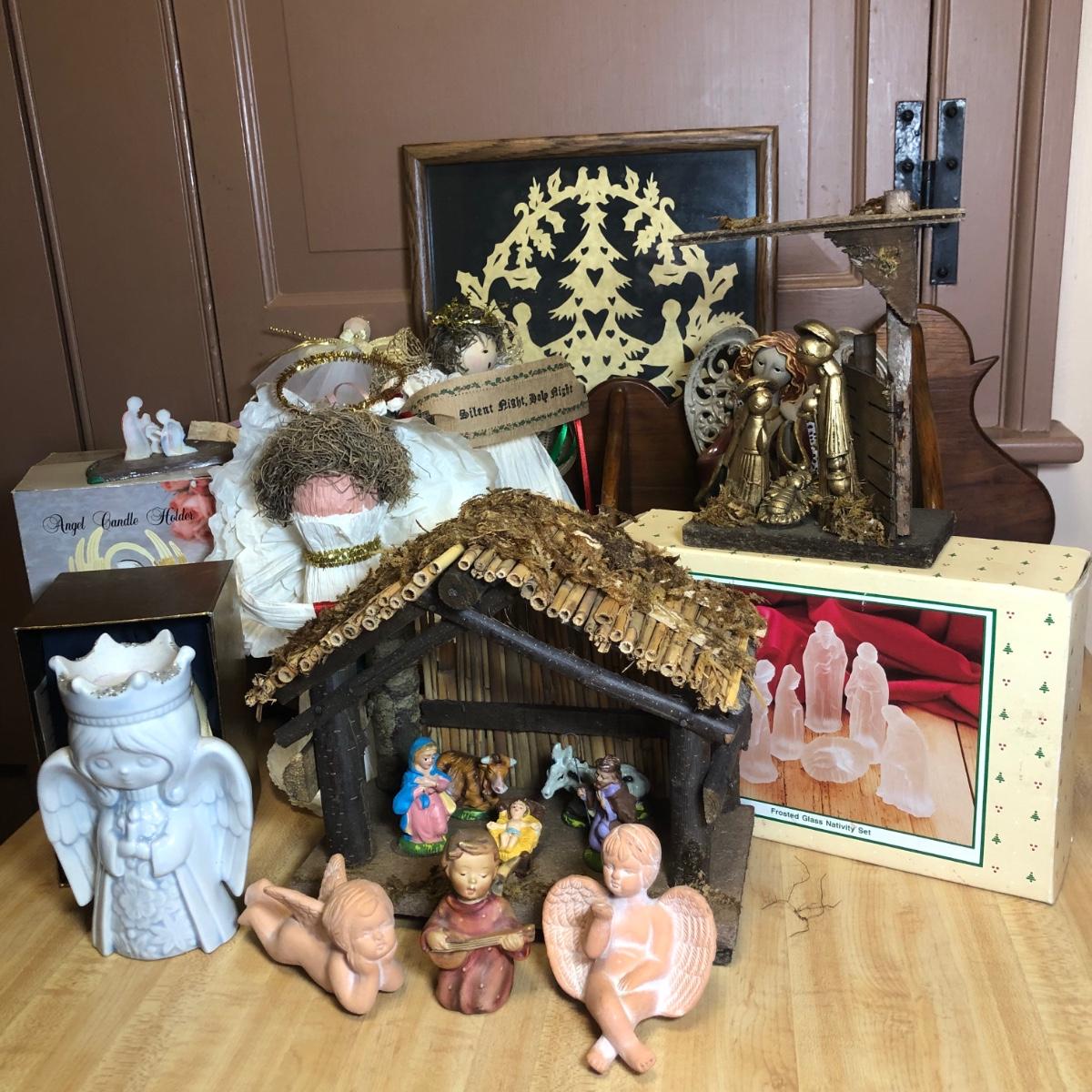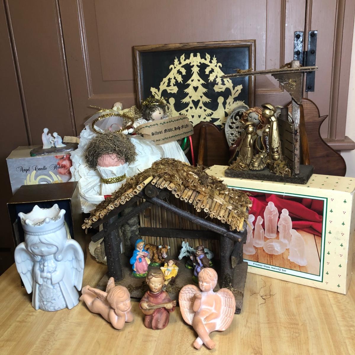LOT 107L: Holiday Angels & Religious Decor - Glass Nativity, Goebel Figurine, Holy Family Statue & Creche Made in Italy, Hand Made Paper Angels & More