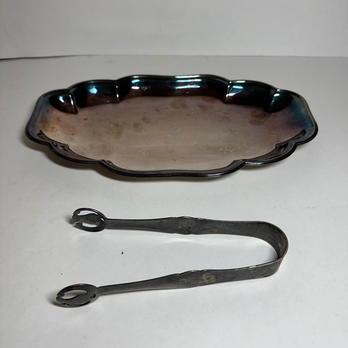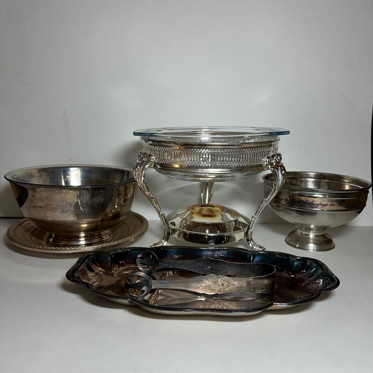LOT 140B: Silver Plated Sugar Tongs, Candy Dish, Food Warmer & More