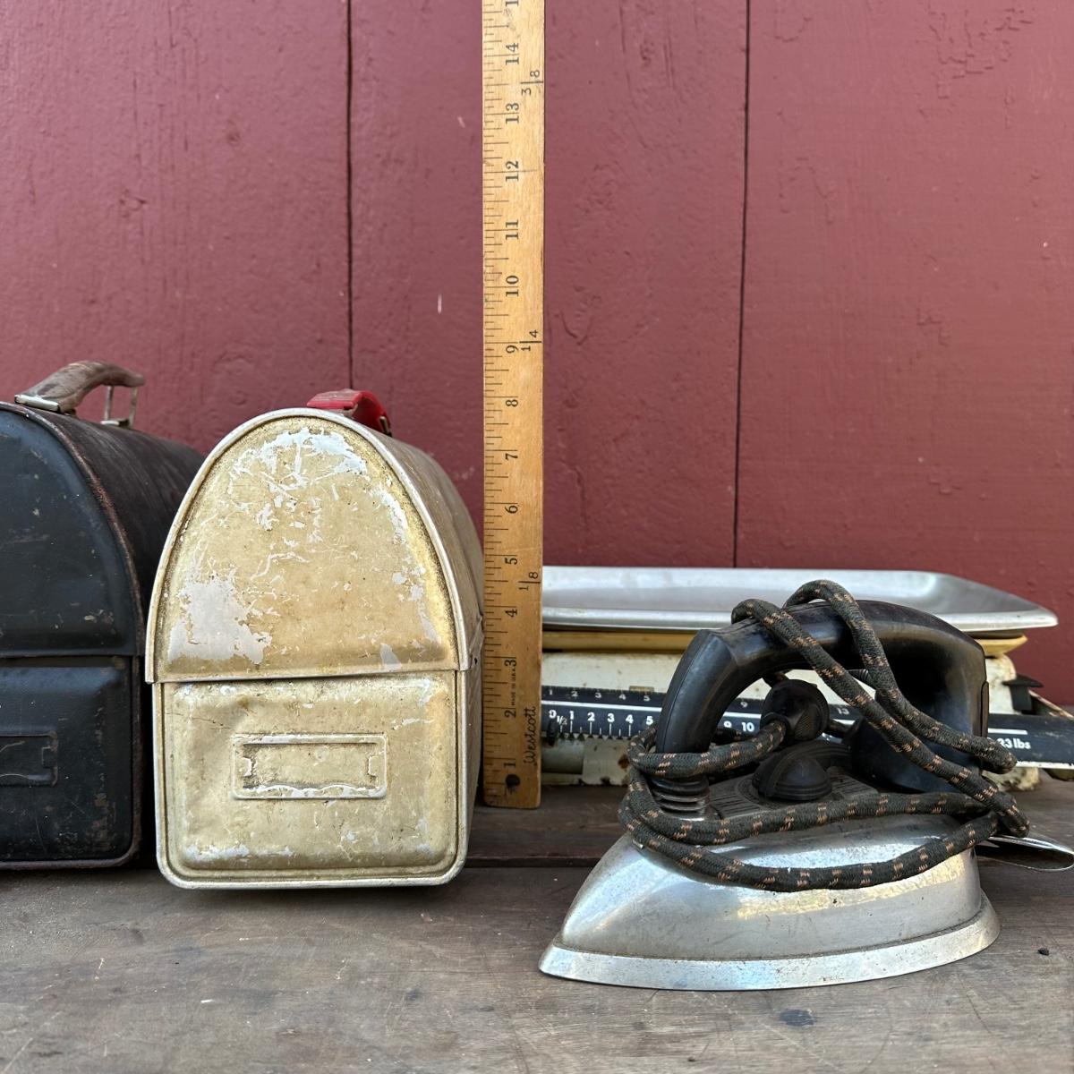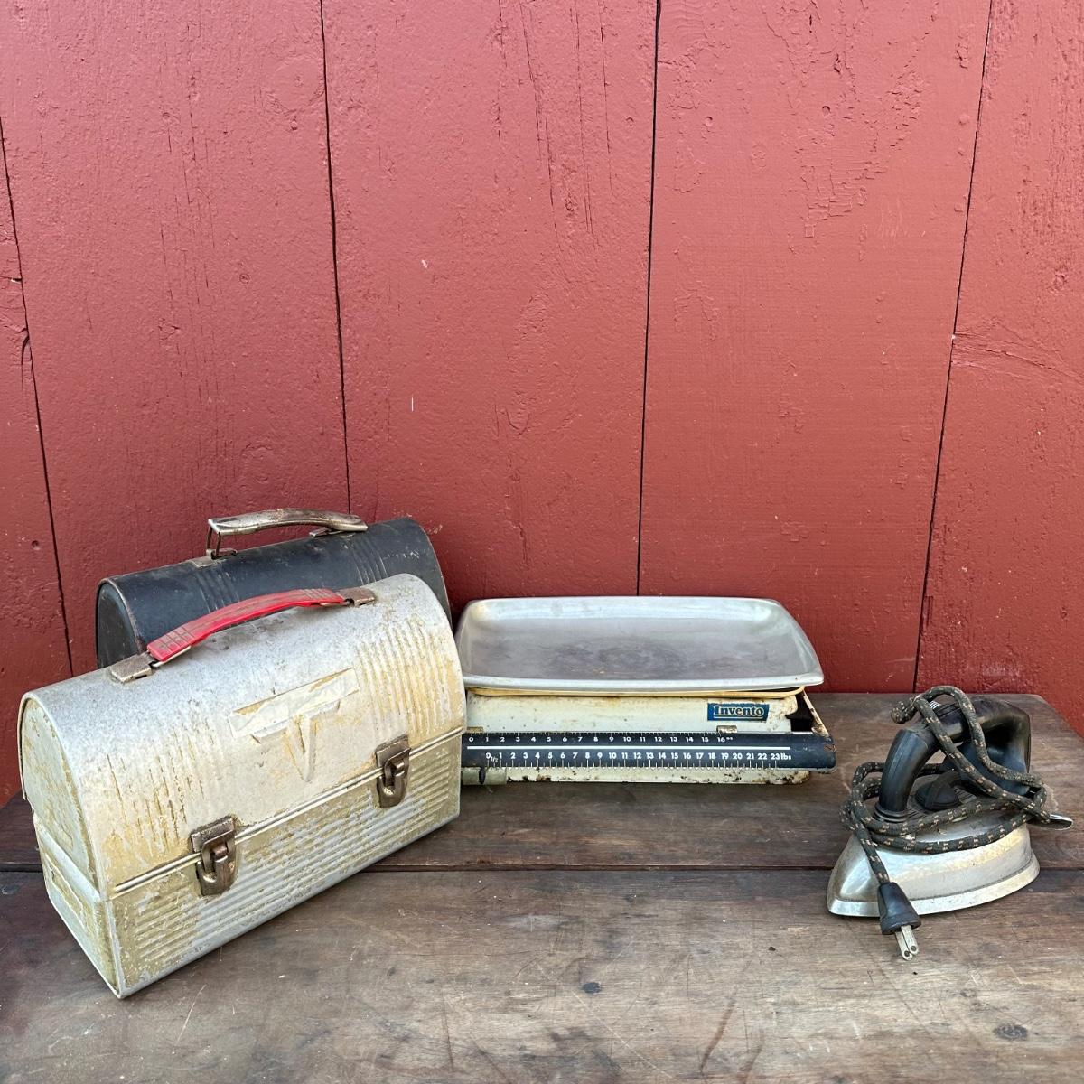 LOT 153G: Vintage Invento Kitchen Scale, Lunch Boxes & Travel Iron