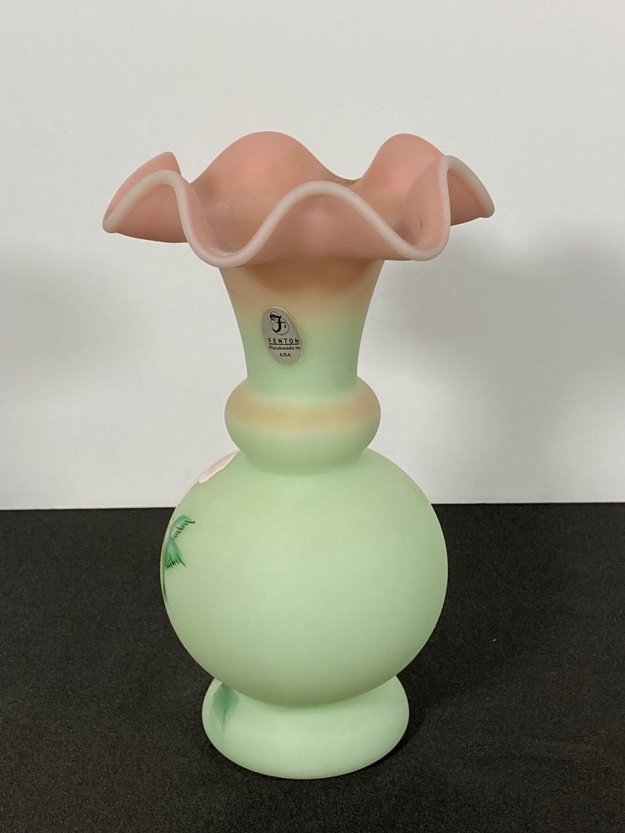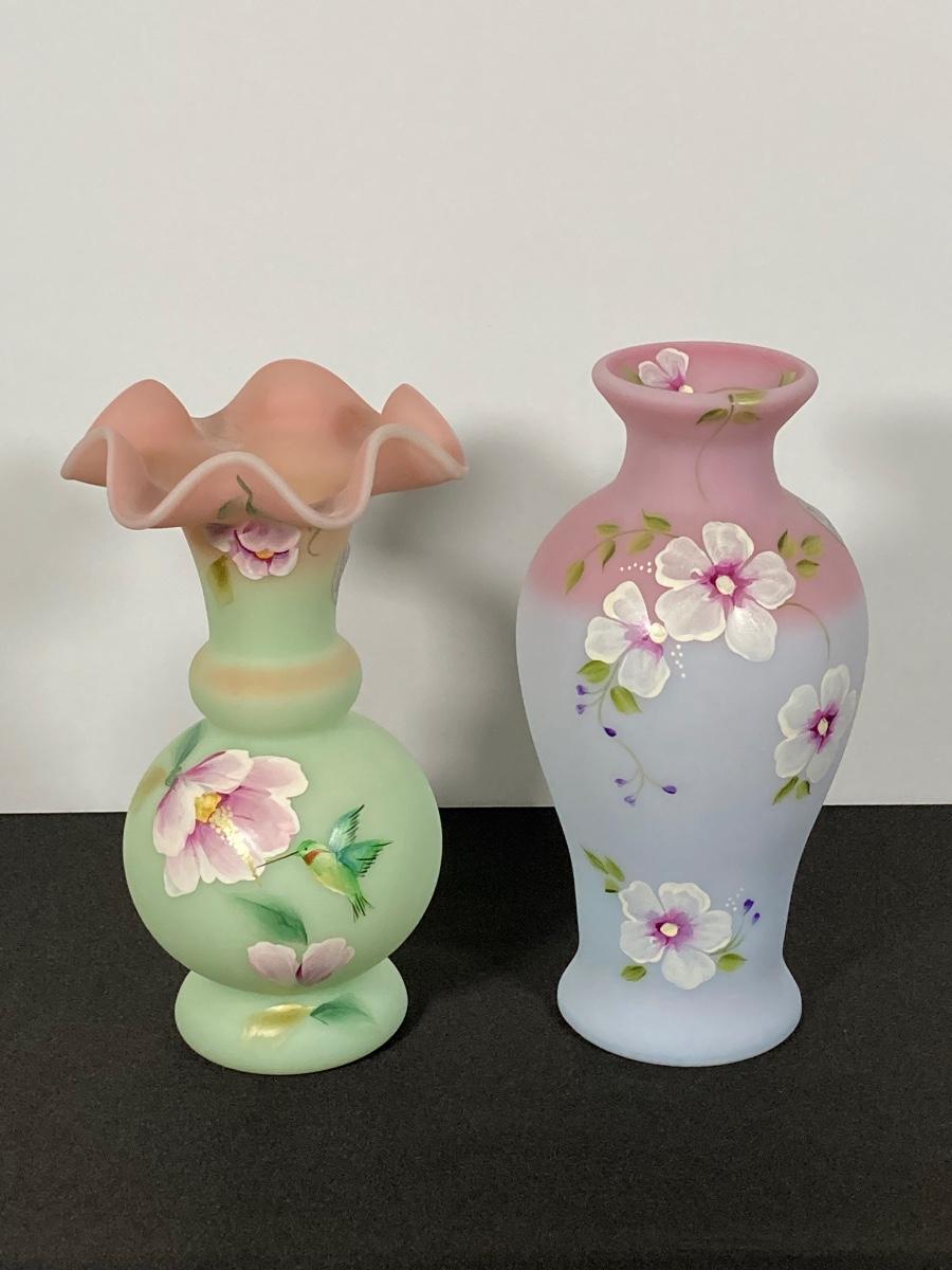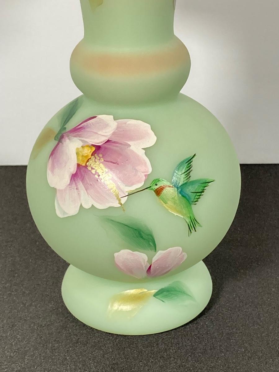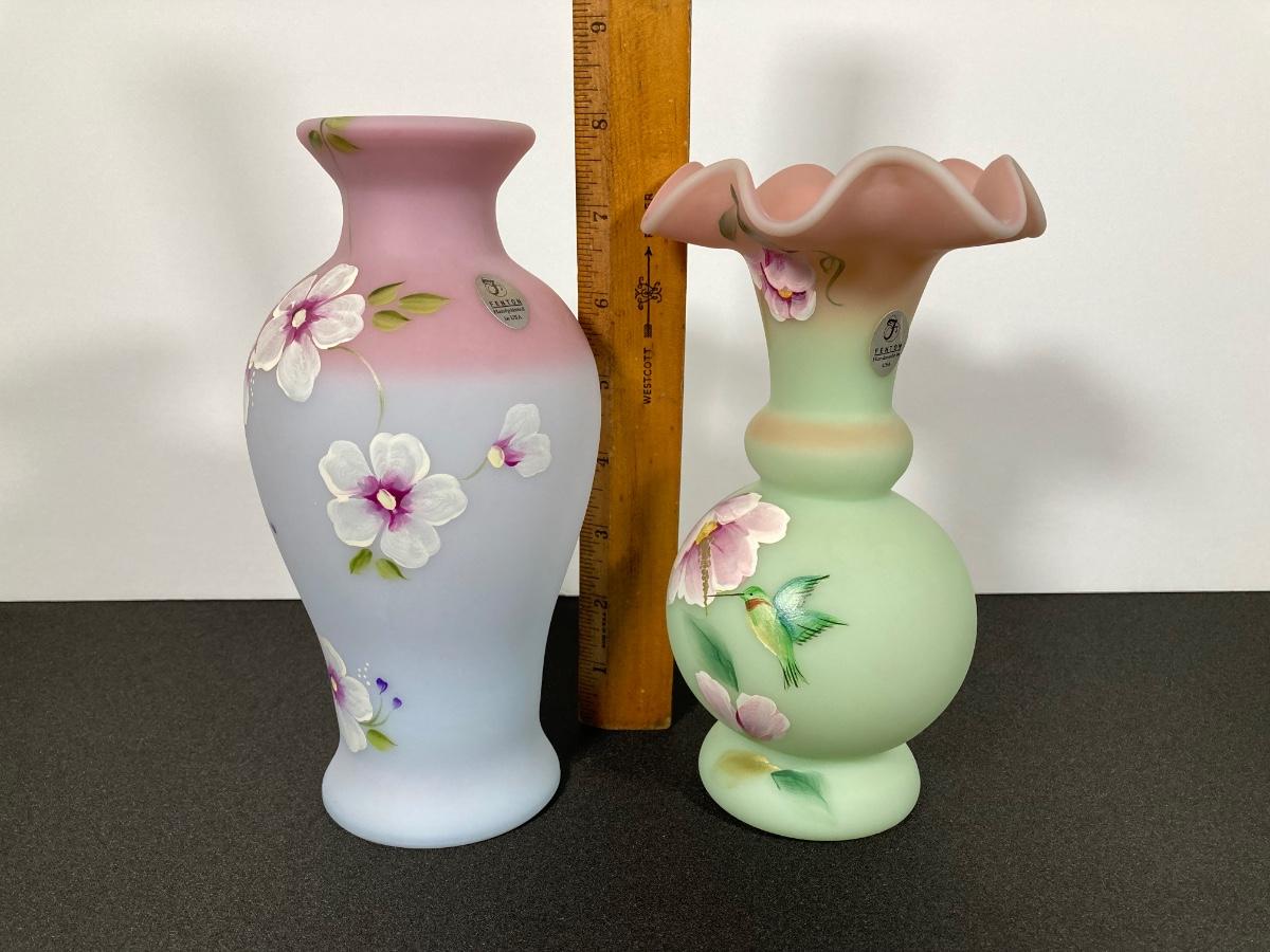 LOT 4J: Fenton Frosted Glass Vase Collection - Hand Painted Hummingbird and More