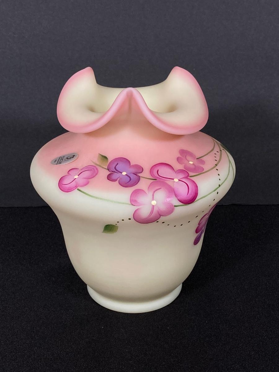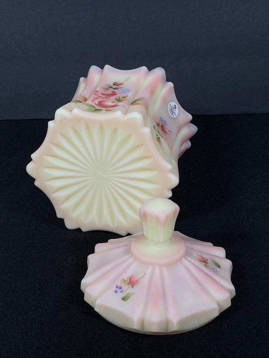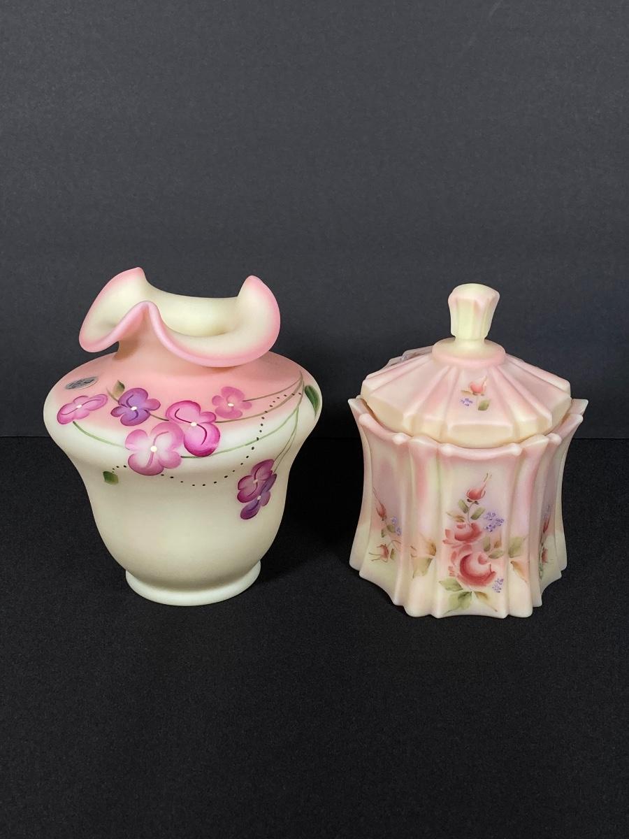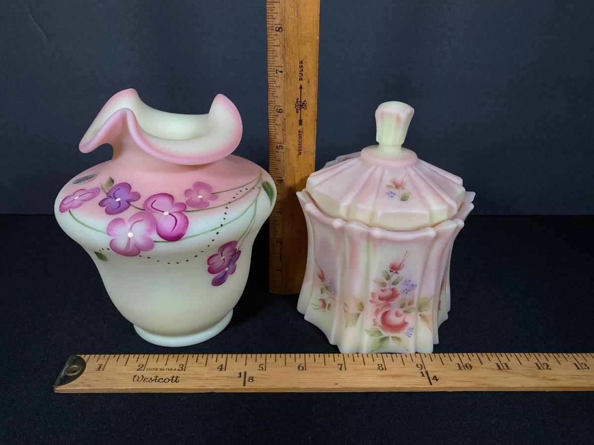LOT 12J: Fenton Frosted Burmese Collection - Ruffled Vase and Lidded Candy Dish
