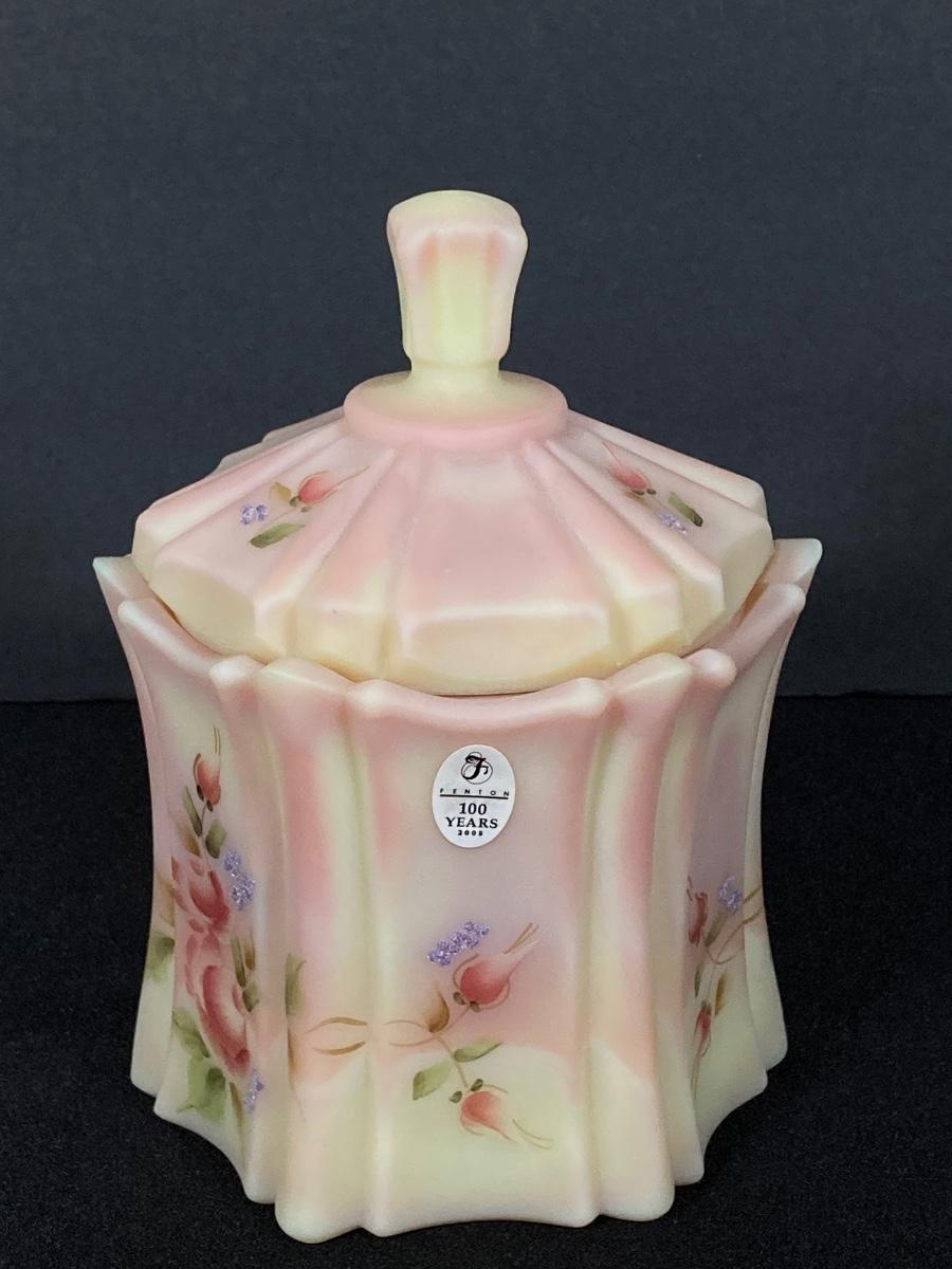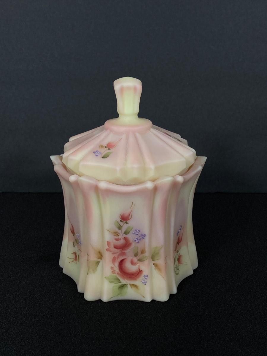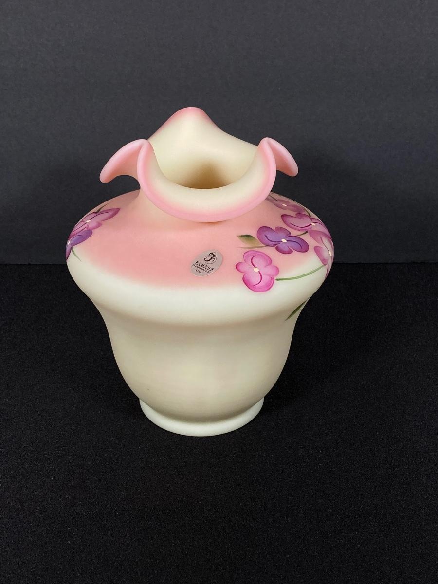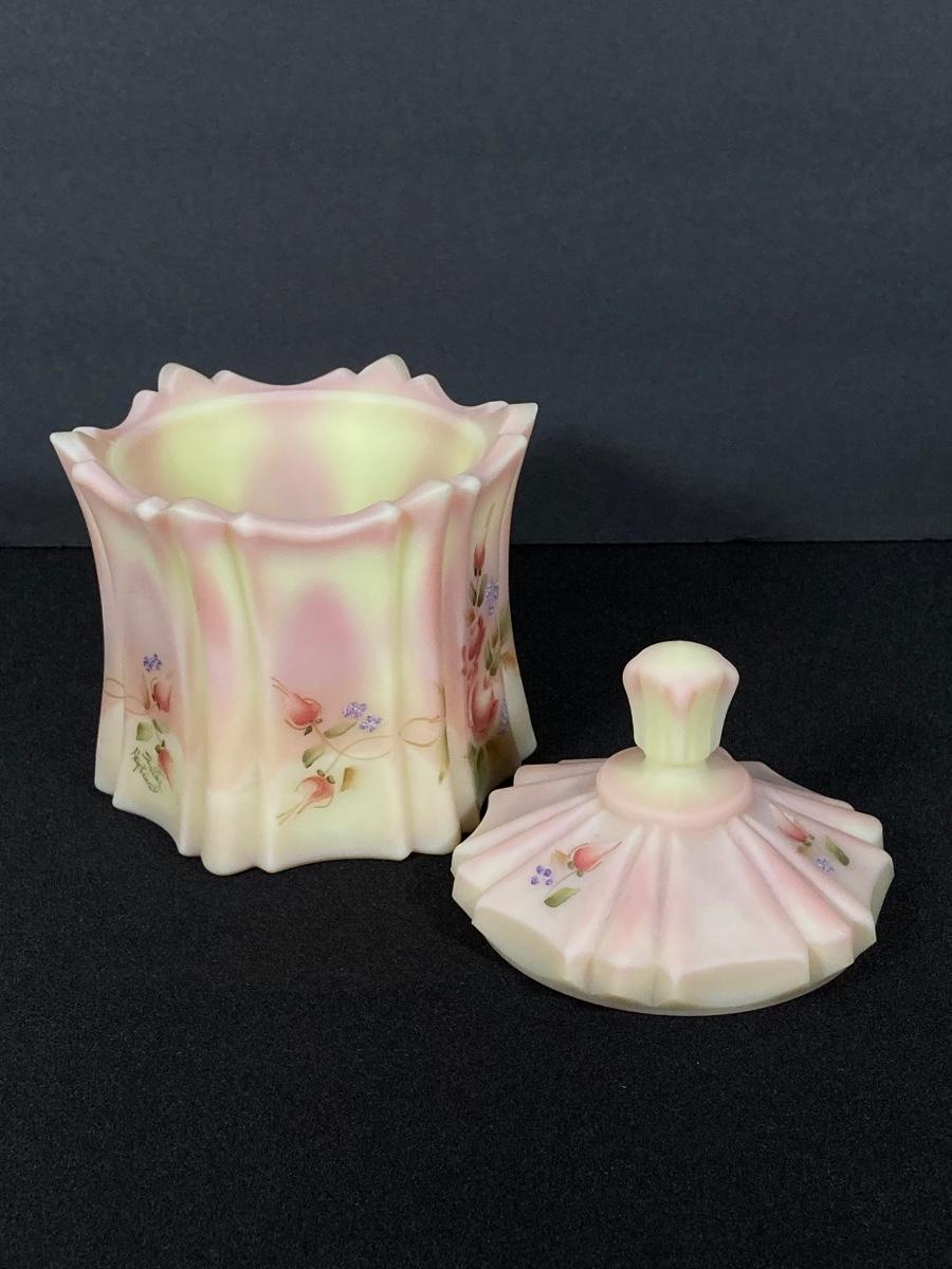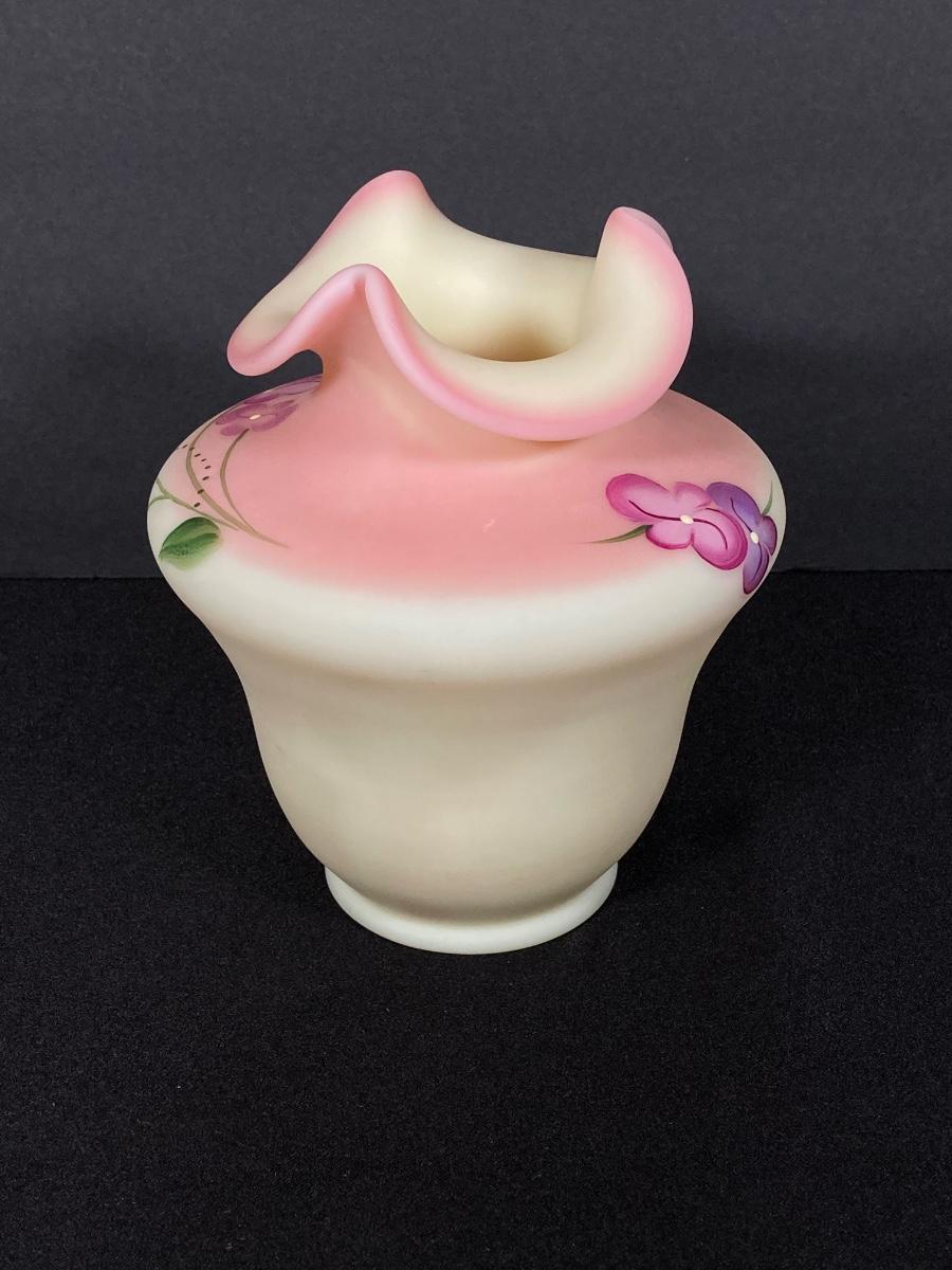 LOT 12J: Fenton Frosted Burmese Collection - Ruffled Vase and Lidded Candy Dish