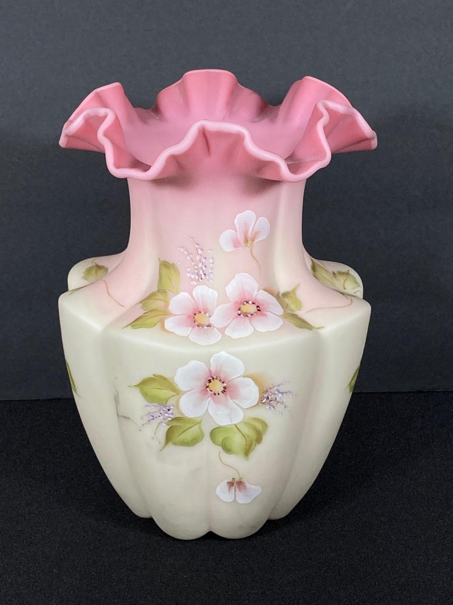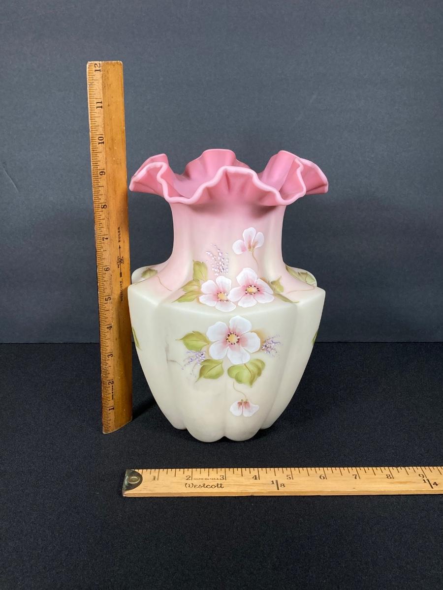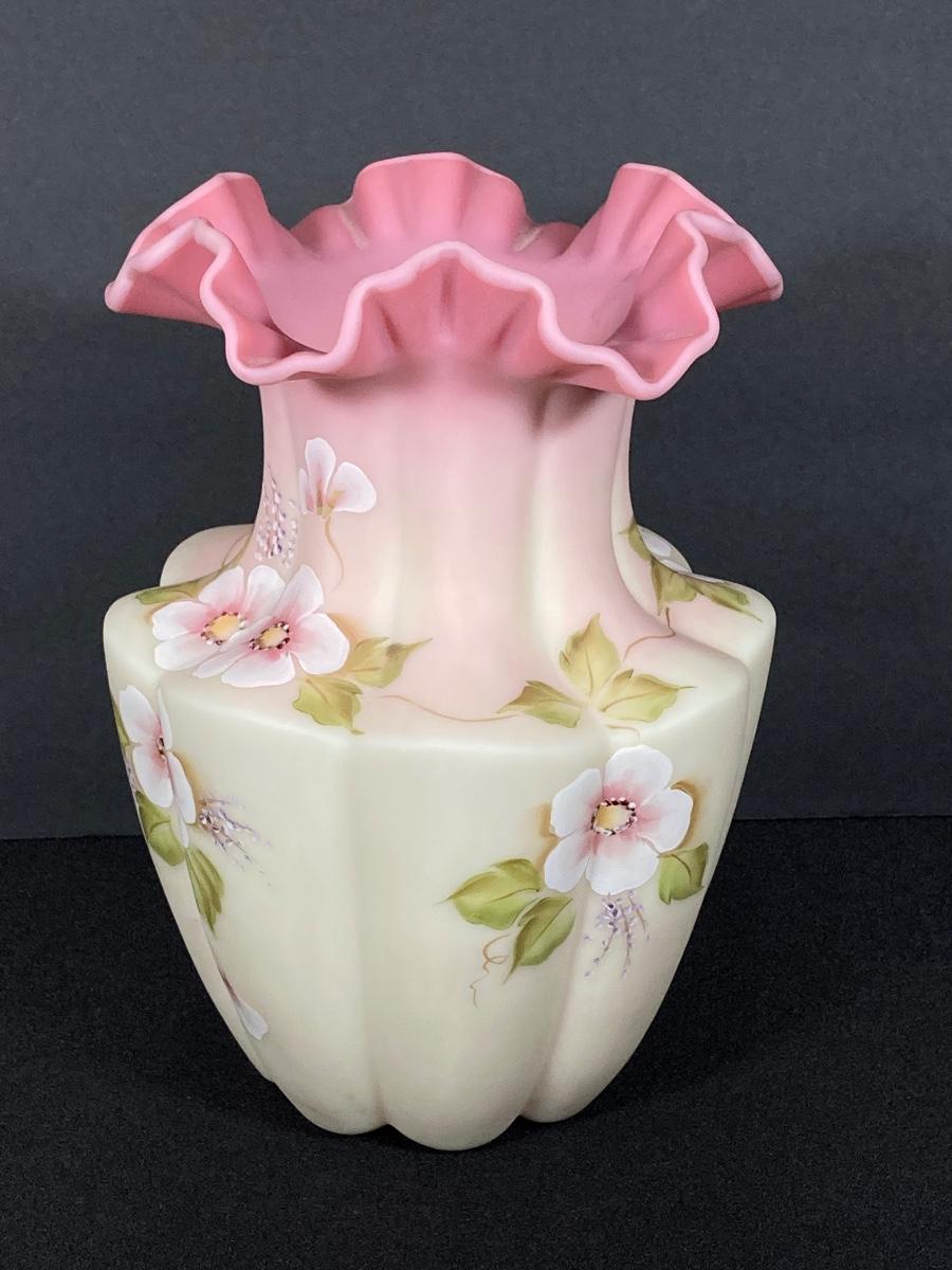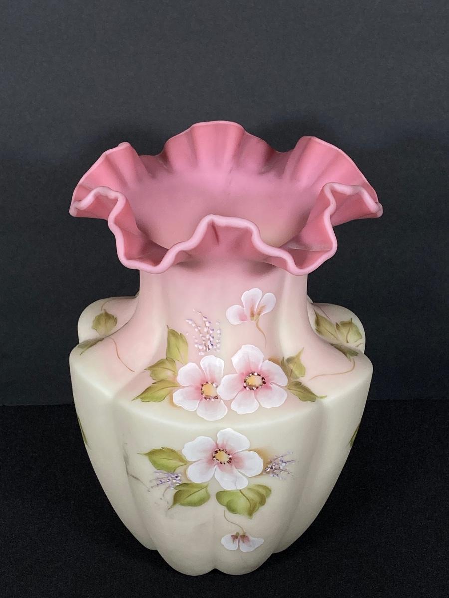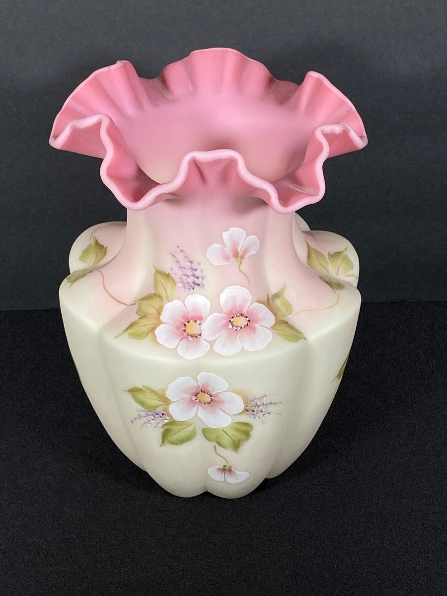 LOT 14J: Fenton Burmese Glass Ruffled Top Vase