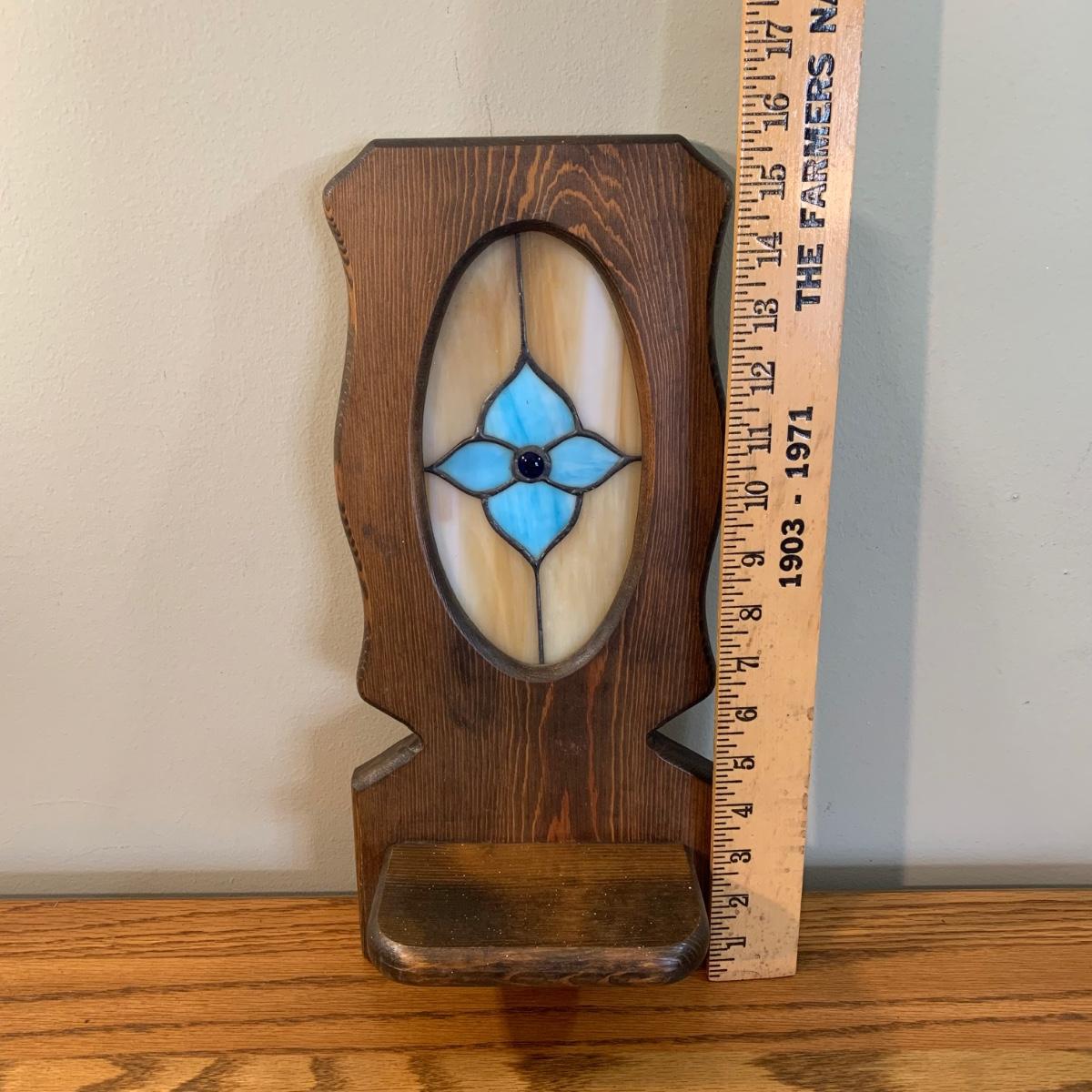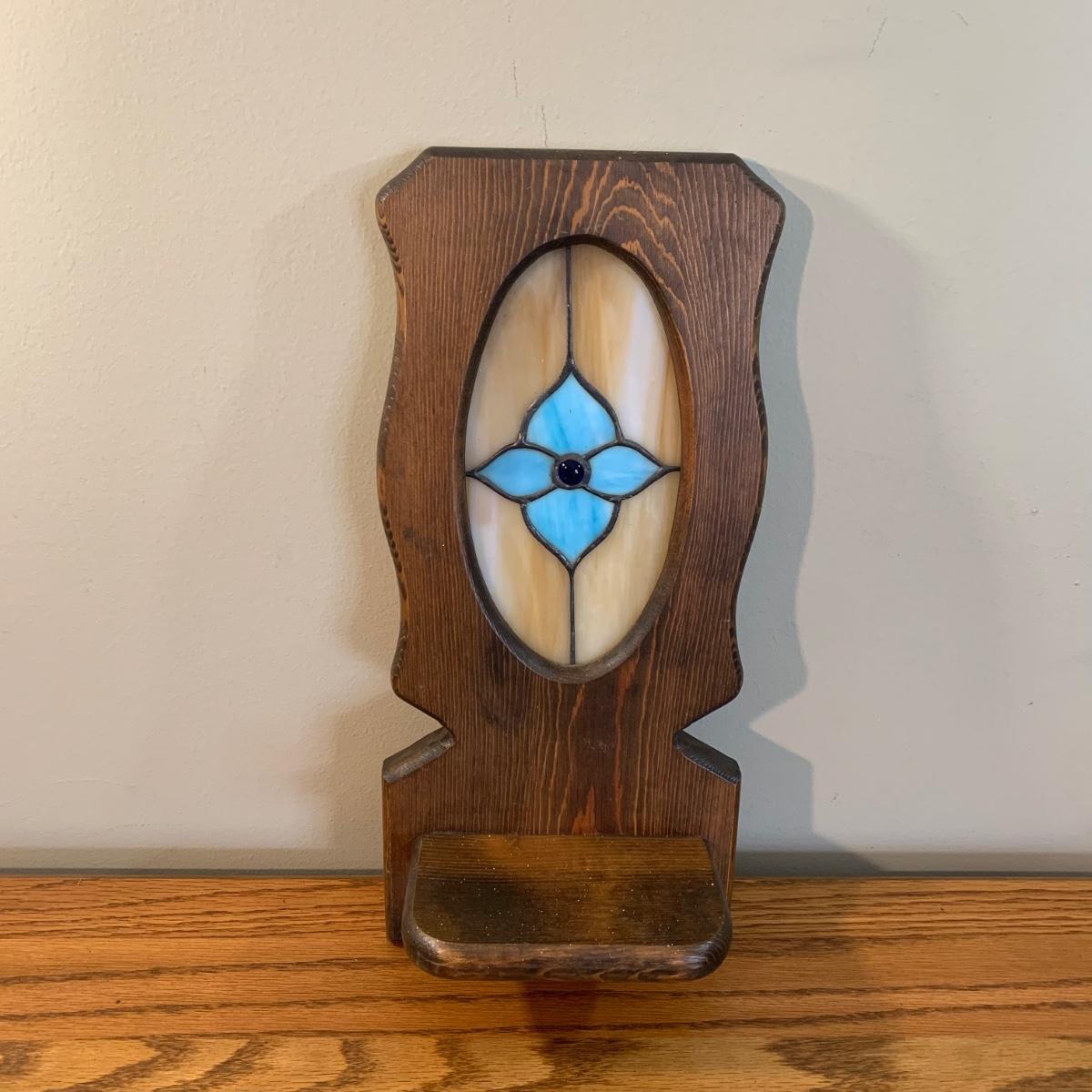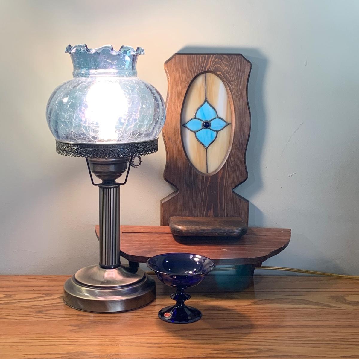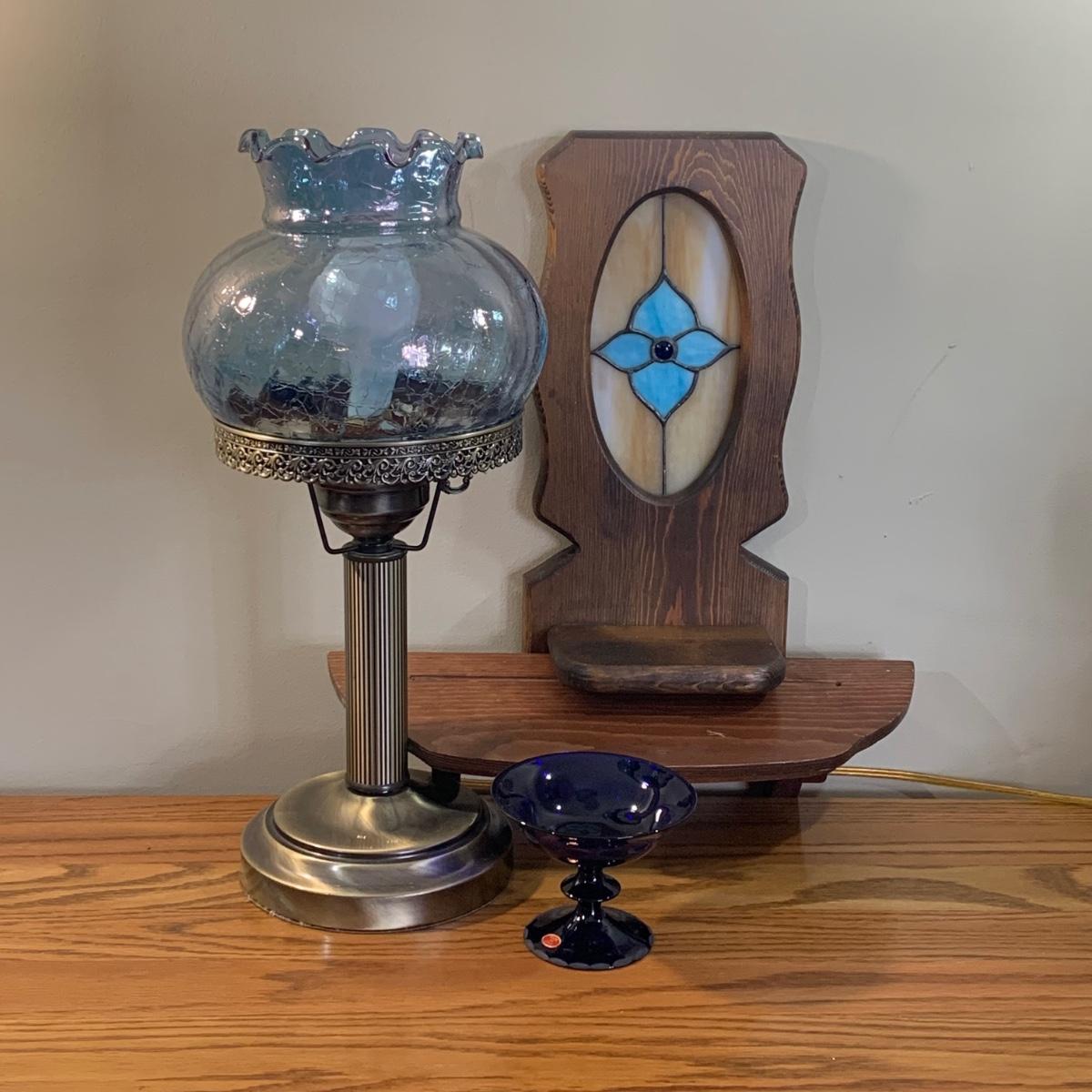 LOT 72R: Vintage Lamp w/Blue Crackle Glass Shade, Signed Cobalt Blue Compote Dish, Handcrafted Stained Glass Shelf