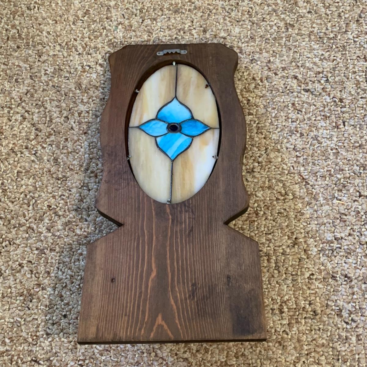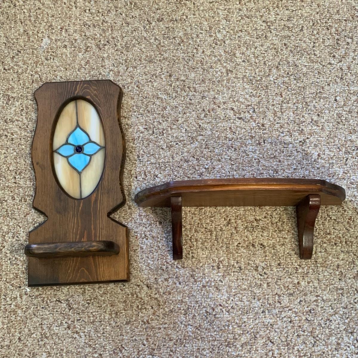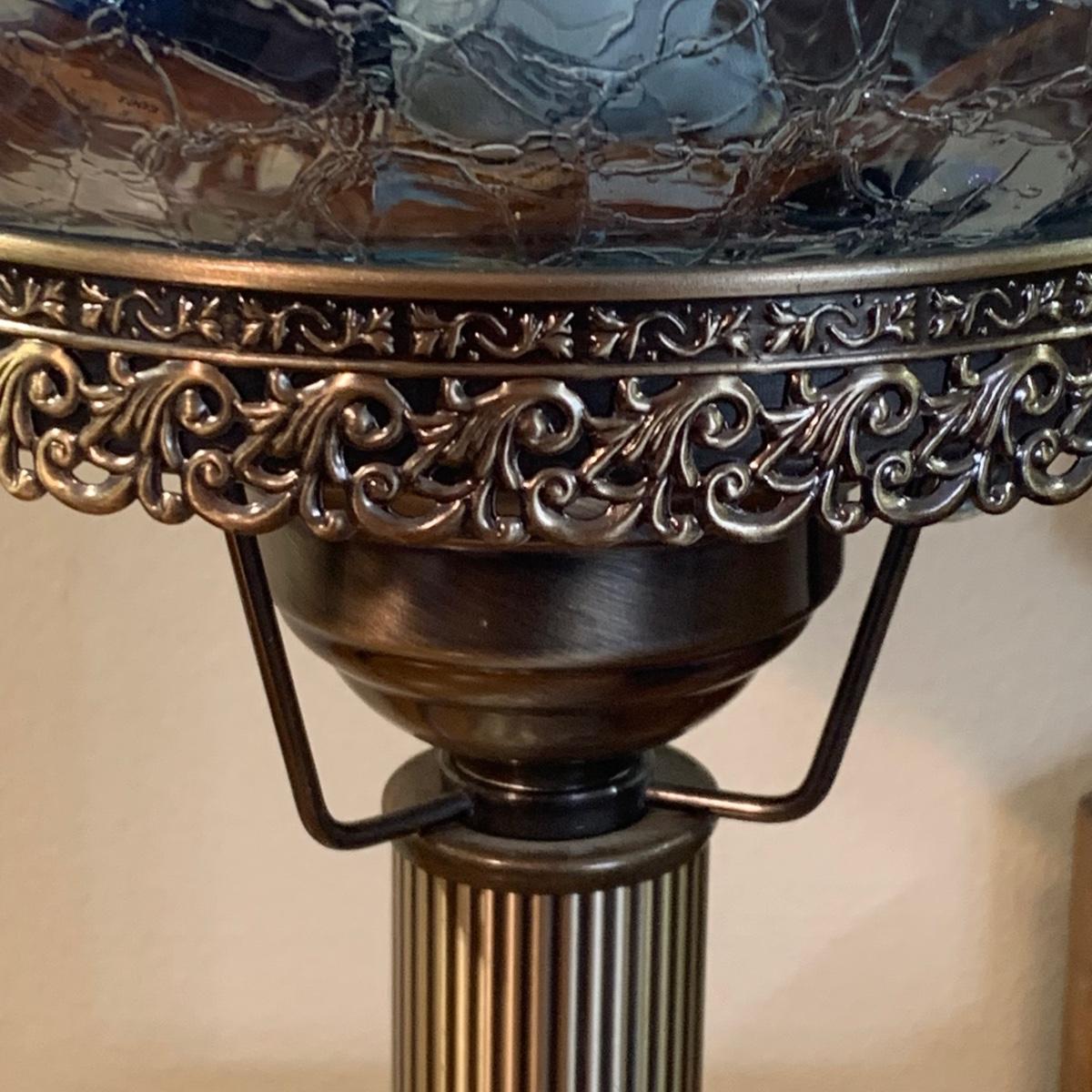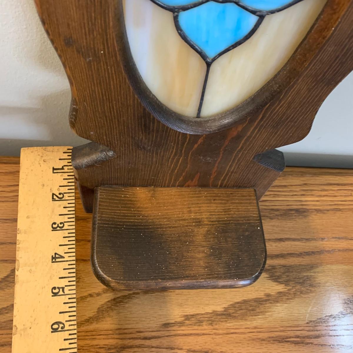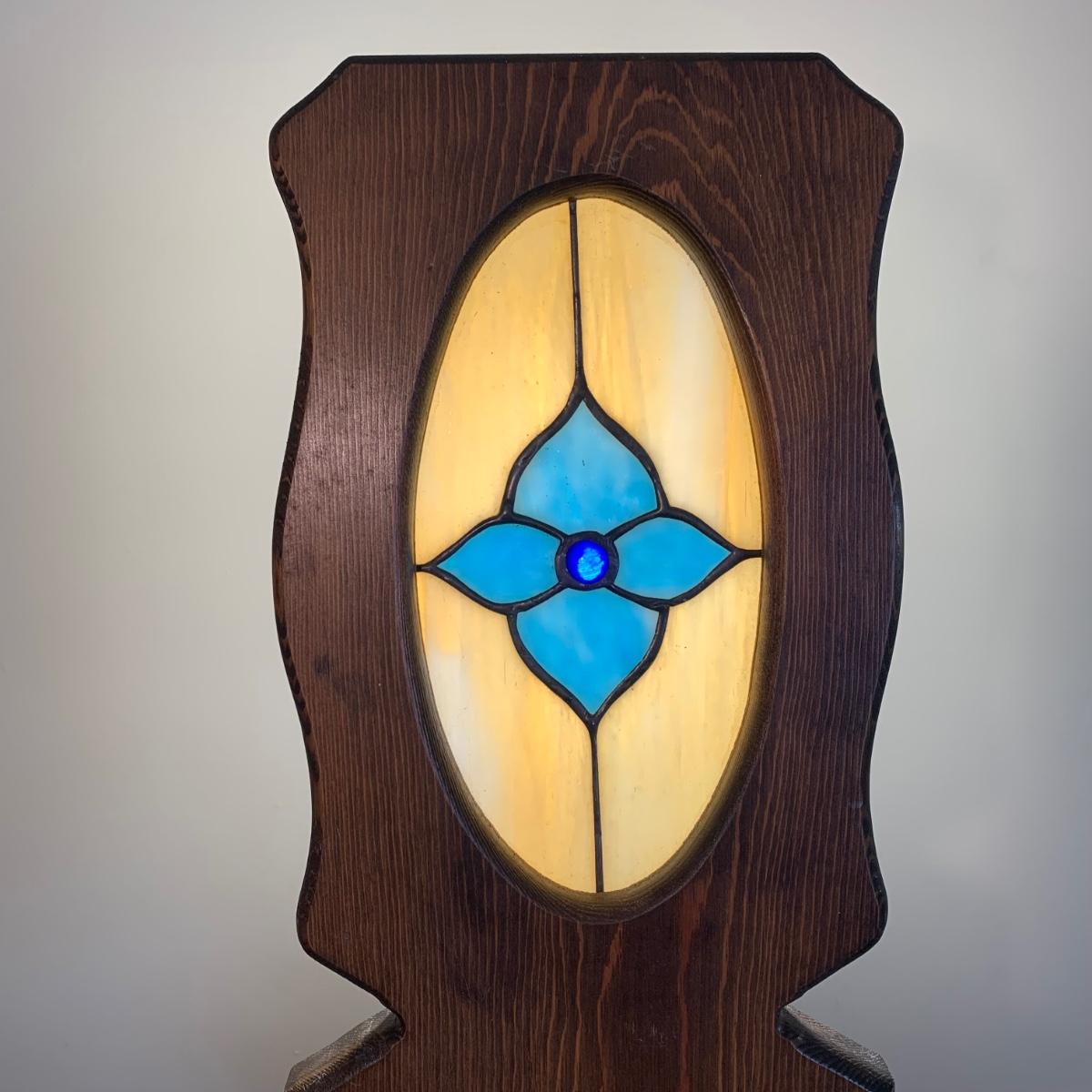 LOT 72R: Vintage Lamp w/Blue Crackle Glass Shade, Signed Cobalt Blue Compote Dish, Handcrafted Stained Glass Shelf