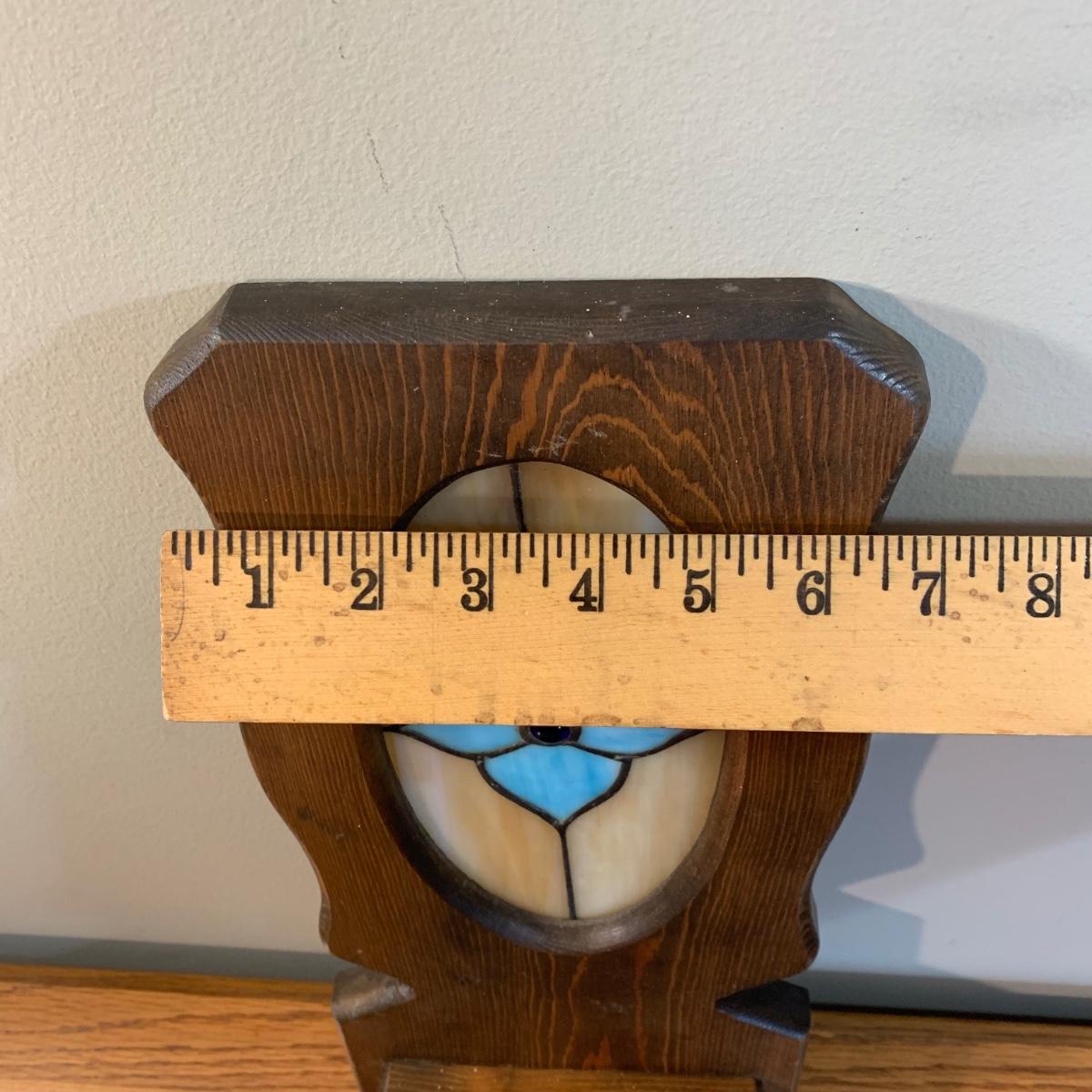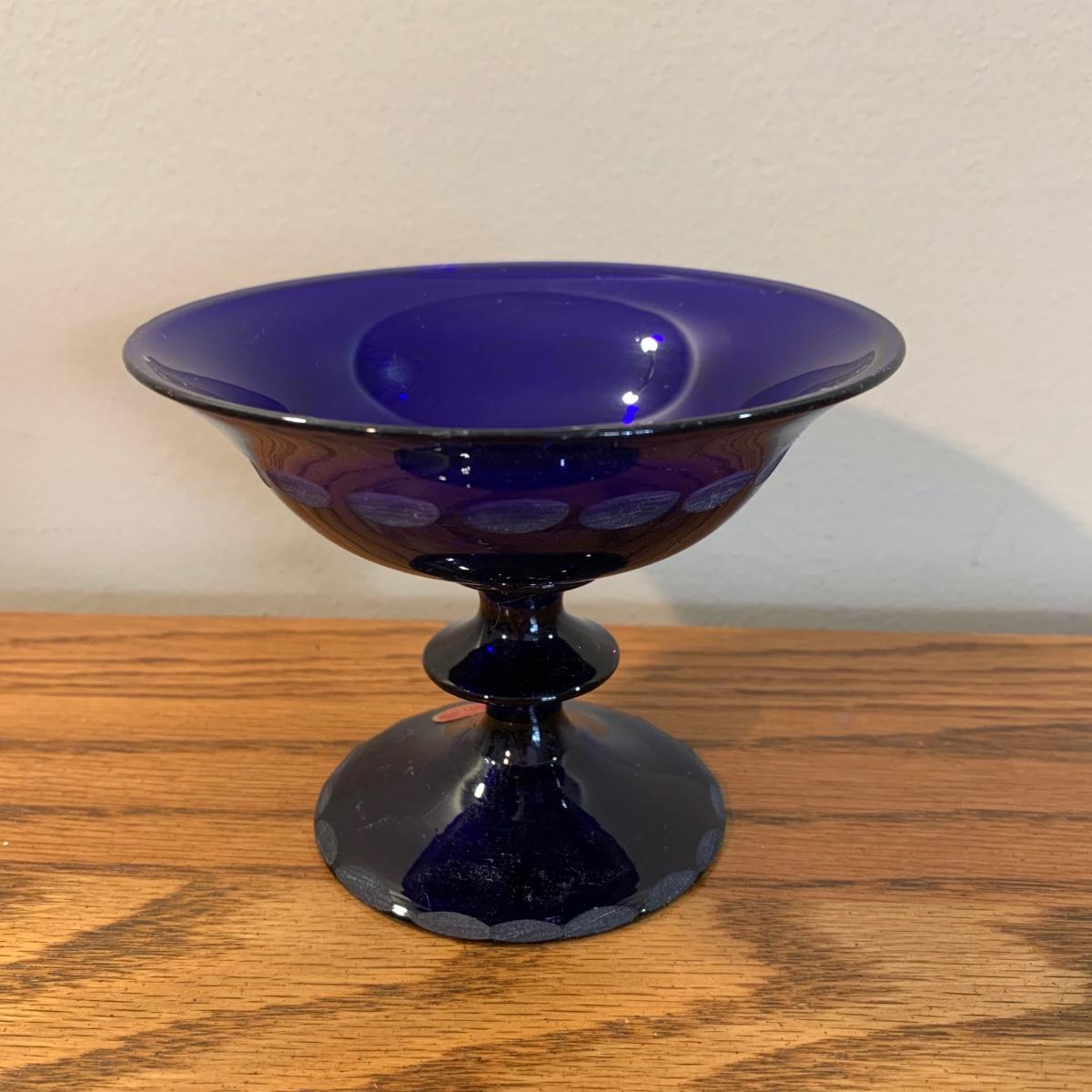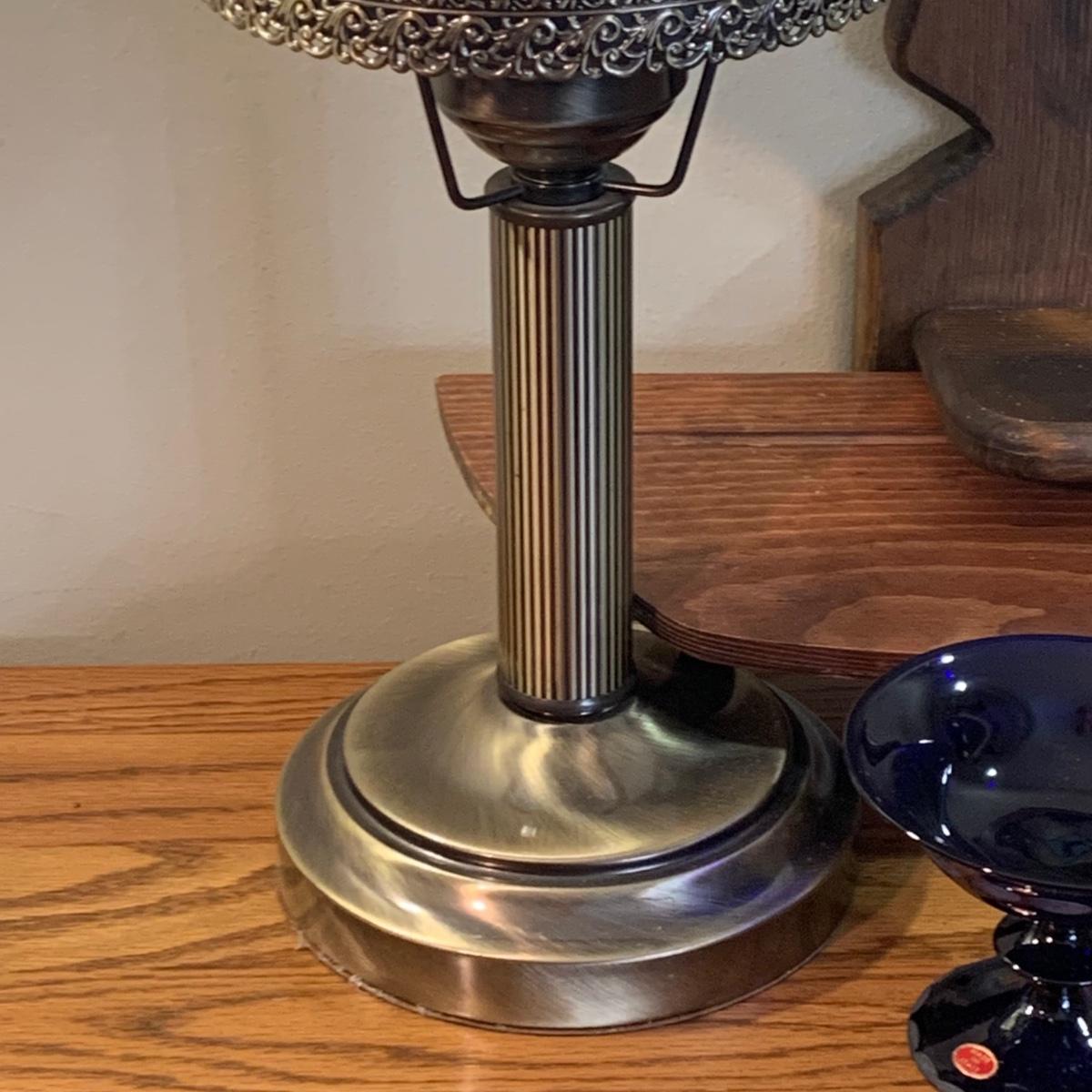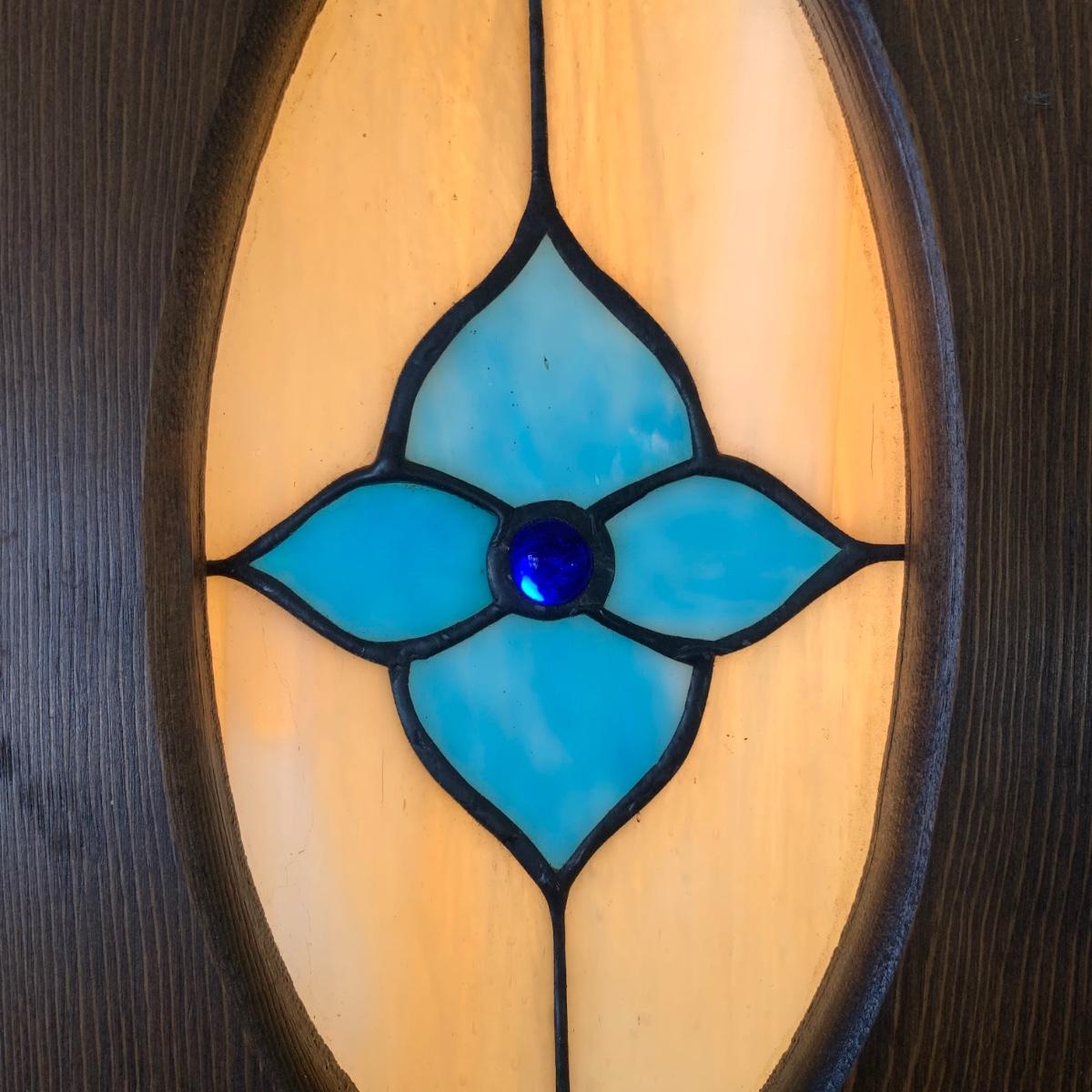 LOT 72R: Vintage Lamp w/Blue Crackle Glass Shade, Signed Cobalt Blue Compote Dish, Handcrafted Stained Glass Shelf