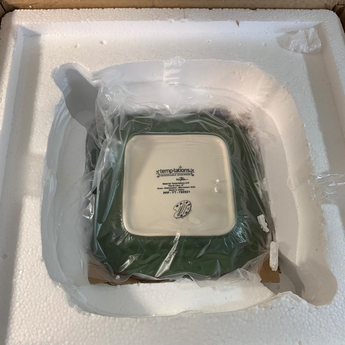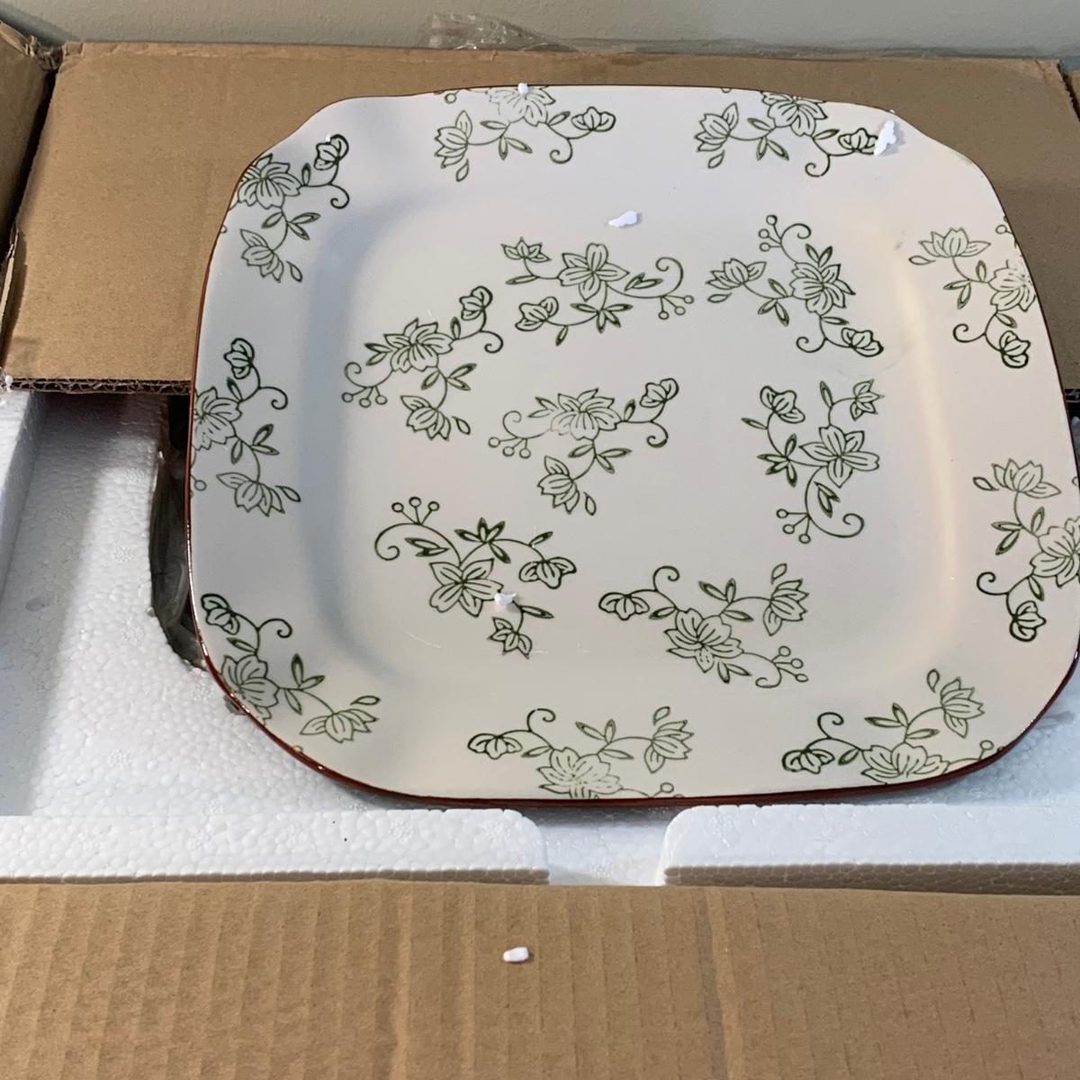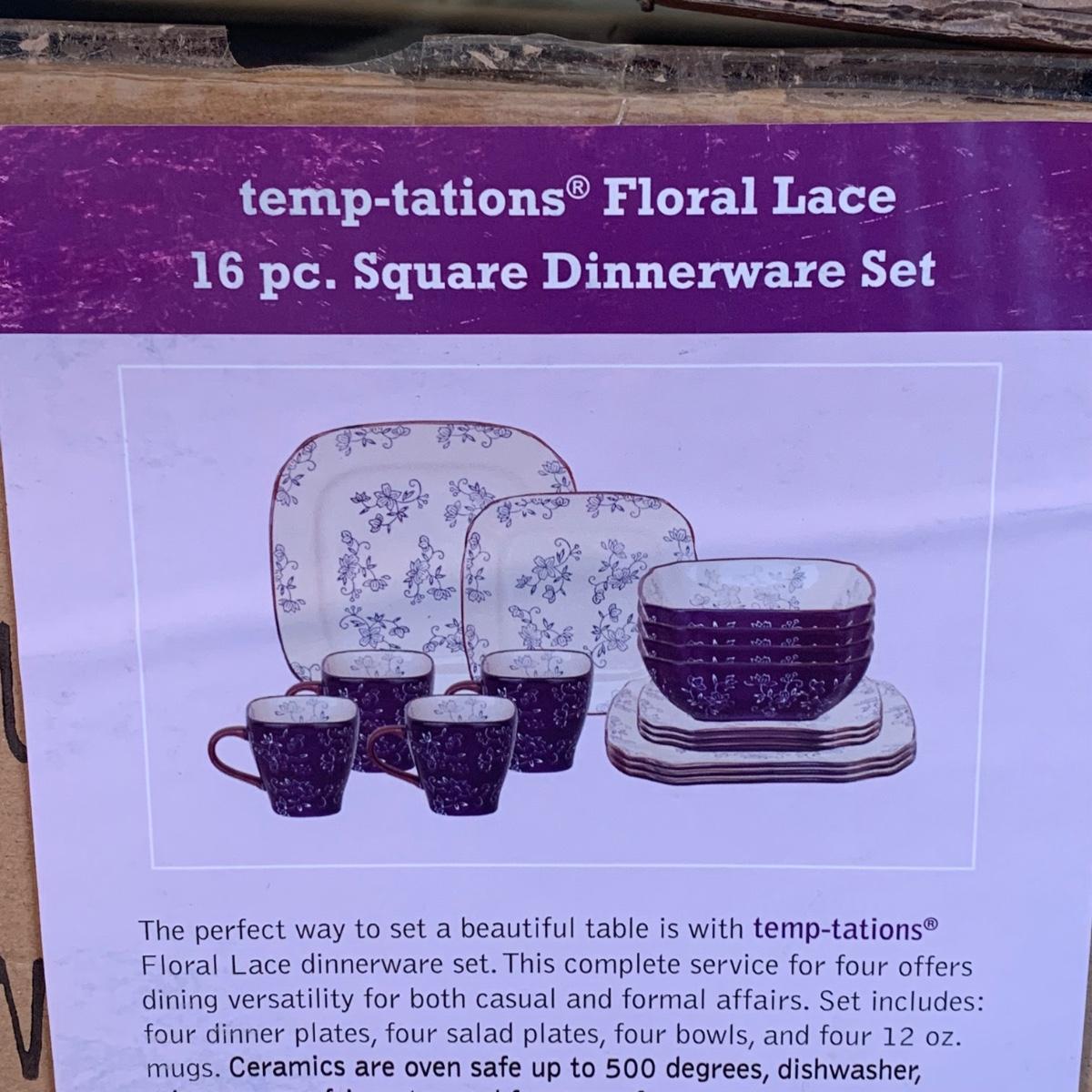 LOT 73R: New in Box Temp-tations Green Floral Lace 16pc. Square Dinnerware Set