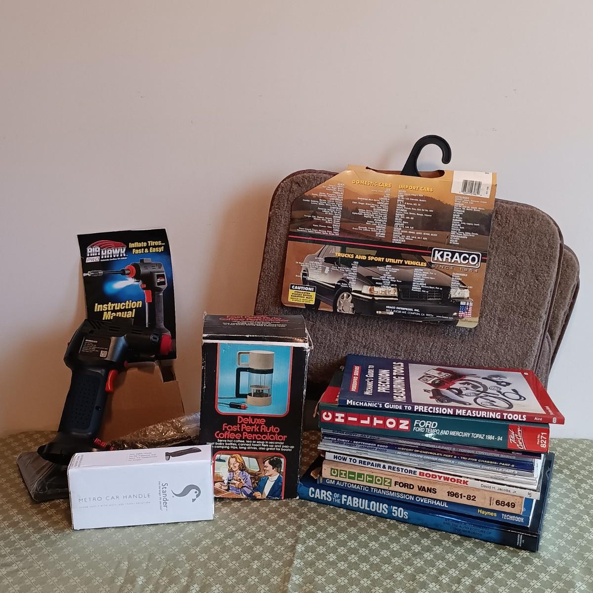 LOT 121: Automotive Collection: Air Hawk Pro Tire Inflator, Vehicle Mats, Vintage Auto Coffee Percolator & More