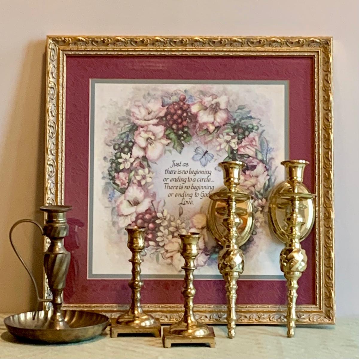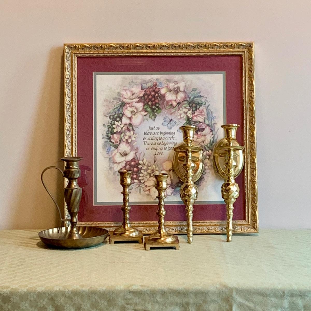 LOT 139R: Home Interiors Print, Brass Candlesticks & Sconces