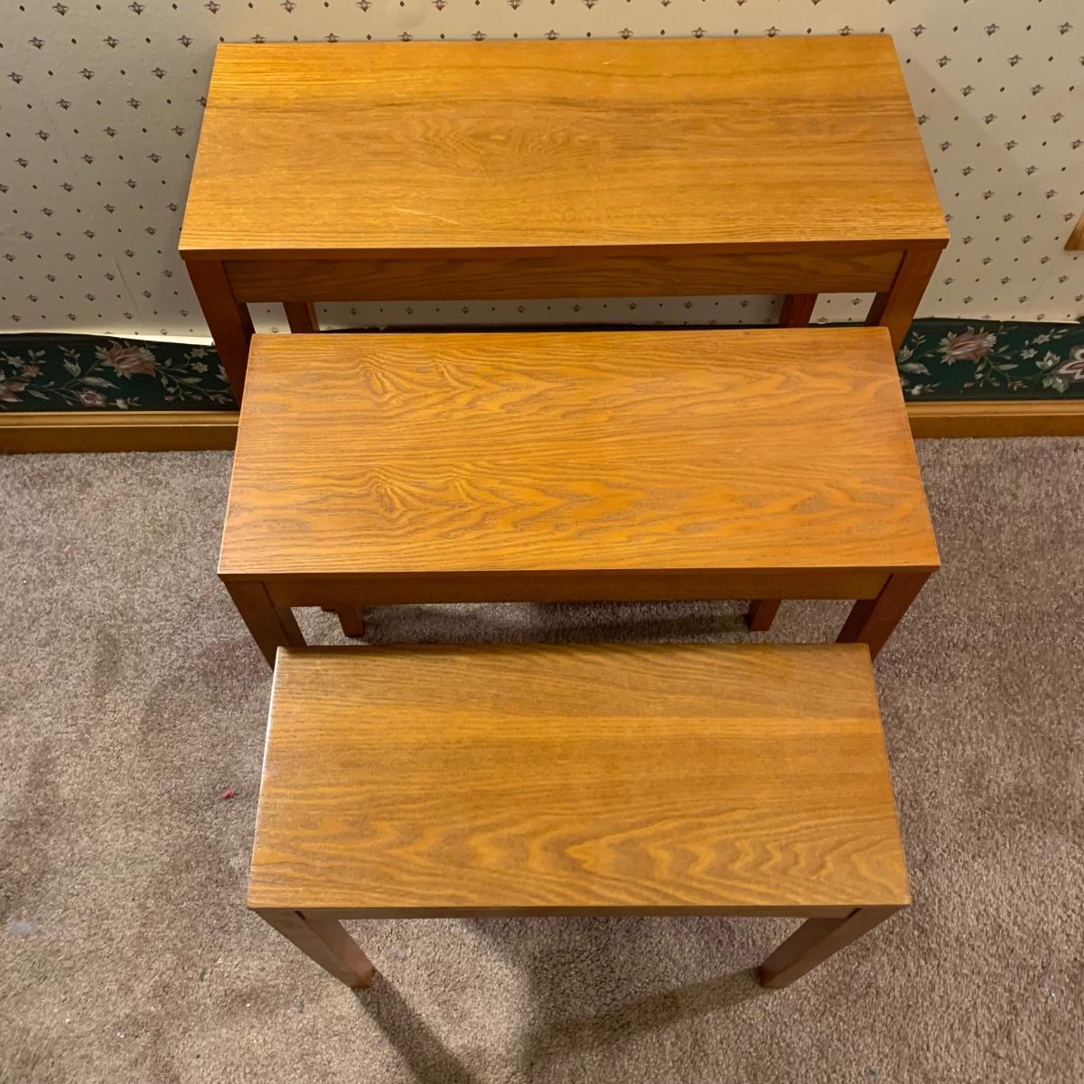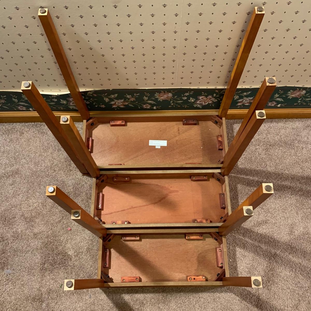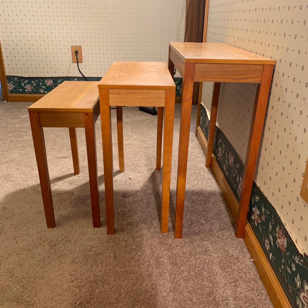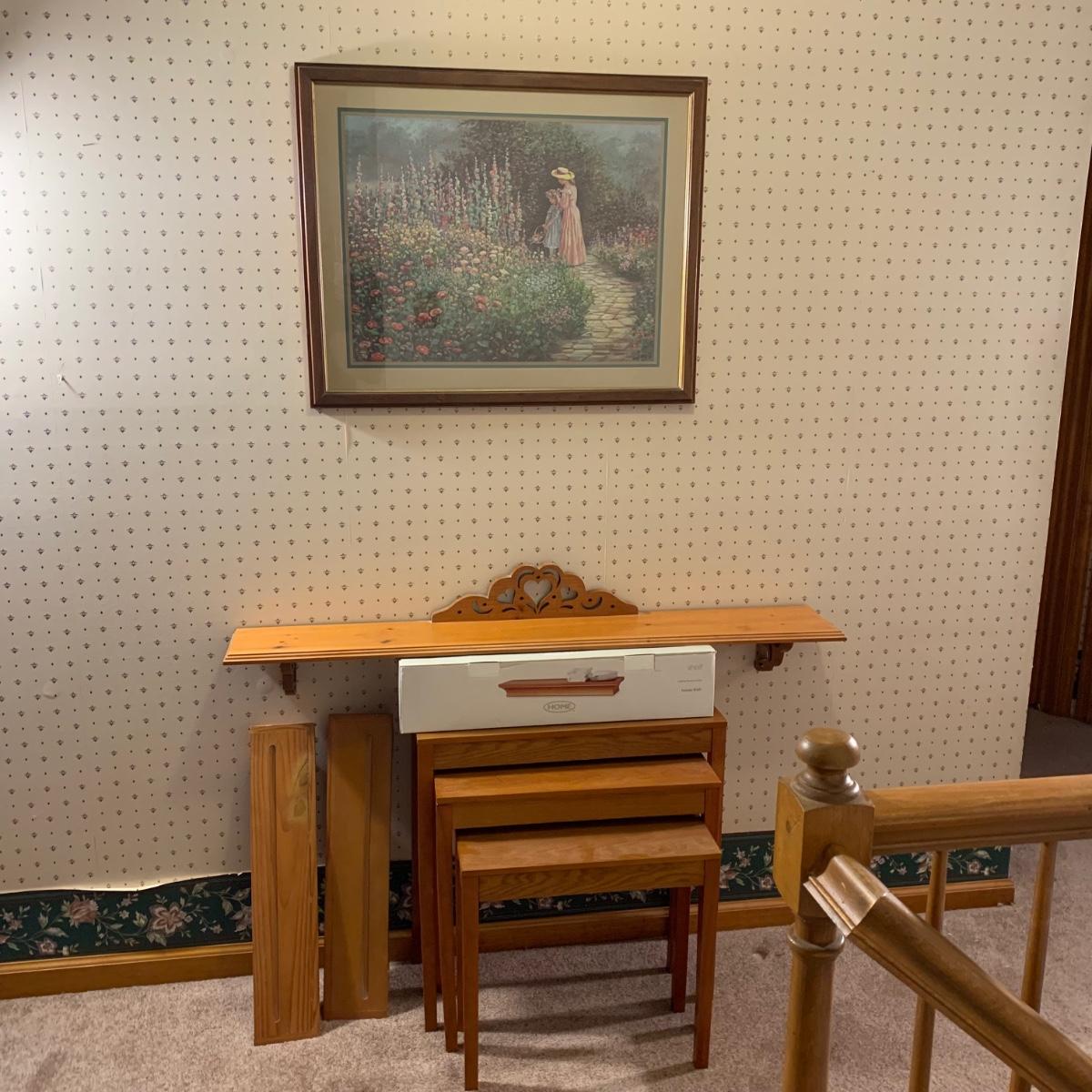 LOT 153R: Nesting Accent Tables, Picking Flowers Print, Cut-Out Shelf & 4 Honey Finish Shelves (2-new in box)