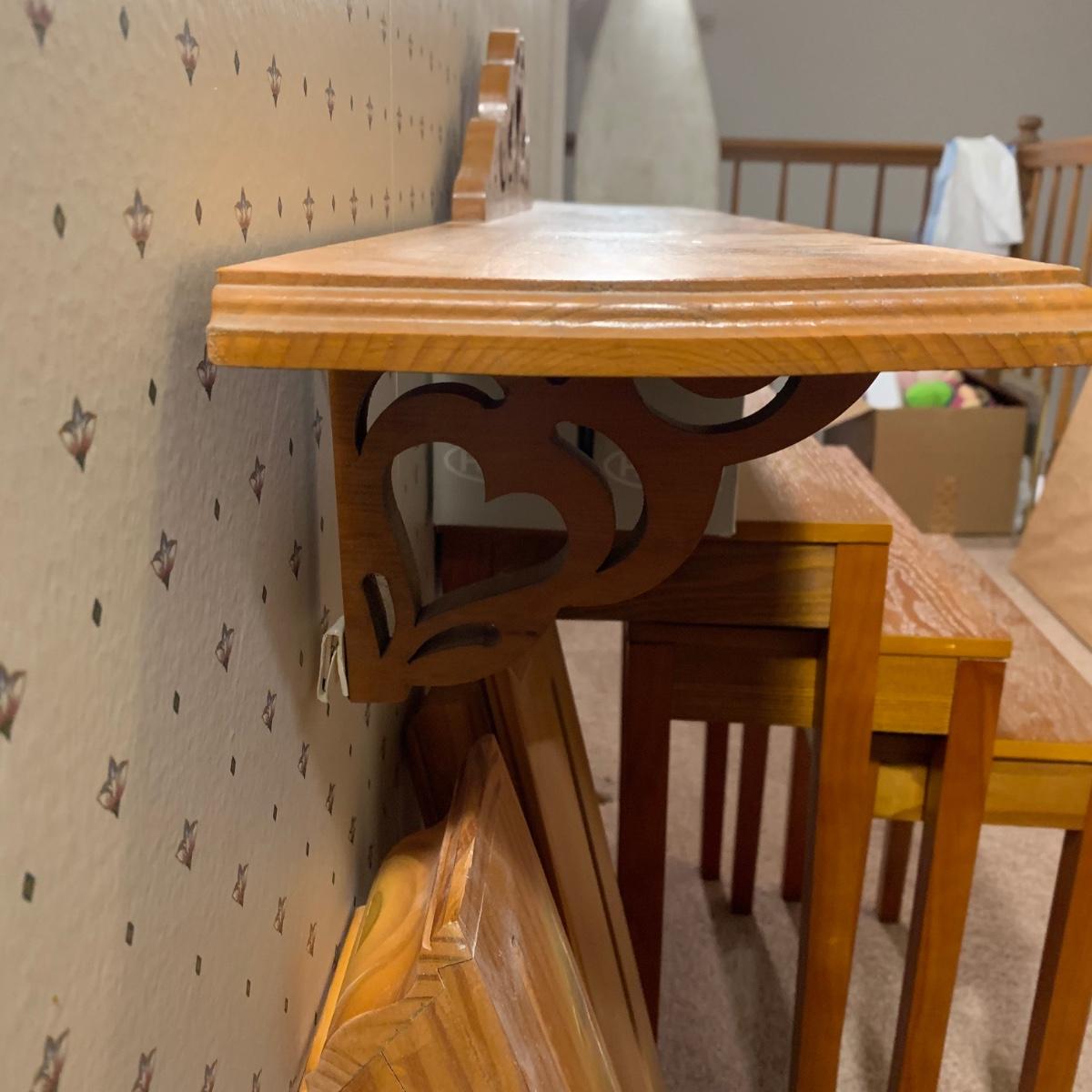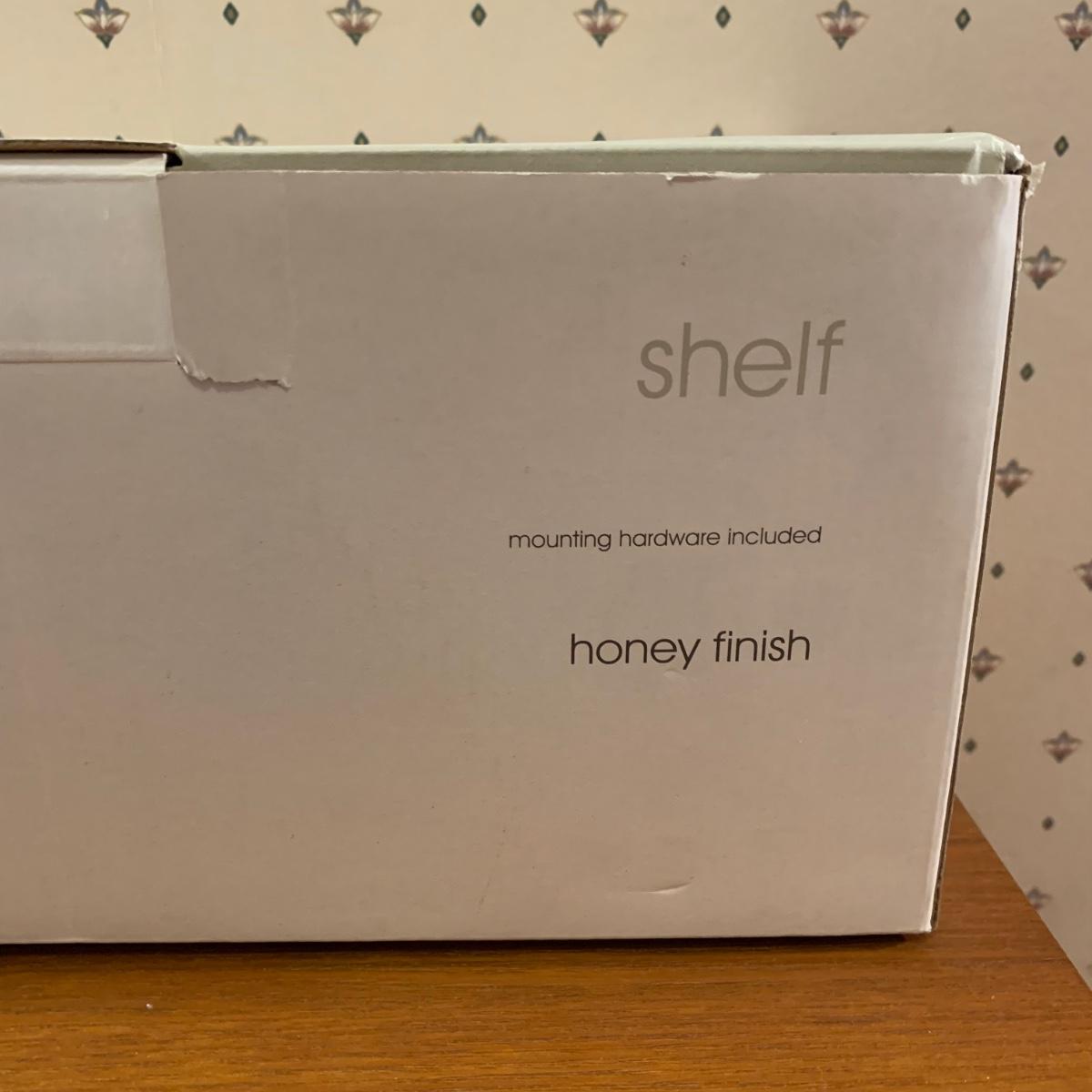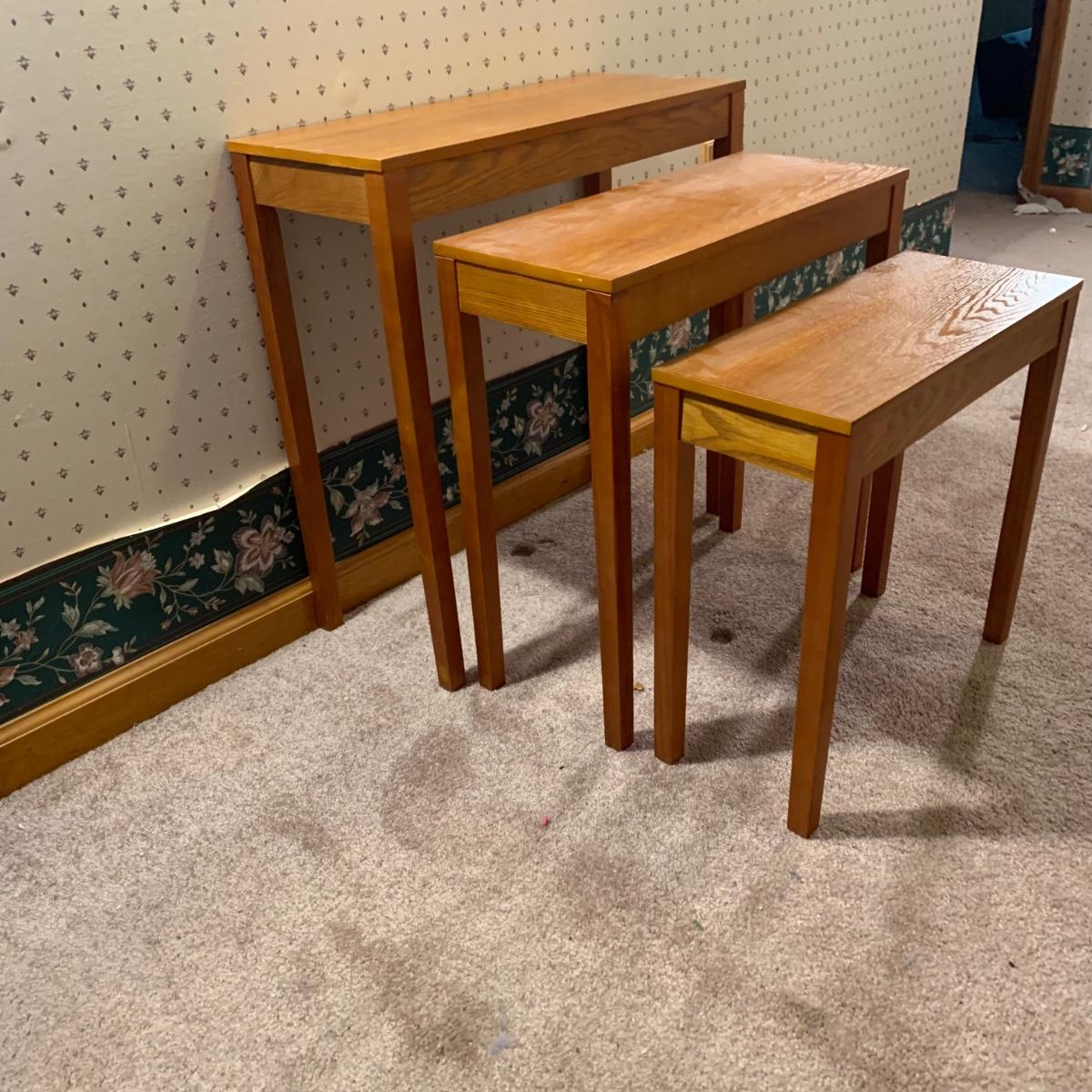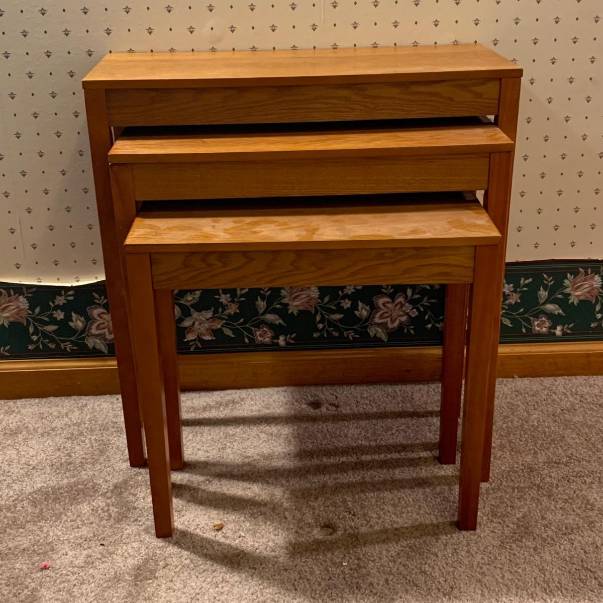LOT 153R: Nesting Accent Tables, Picking Flowers Print, Cut-Out Shelf & 4 Honey Finish Shelves (2-new in box)