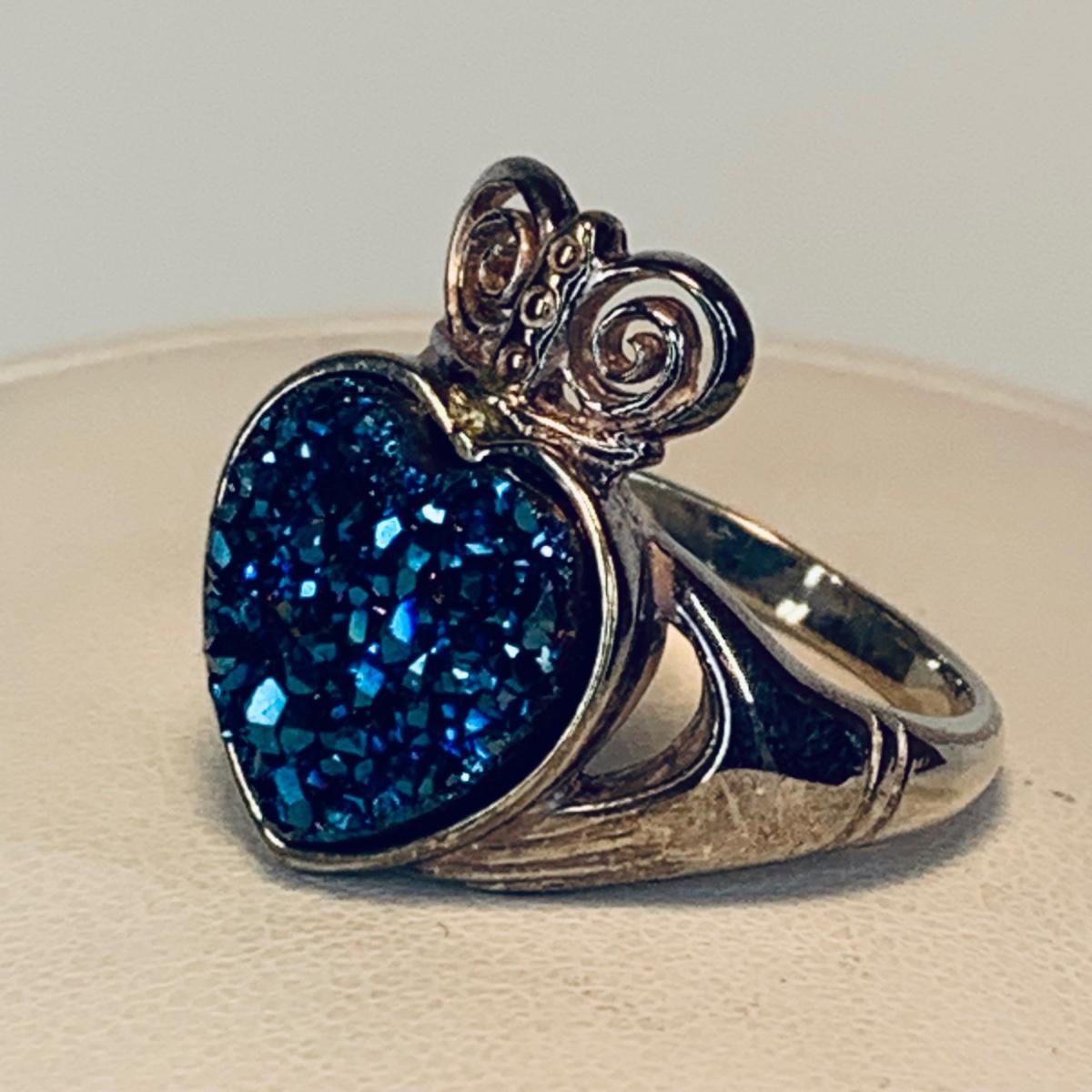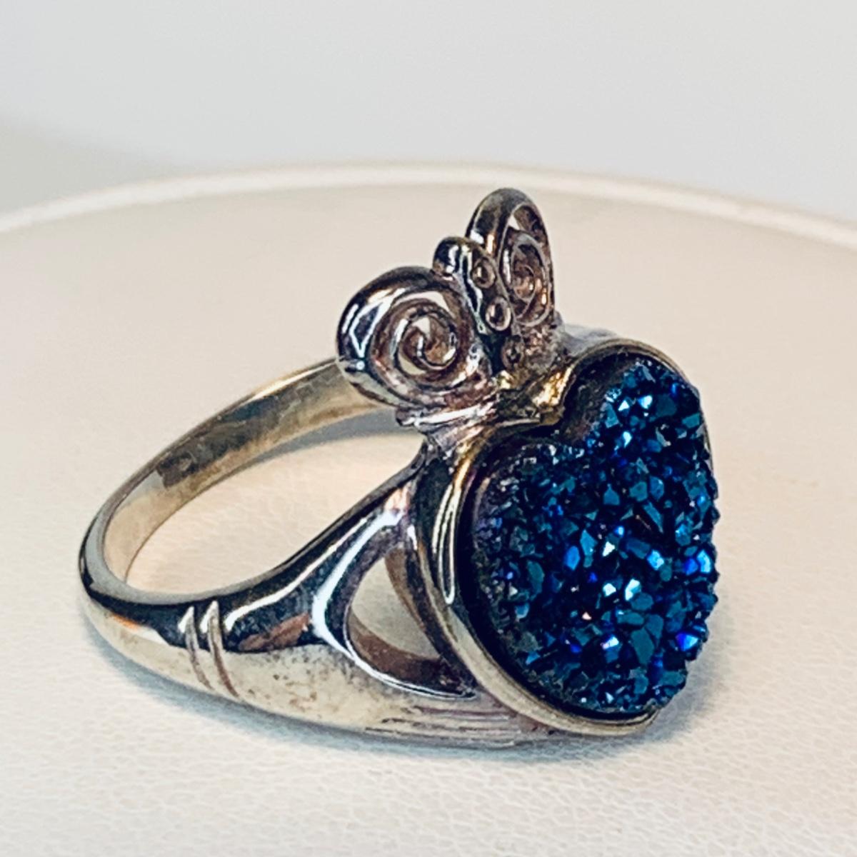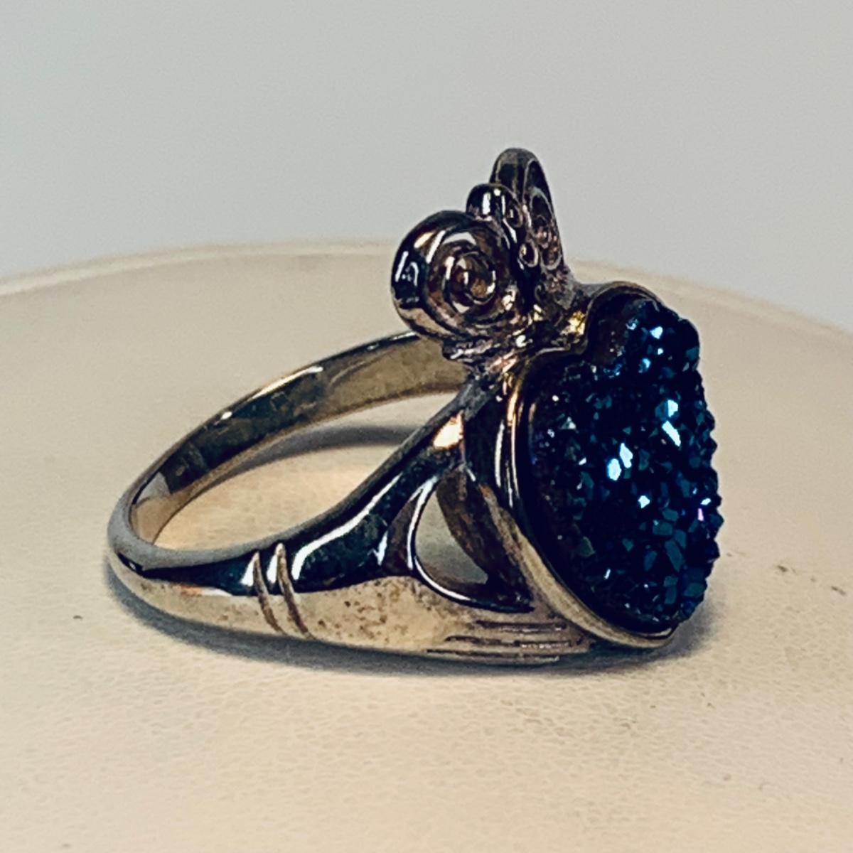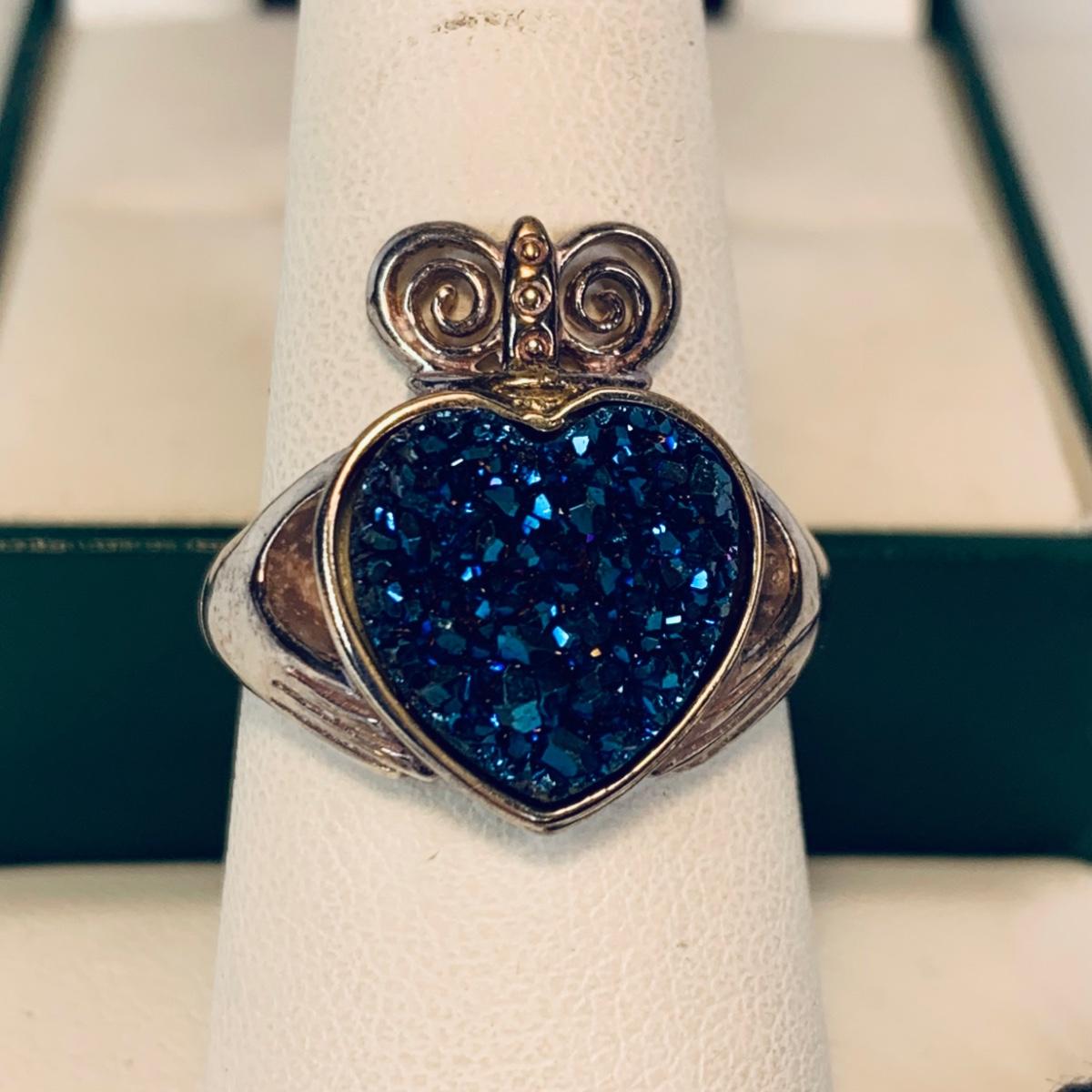 LOT 209R:Sterling Silver Drusy Blue Claddagh Ring Ireland, JCM Braided CZ & Sterling Silver Bracelet, Sterling Silver (925) Hoop Earrings, Peru