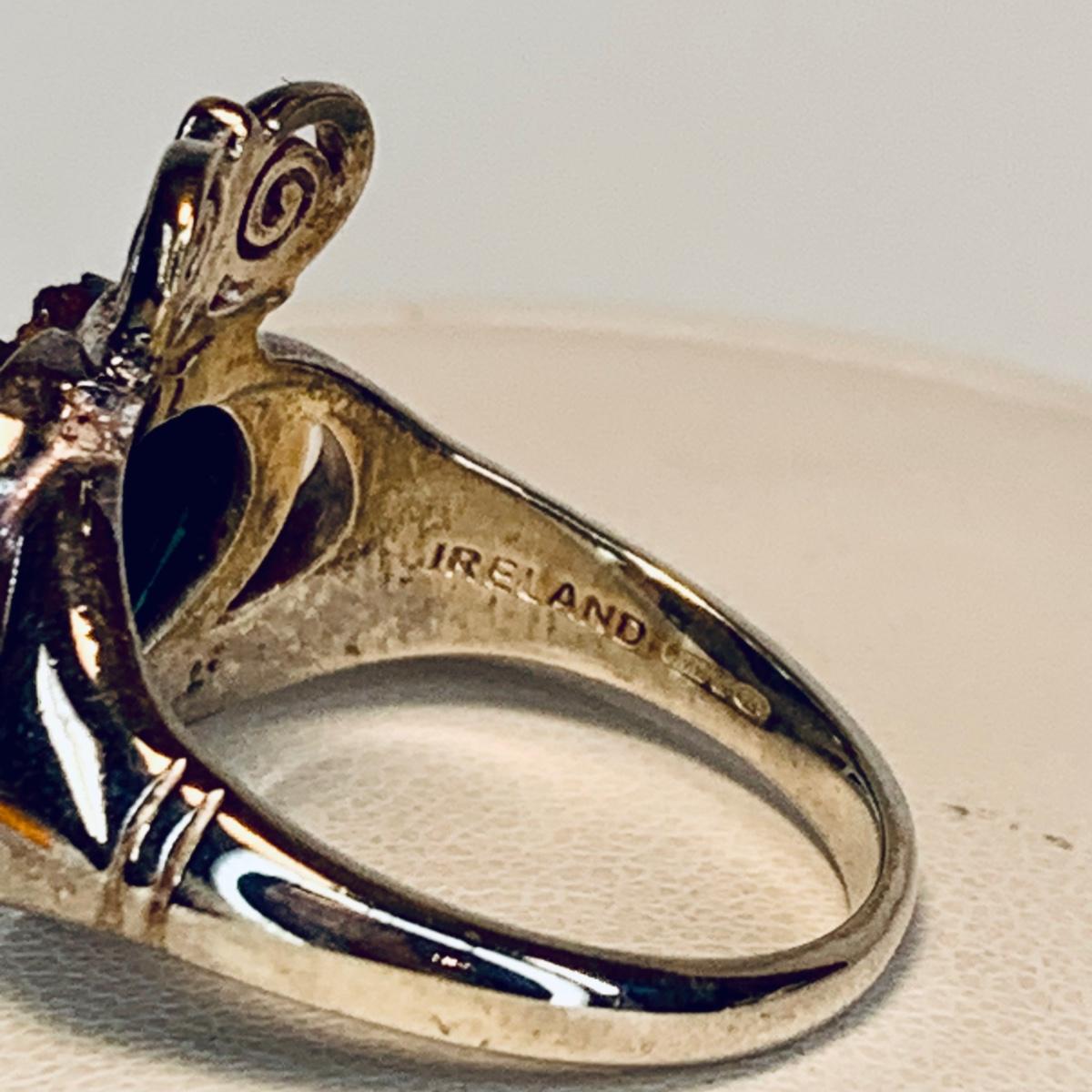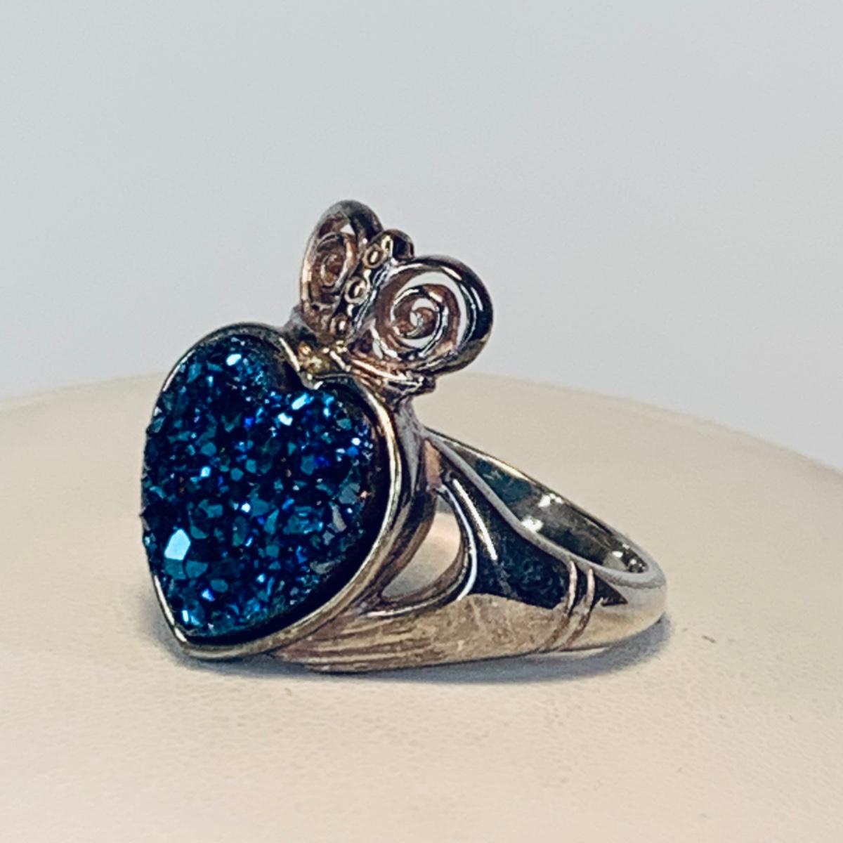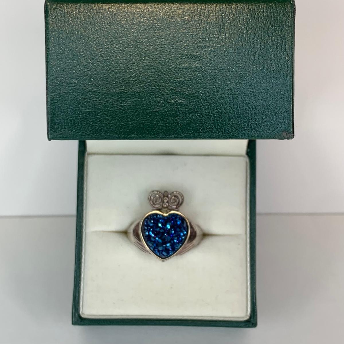 LOT 209R:Sterling Silver Drusy Blue Claddagh Ring Ireland, JCM Braided CZ & Sterling Silver Bracelet, Sterling Silver (925) Hoop Earrings, Peru