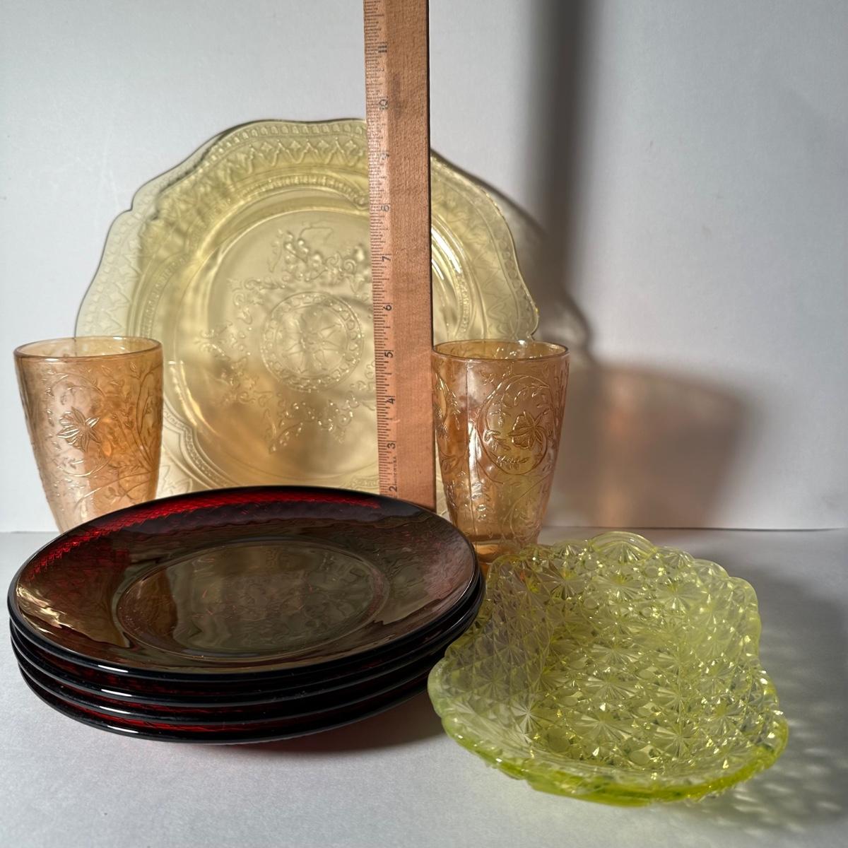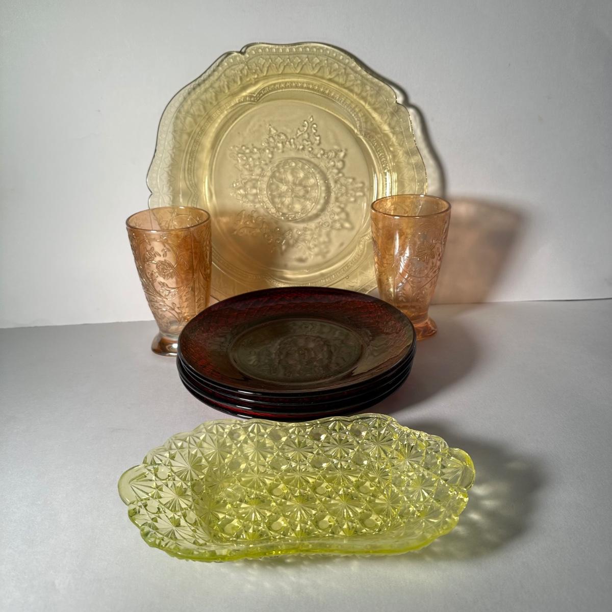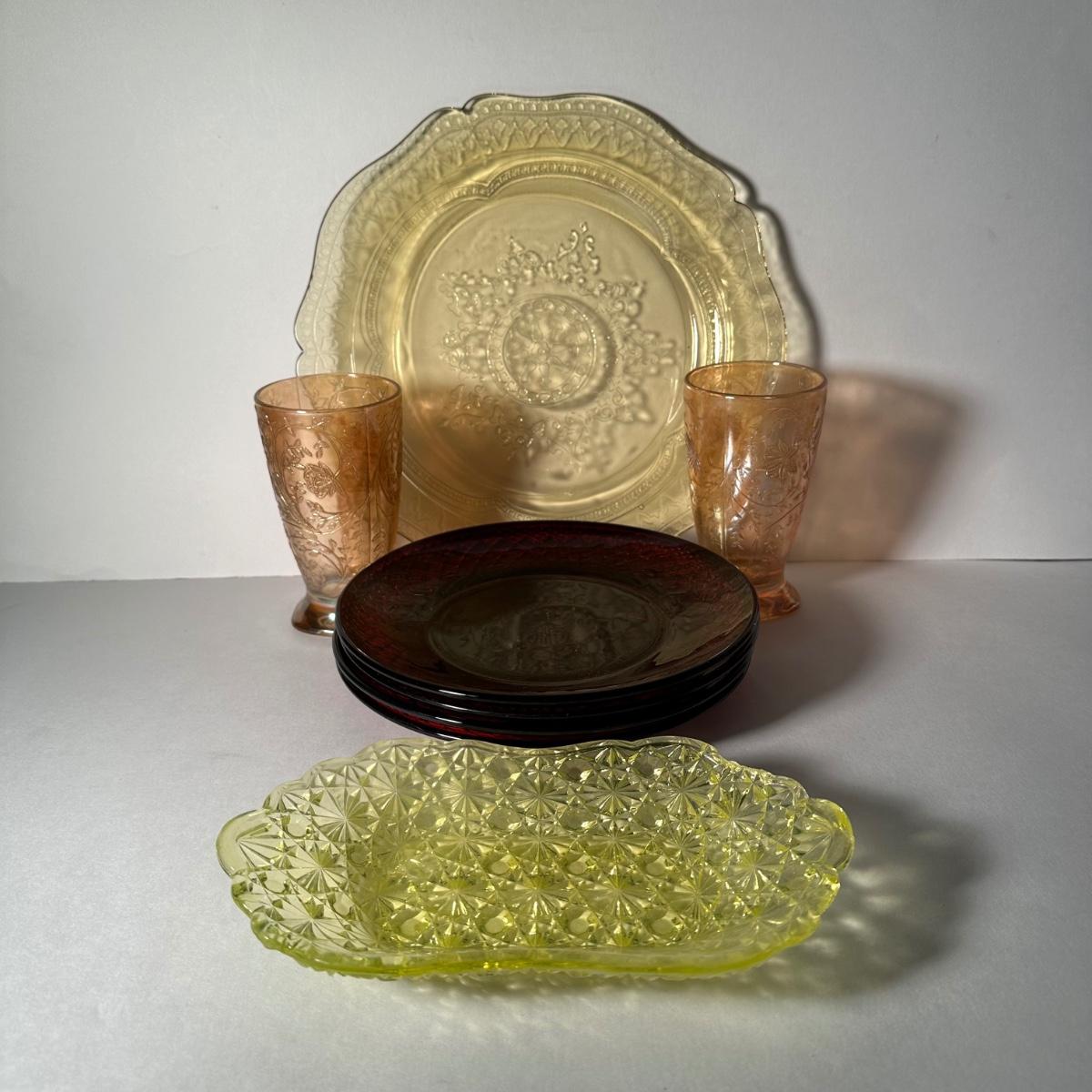 LOT 19F: Vintage Colored Depression Glass Collection - Salad Plates, Floral Glasses & More
