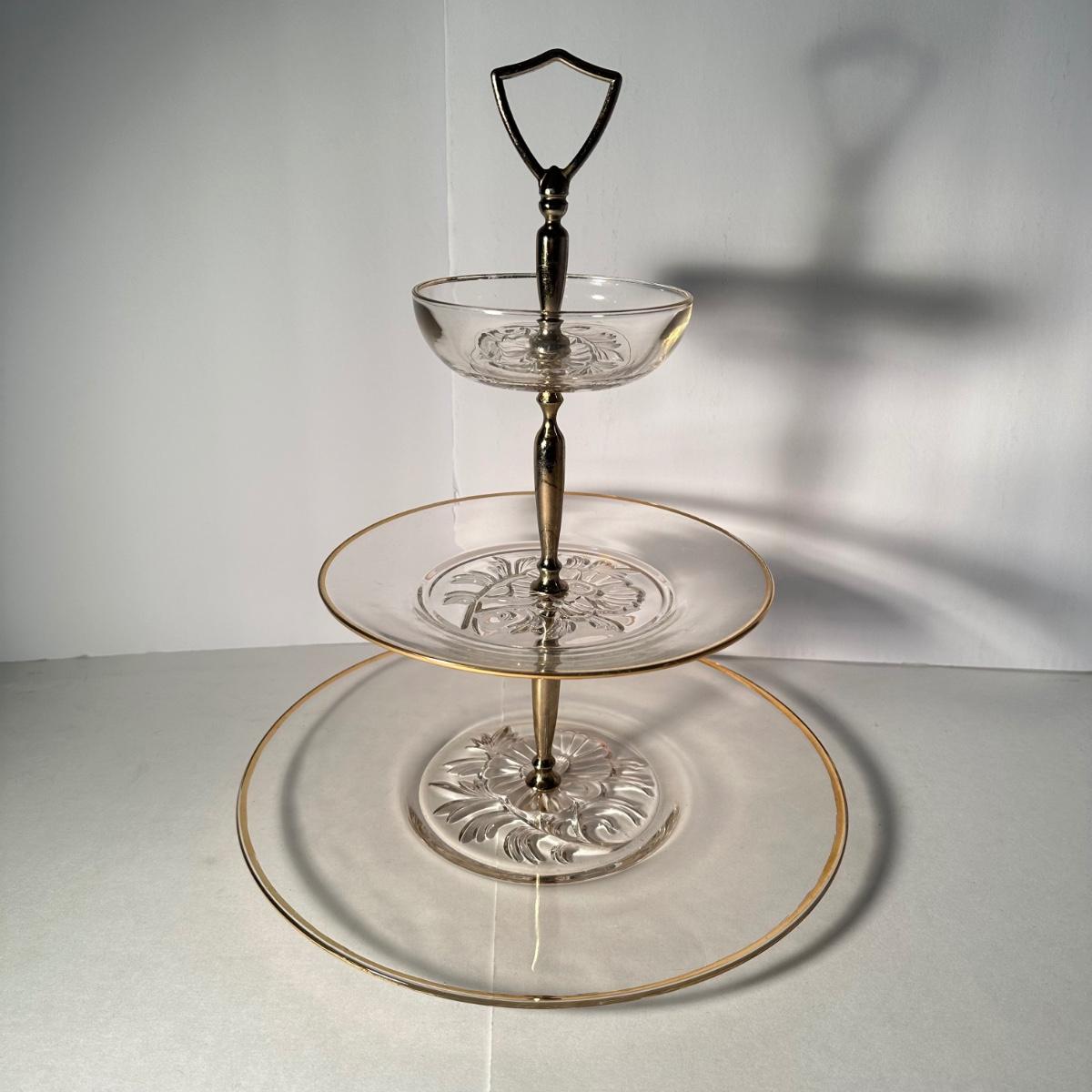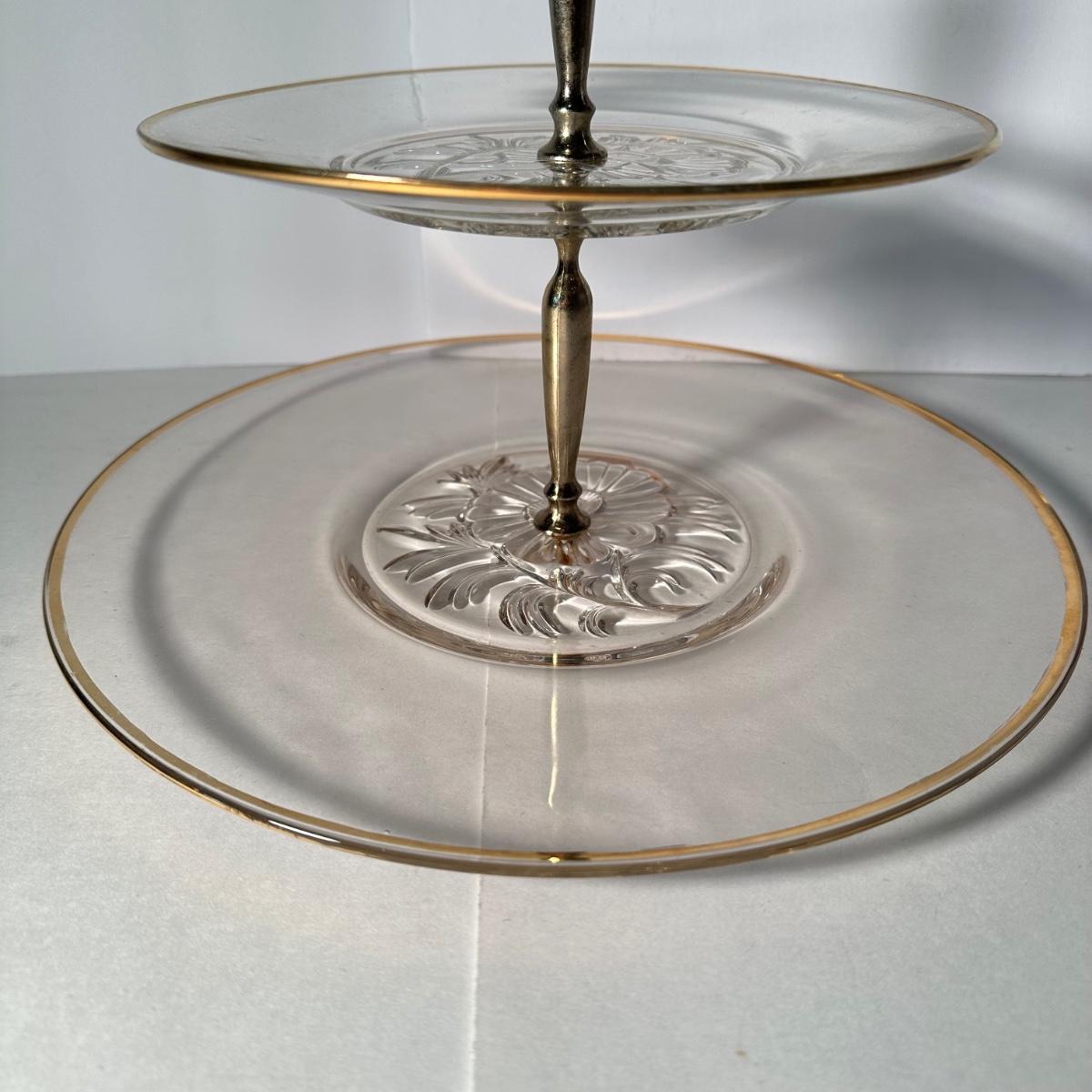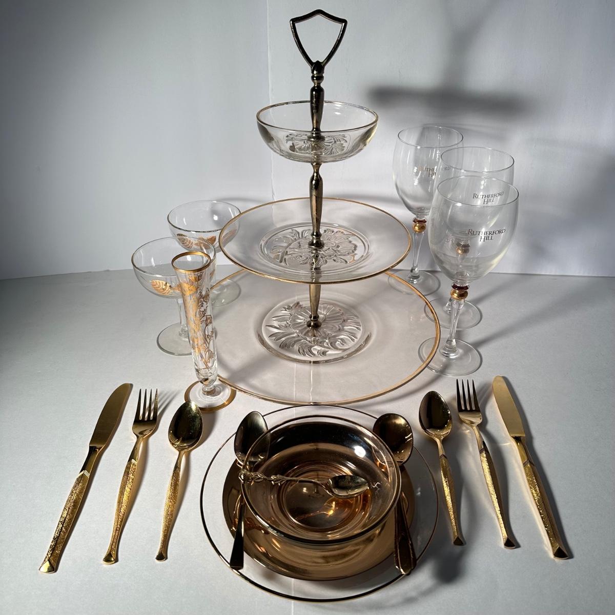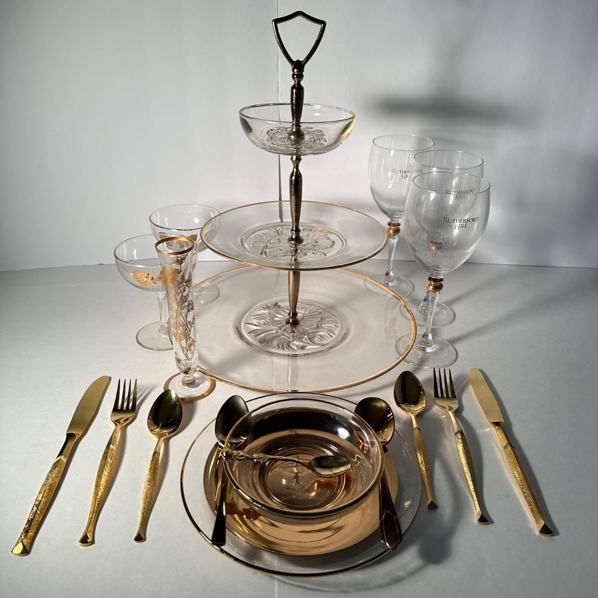 LOT 35L: Gold Rimed Crystal 3 Tier Serving Tray w/ Gold Leaf Champagne Glass, Vase, Silverware & More