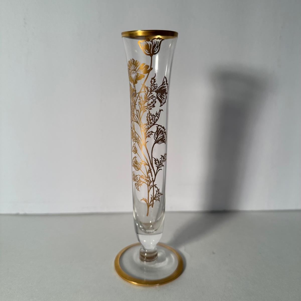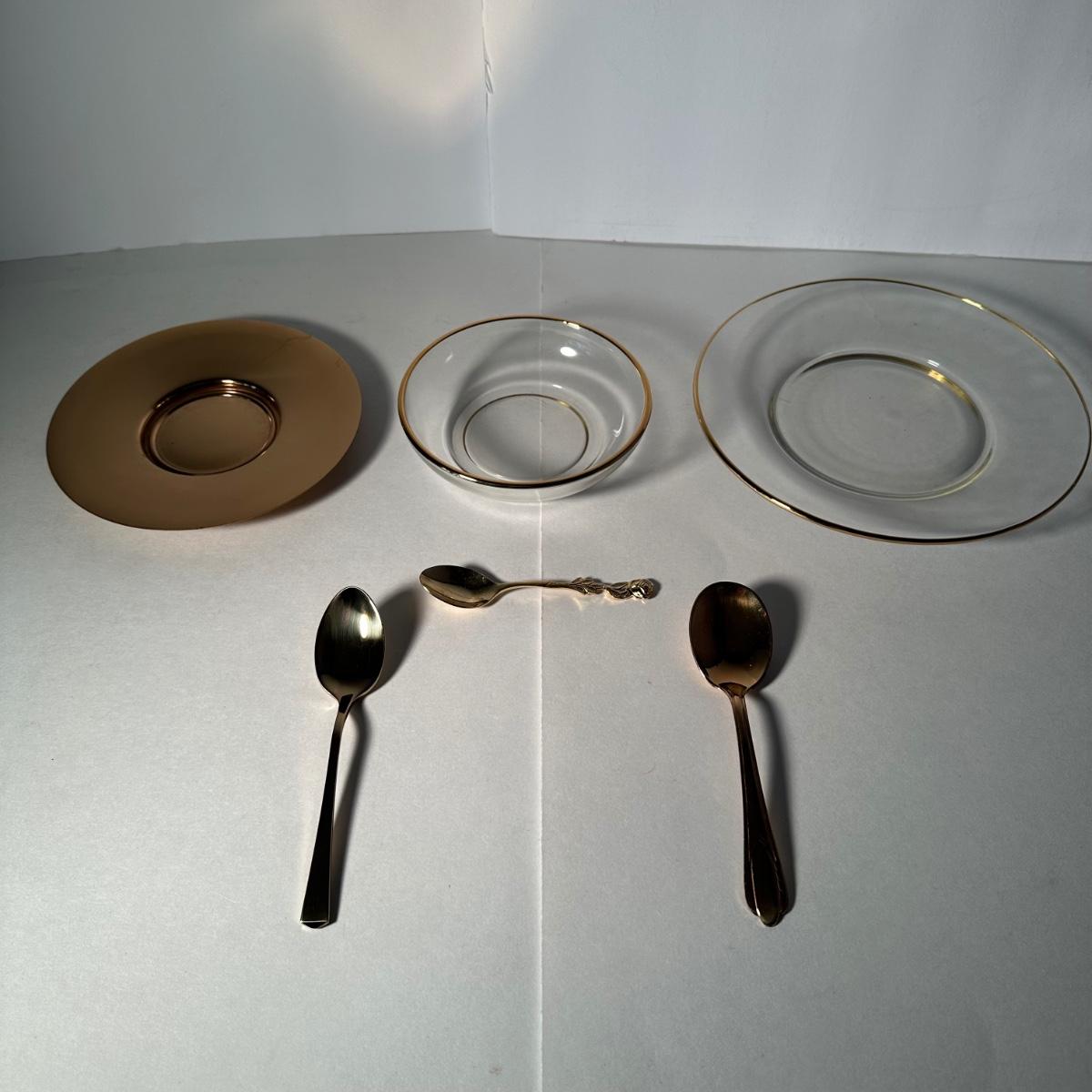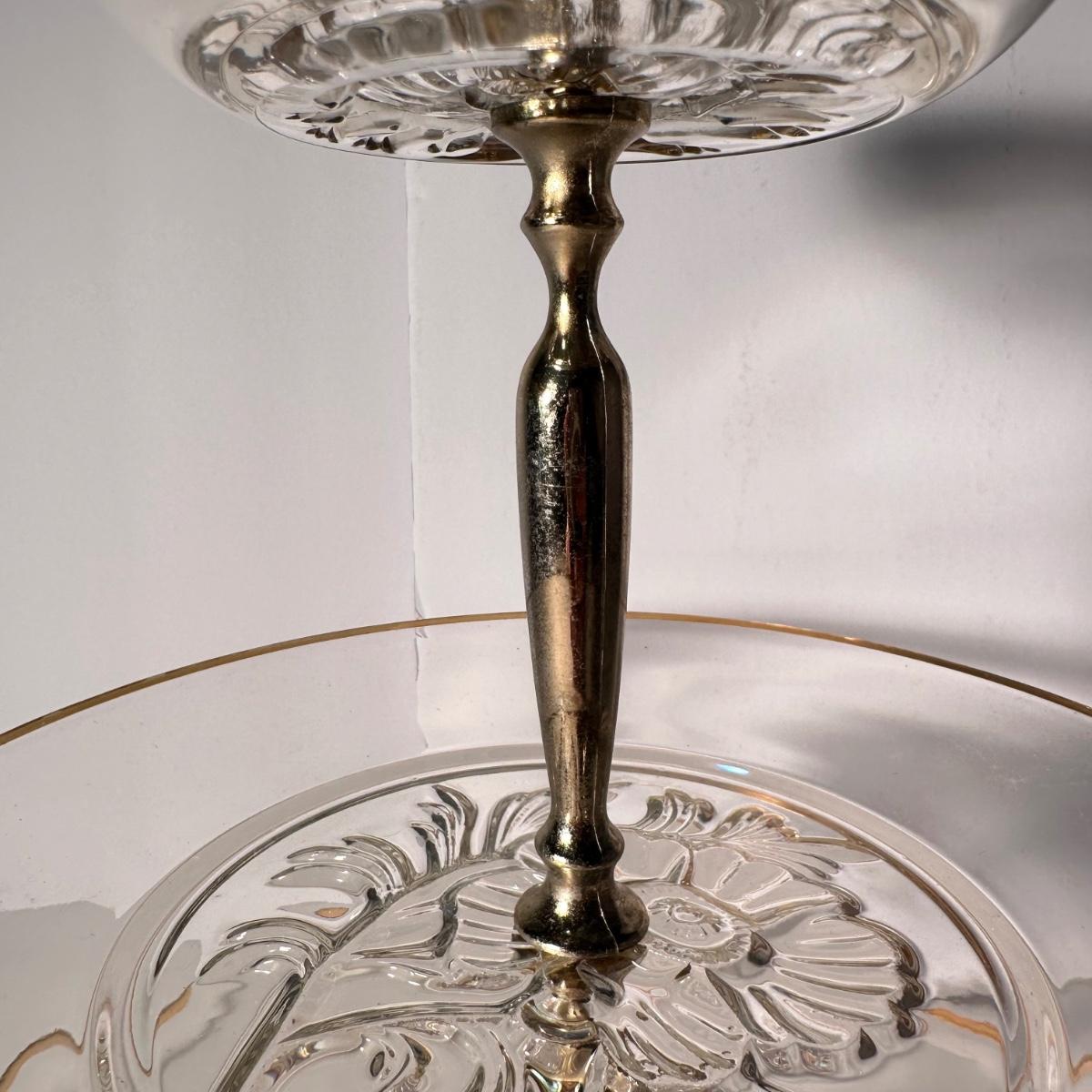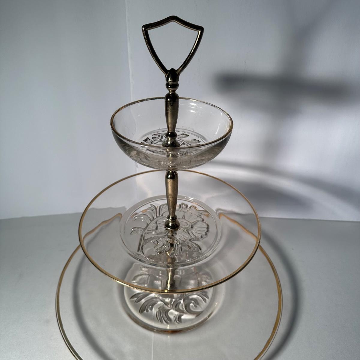 LOT 35L: Gold Rimed Crystal 3 Tier Serving Tray w/ Gold Leaf Champagne Glass, Vase, Silverware & More