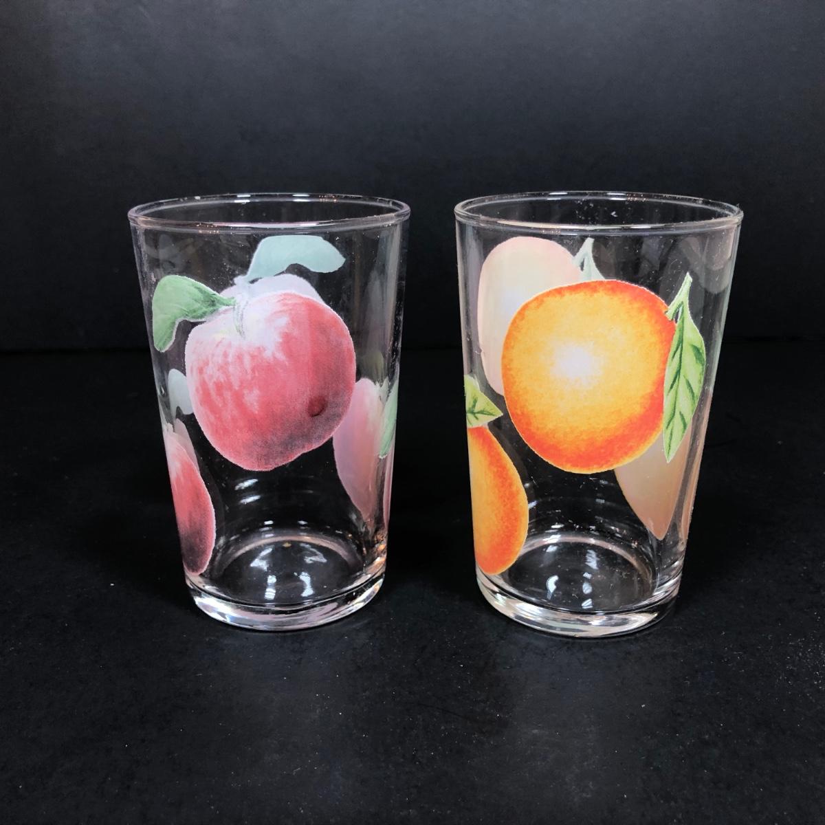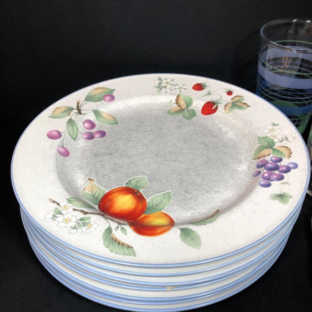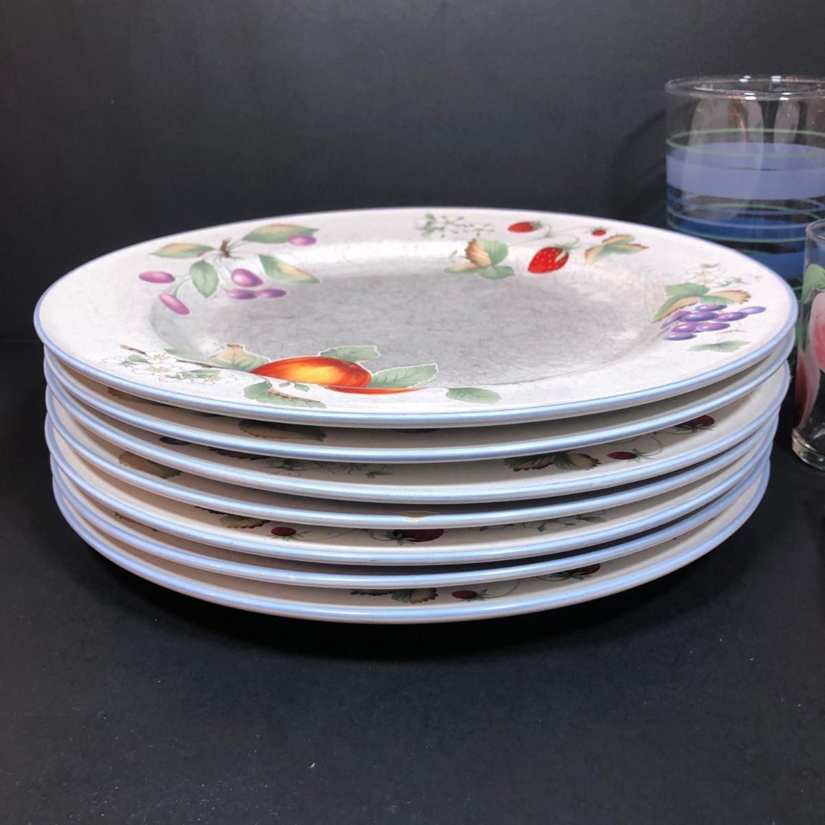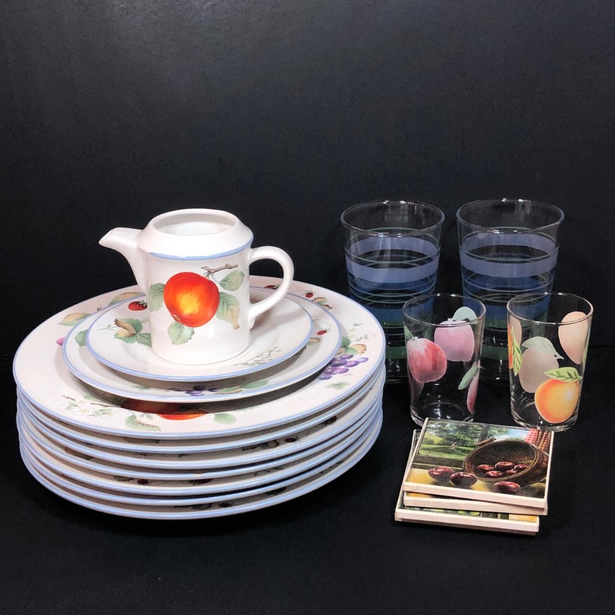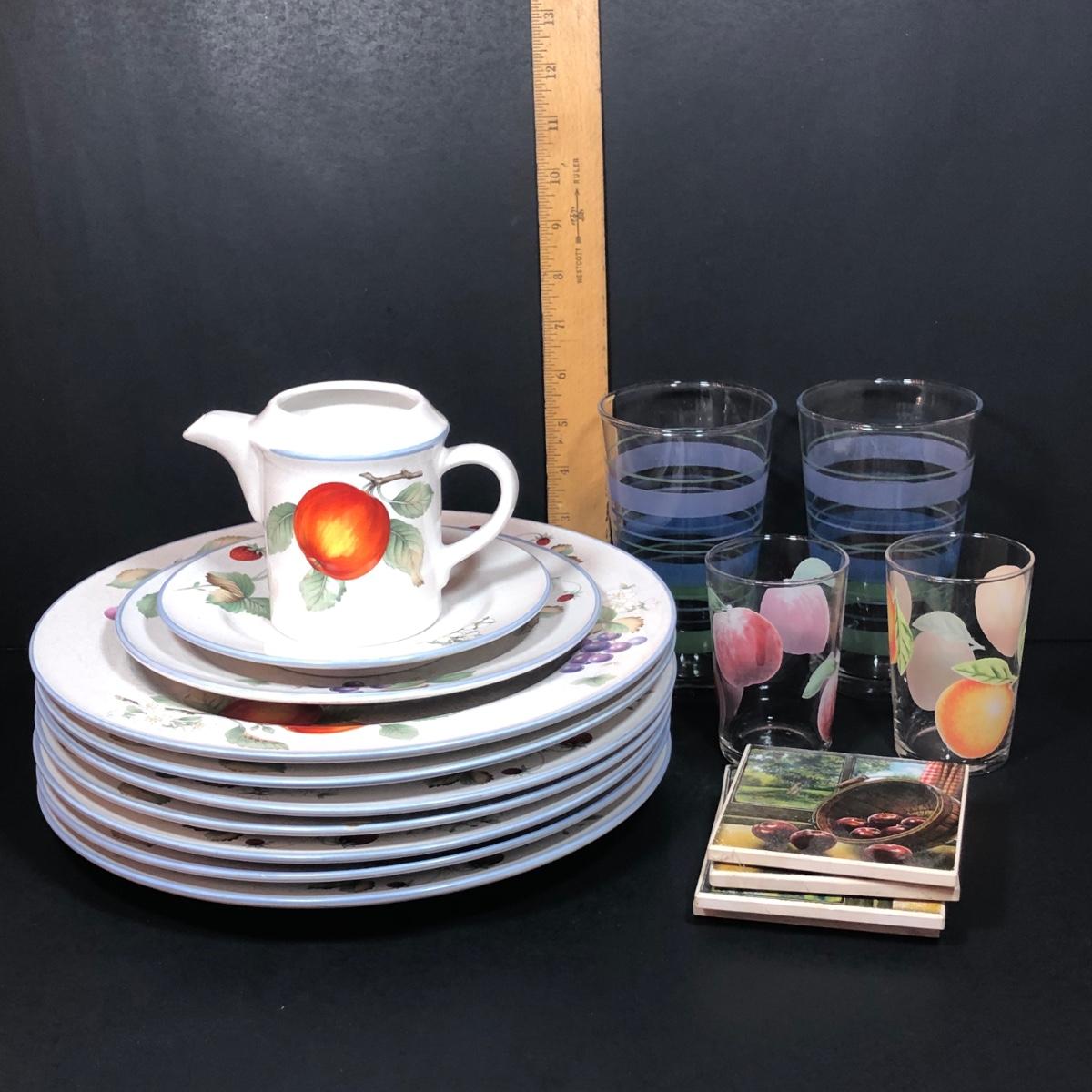 LOT 42F: Savoir Vivre Lucious Pattern Dishes, Vintage Libbey Striped Drinking Glasses (2), Fruit Pattern Juice Glasses (2) & Cork Back Apple Basket Coasters (4)