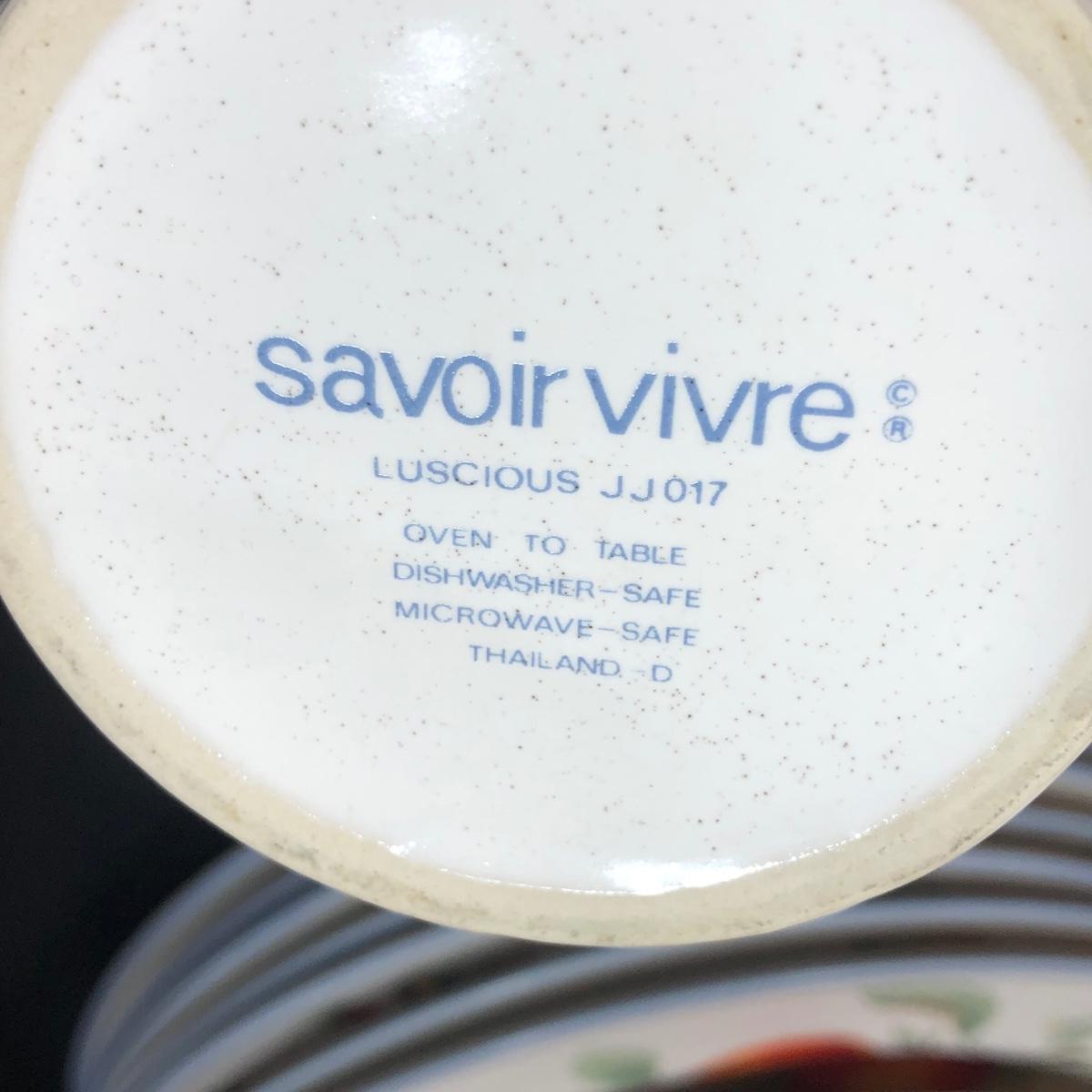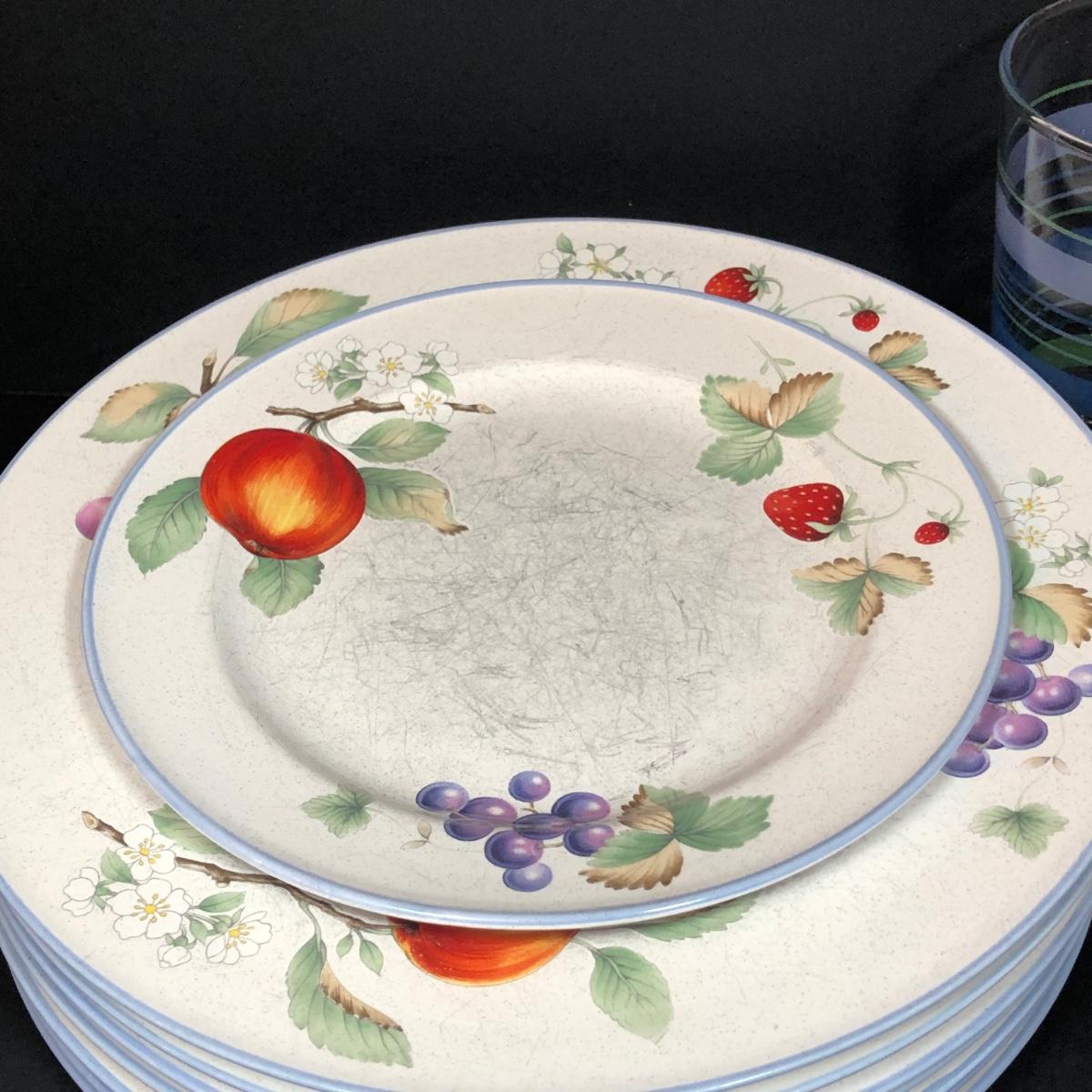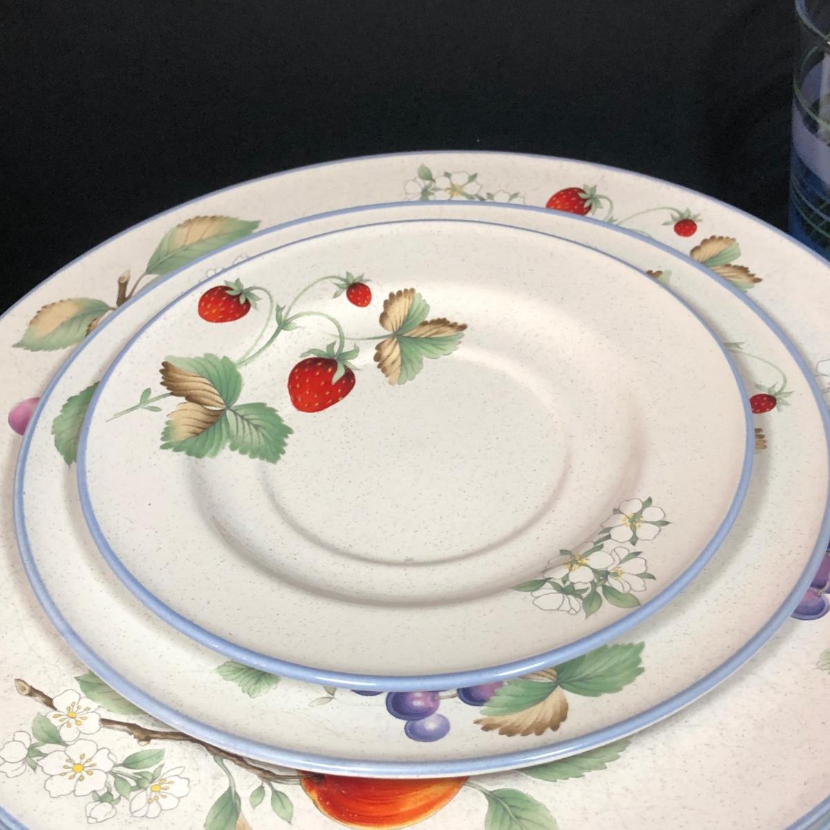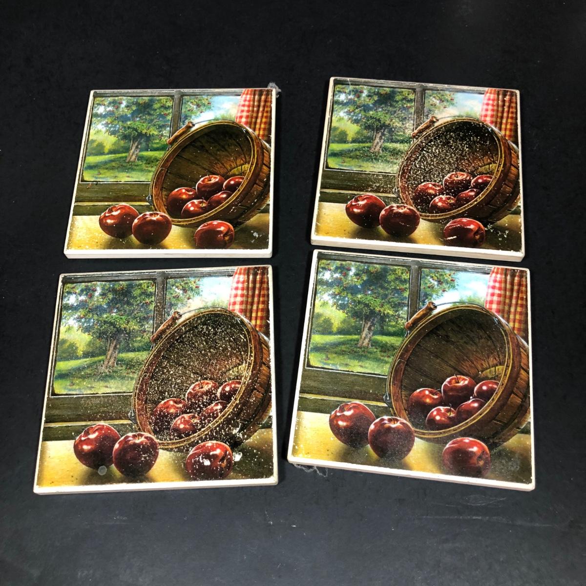 LOT 42F: Savoir Vivre Lucious Pattern Dishes, Vintage Libbey Striped Drinking Glasses (2), Fruit Pattern Juice Glasses (2) & Cork Back Apple Basket Coasters (4)