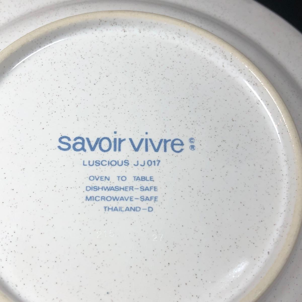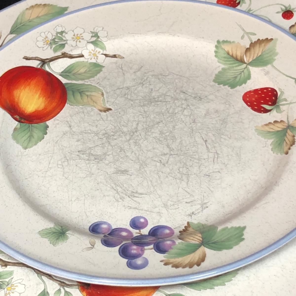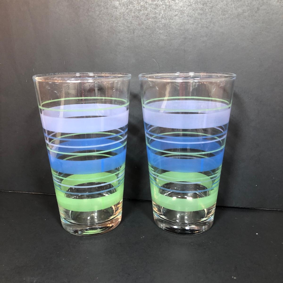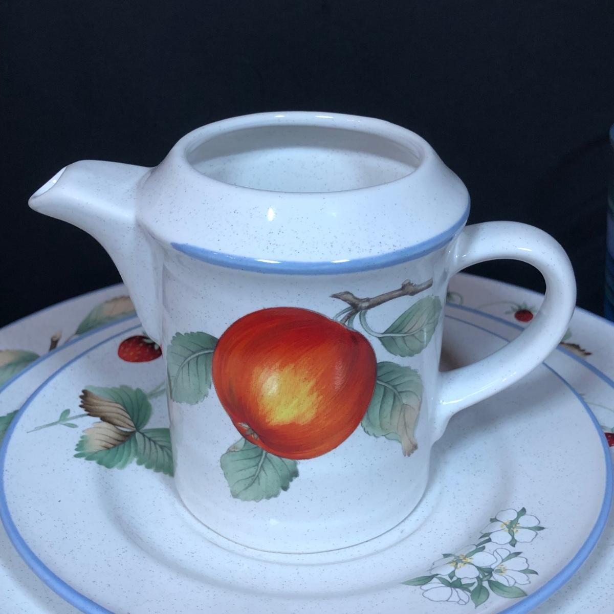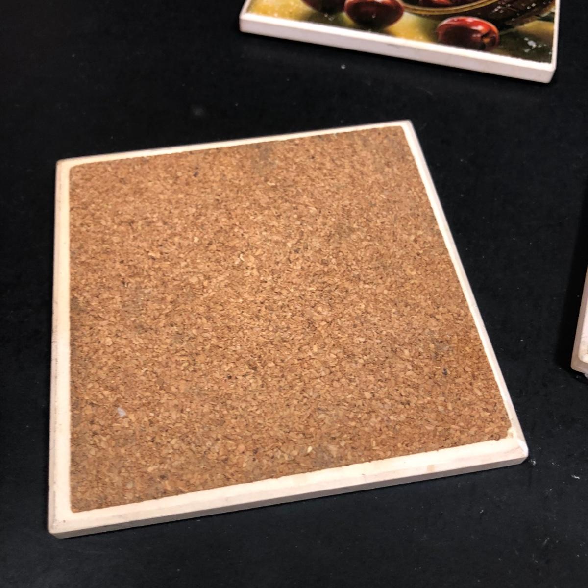 LOT 42F: Savoir Vivre Lucious Pattern Dishes, Vintage Libbey Striped Drinking Glasses (2), Fruit Pattern Juice Glasses (2) & Cork Back Apple Basket Coasters (4)