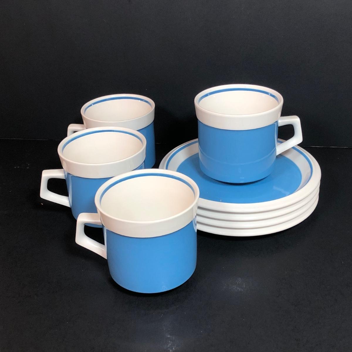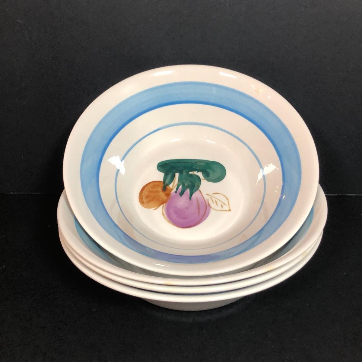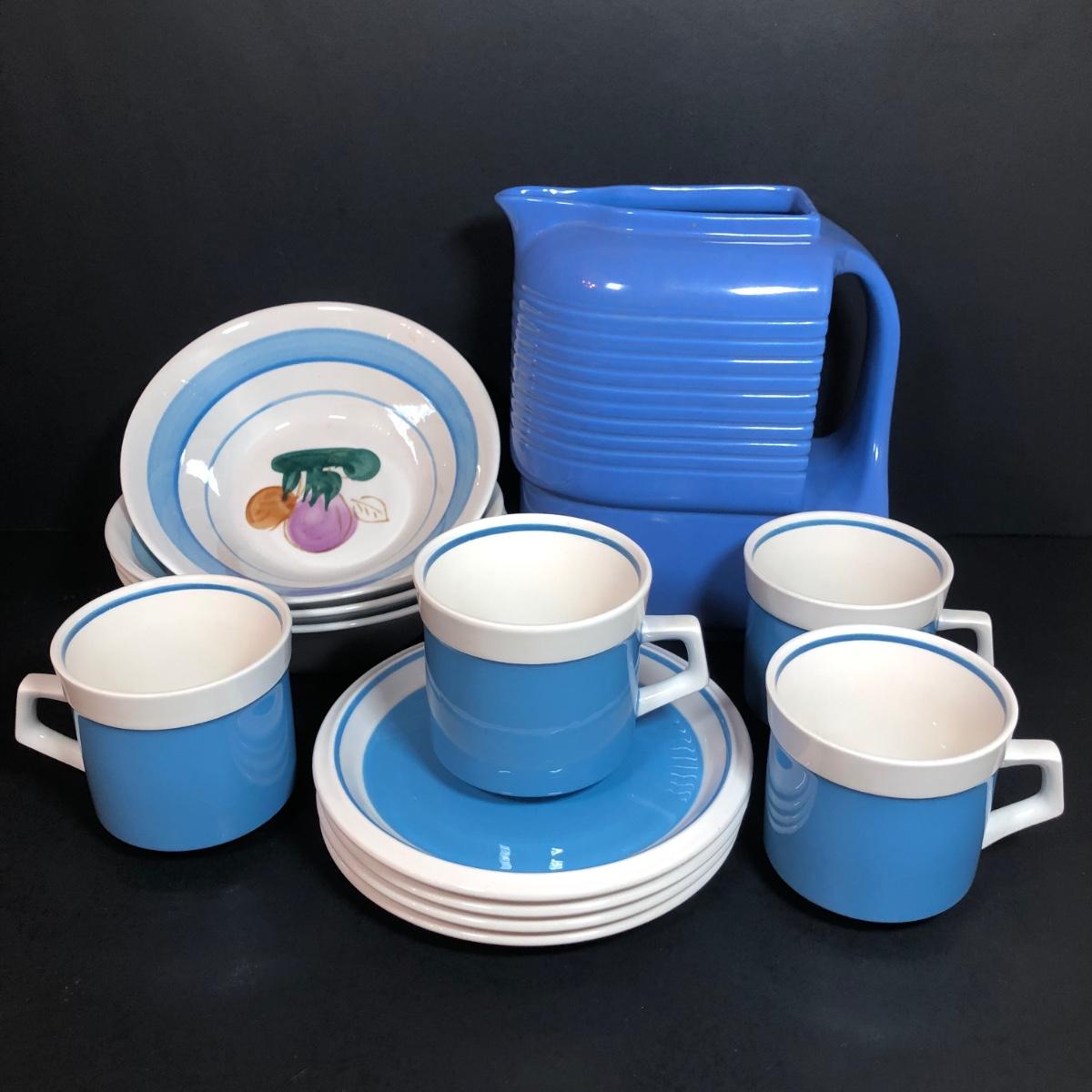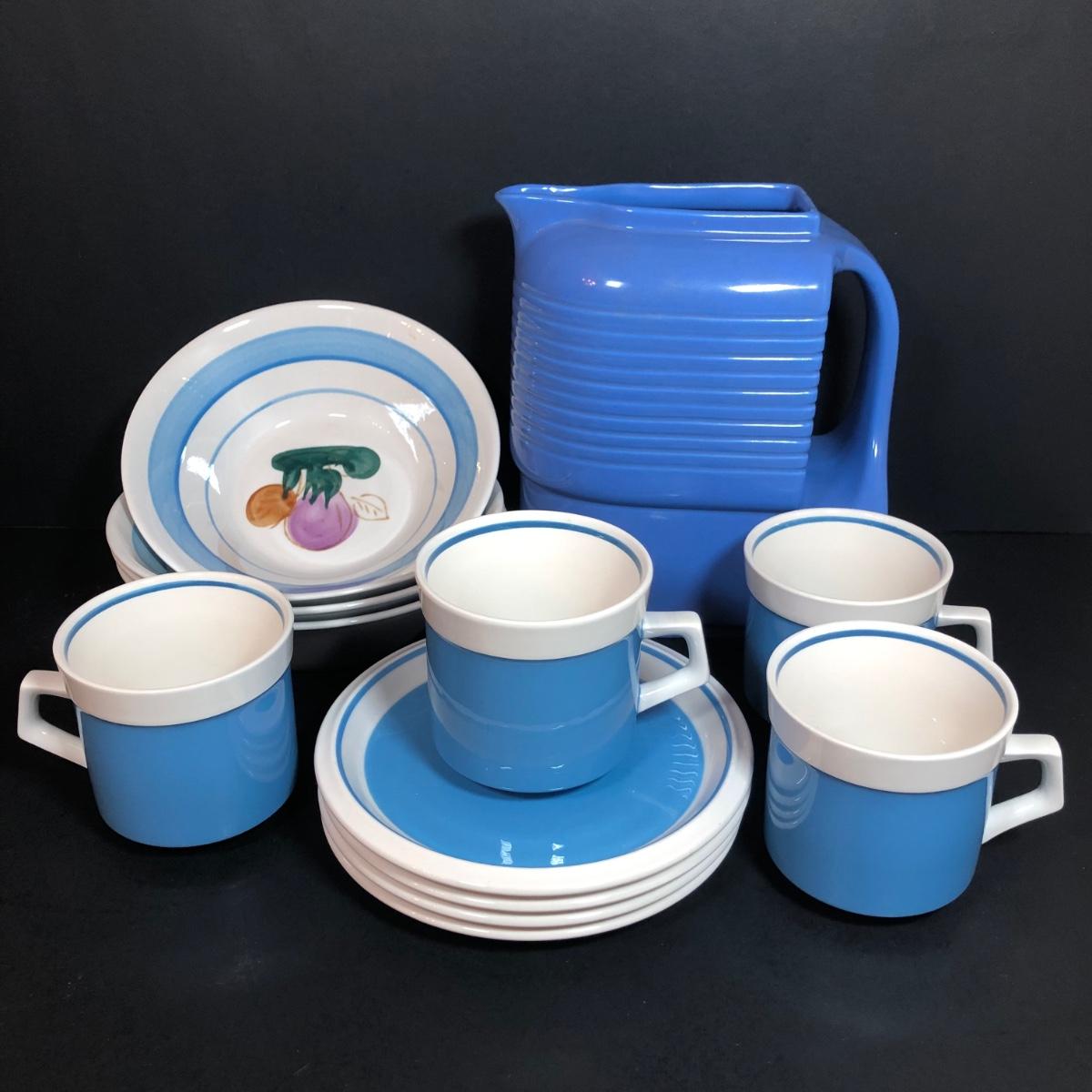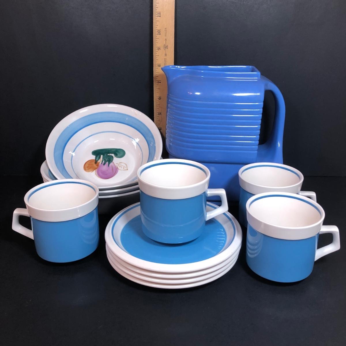 LOT 53K: Vintage Hall Pottery Art Deco Westinghouse Pitcher w/ Mikasa C7500/D5550 Cups & Saucers & Vintage Action Industries Hand Painted Flower Bowls