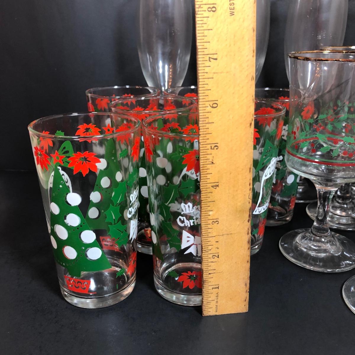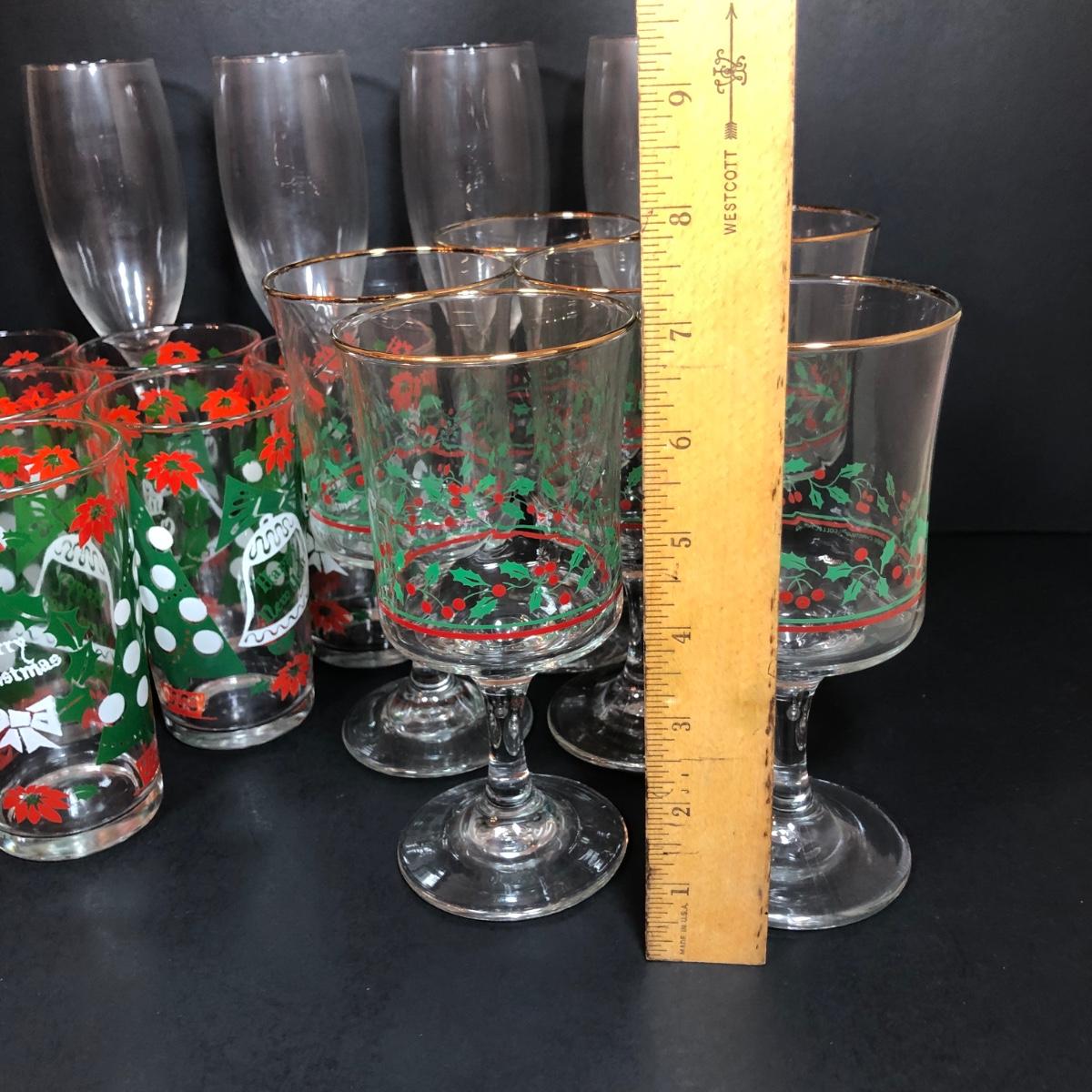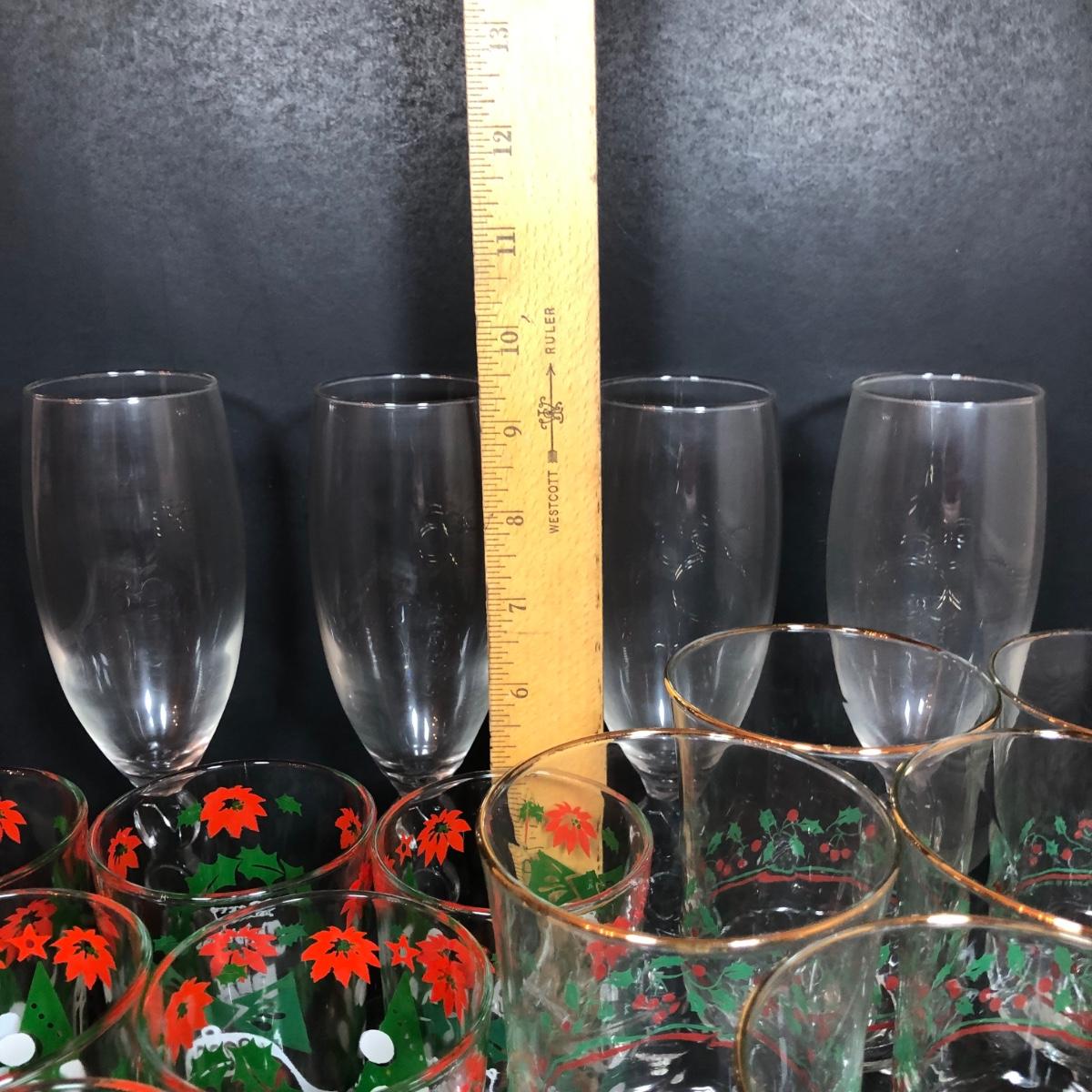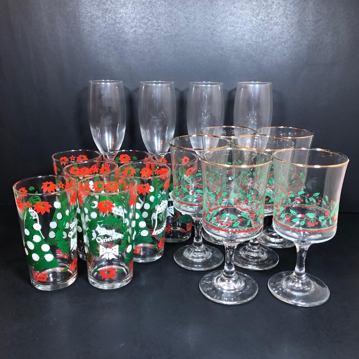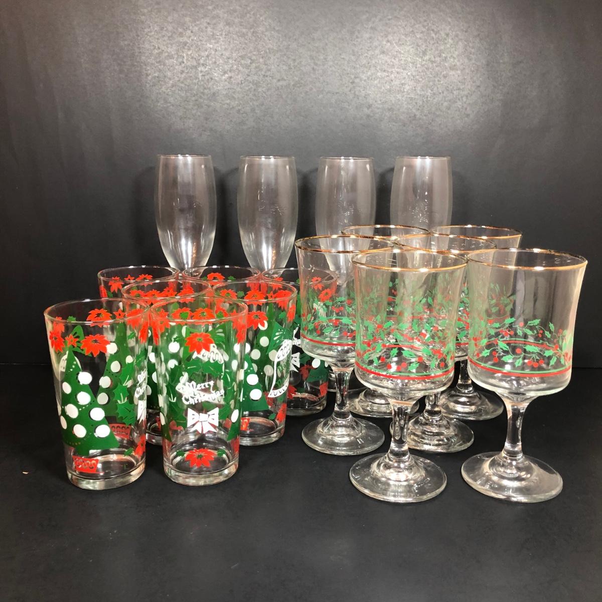LOT 55F: Christmas Glassware - Noel Champagne Glasses (4), 1986 Arby's Christmas Series Glasses (8) & Holiday Tumblers (7)