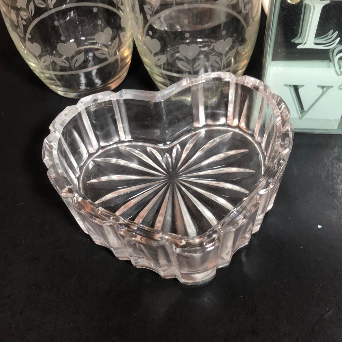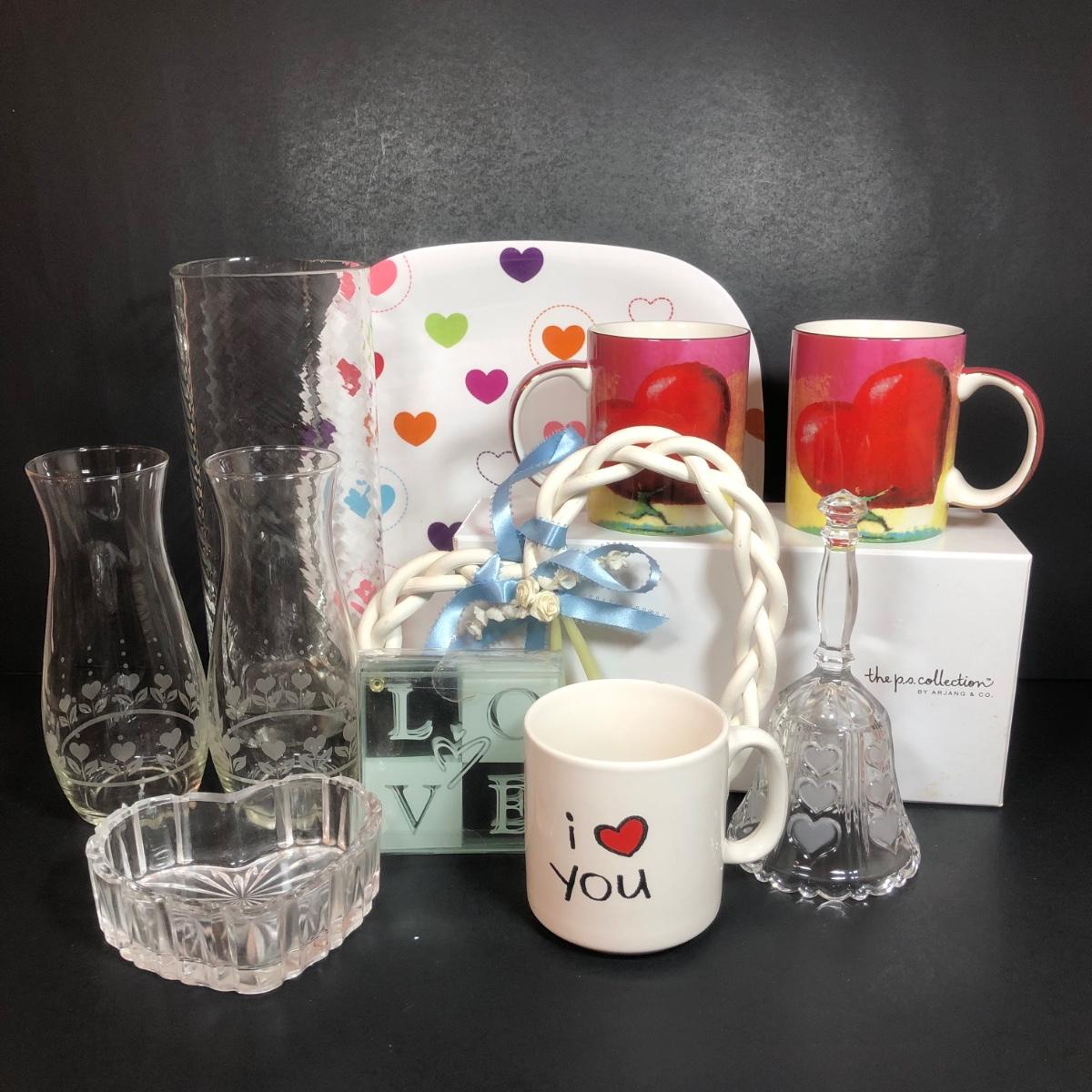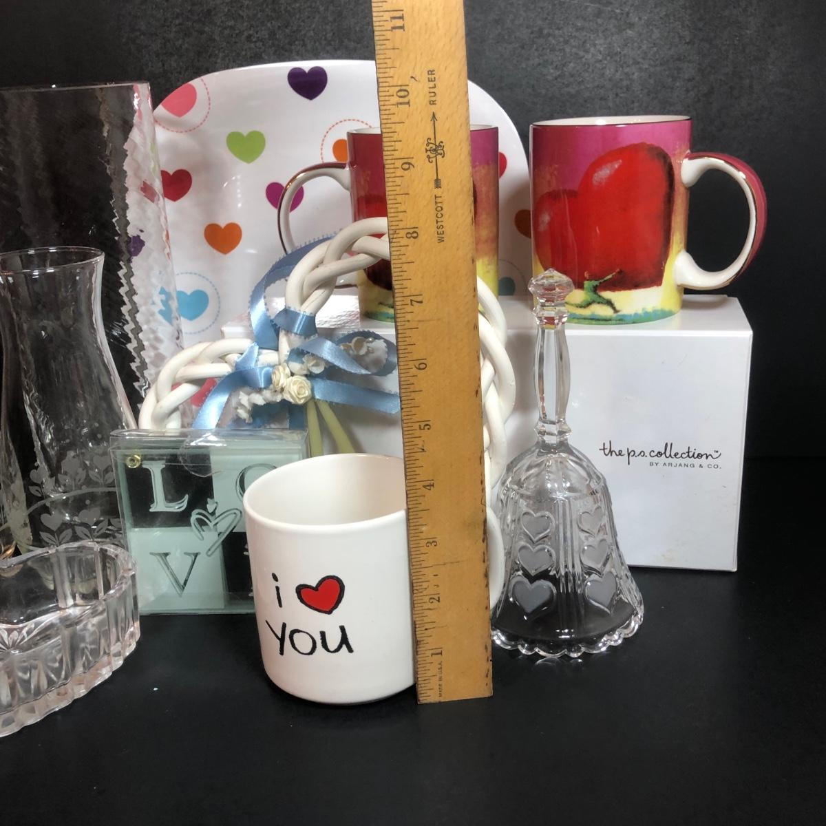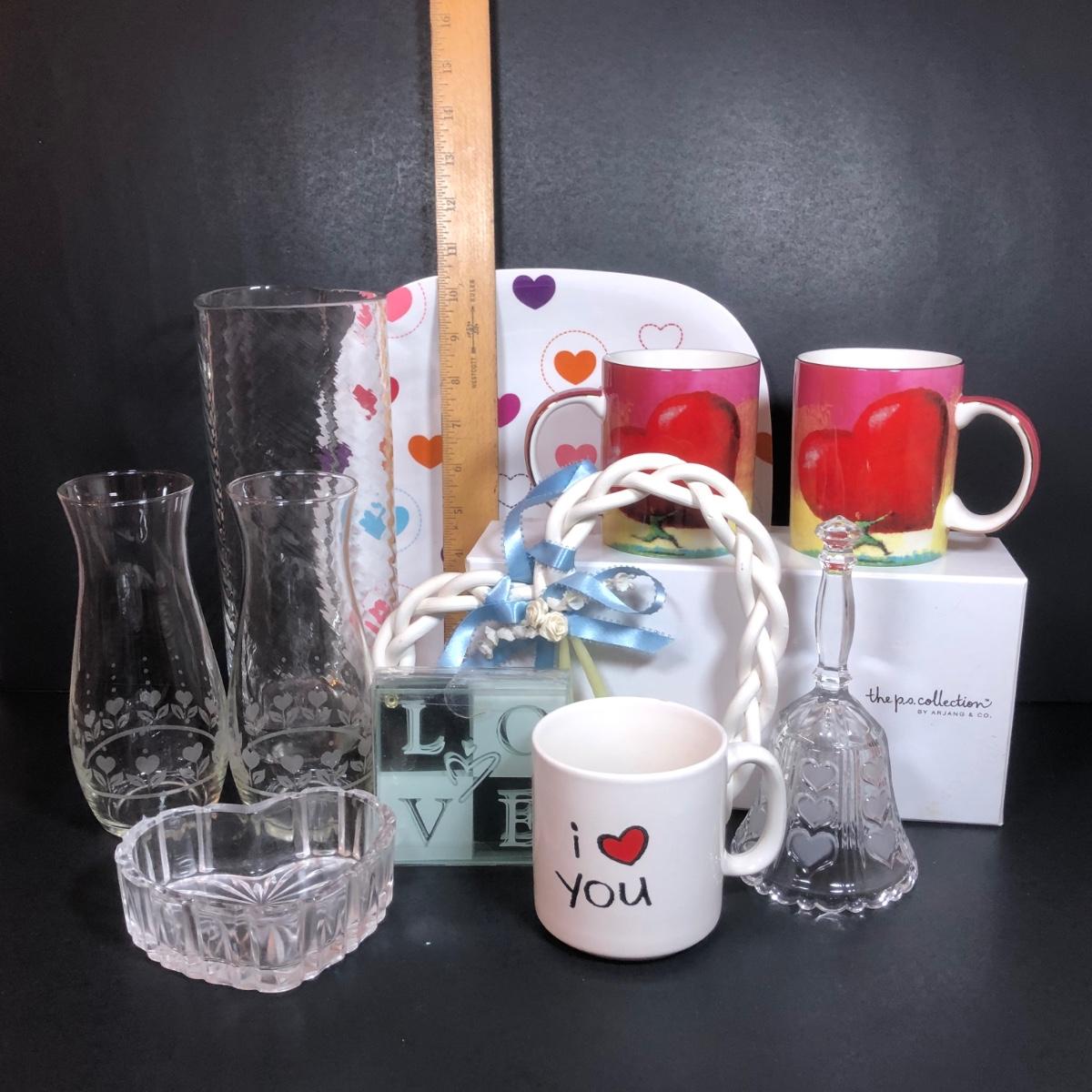 LOT 57F: Valentine's Day Collection - The P.S. Collection Mugs by Arjang & Co in Box, Crystal Heart Dish & Bell, Tall Heart Vase, Love Coasters & More
