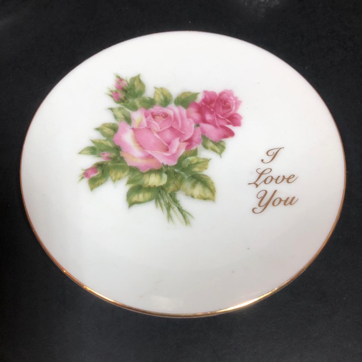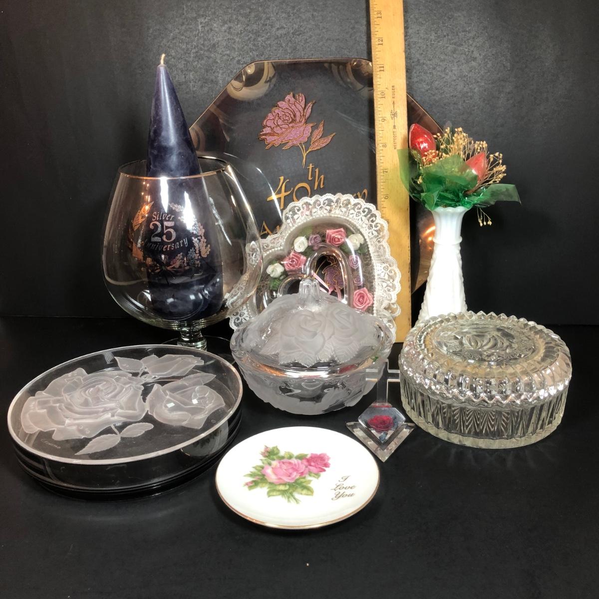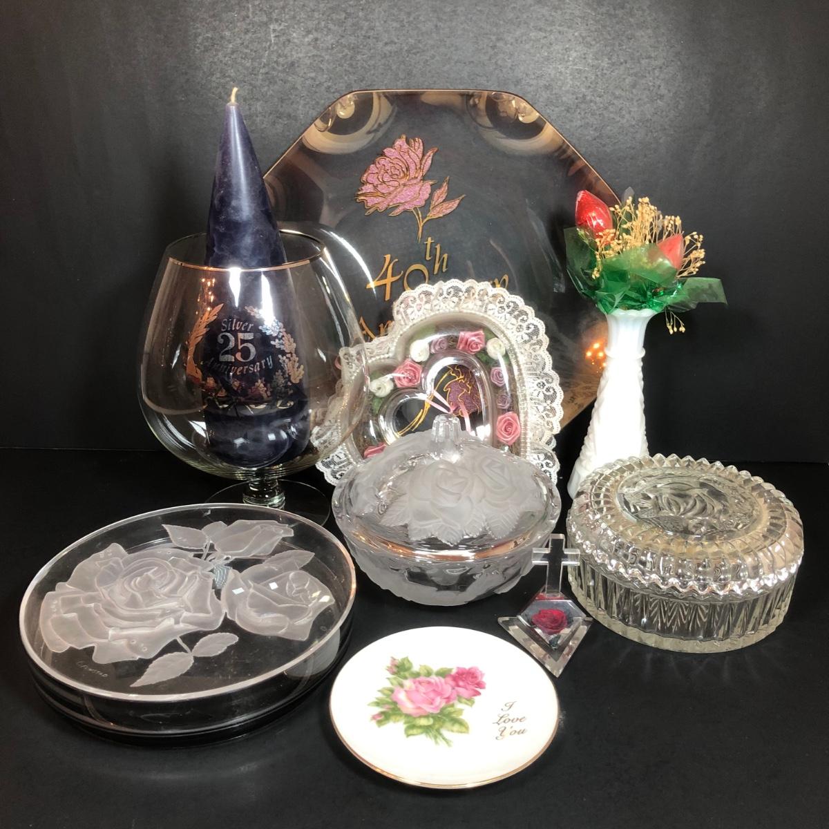 LOT 58L: Romantic Collection - Anniversary Mementos, Rose Lidded Glass Dishes, Milk Glass Vase, 1989 Enesco I Love You Plate & More