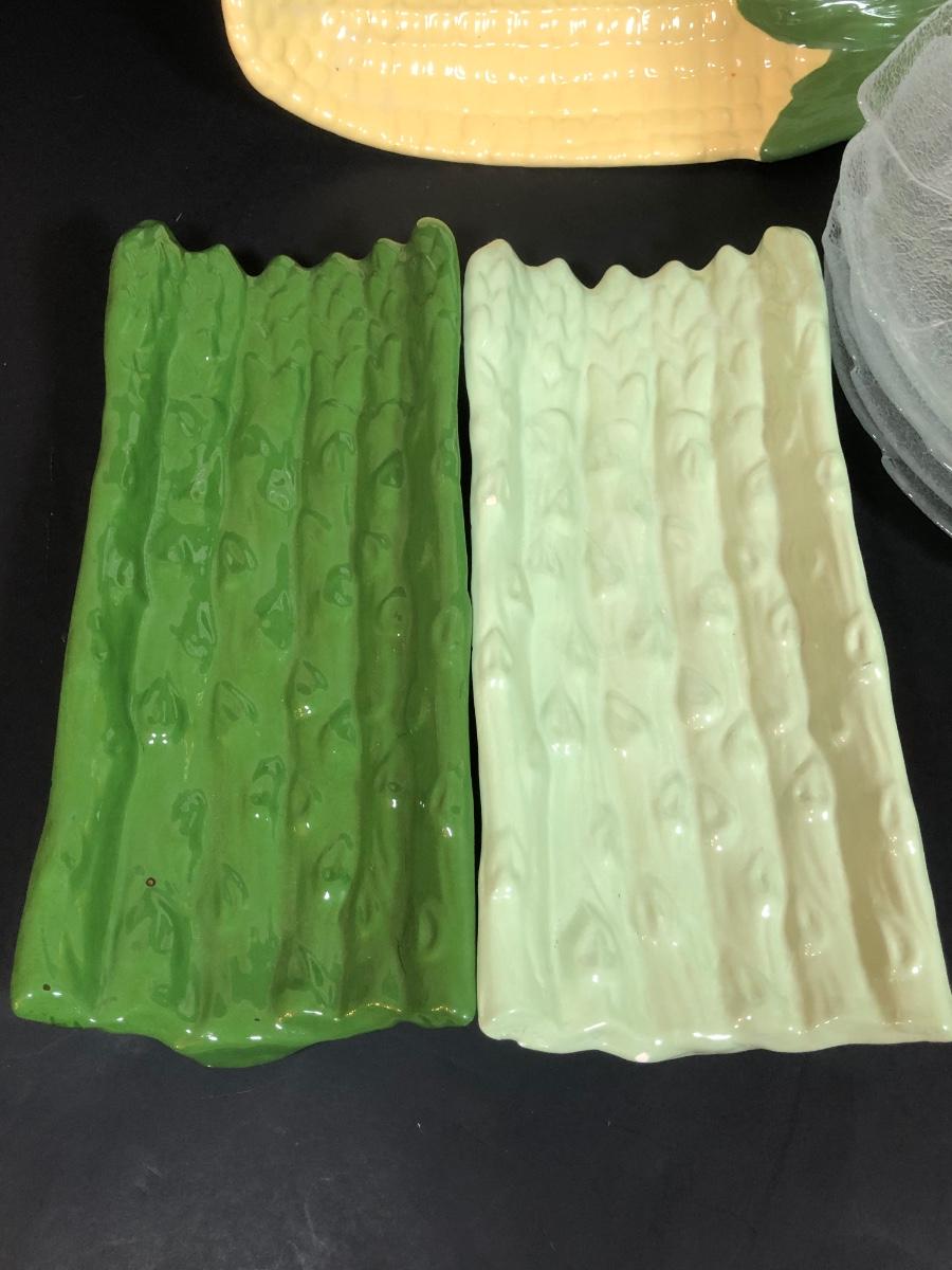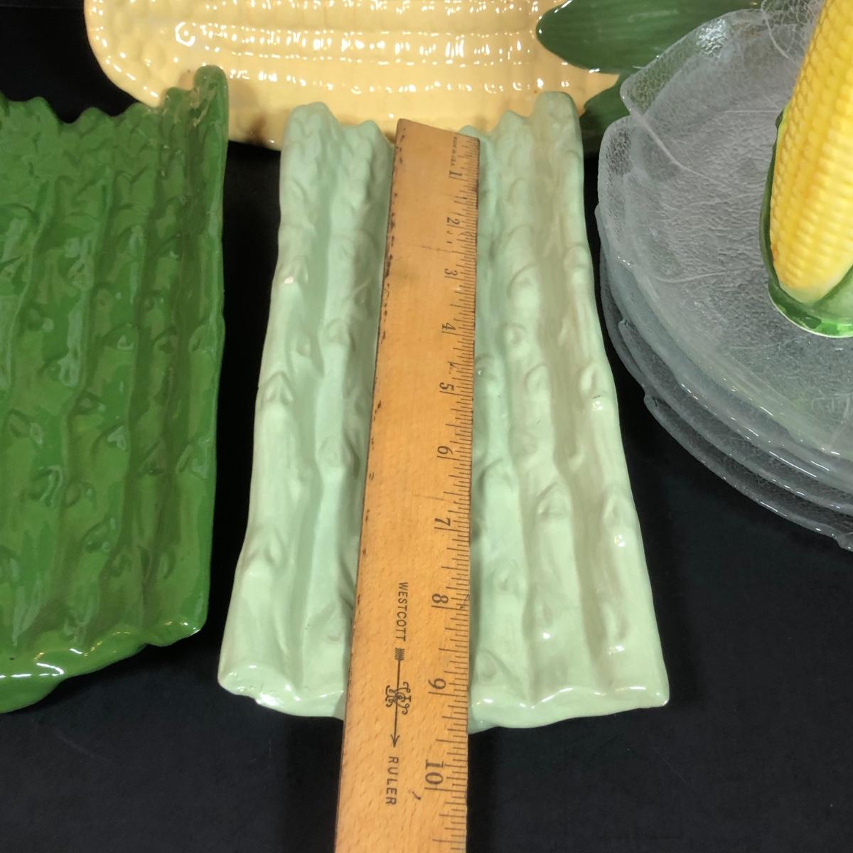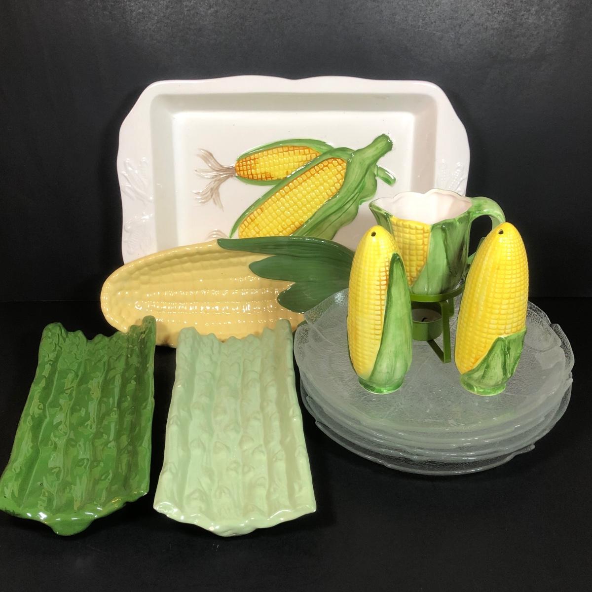 LOT 62K: Corn & Veggie Collection - Original JSC Design Baking Dish, S&P Shakers & Butter Warmer w/ Glass Lettuce Plates, Ceramic Asparagus Dishes