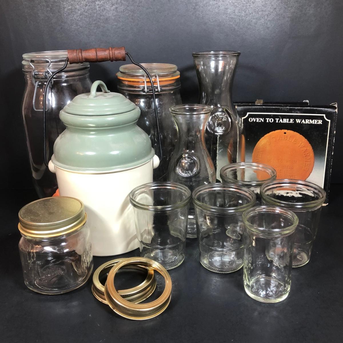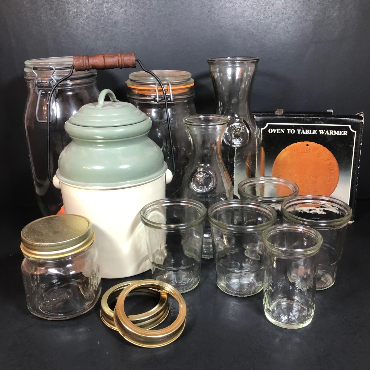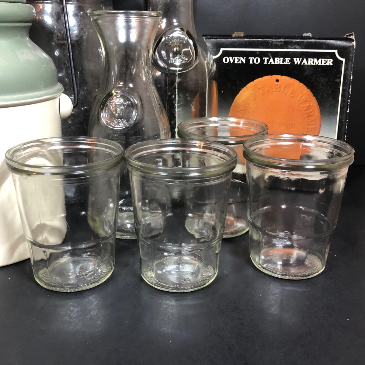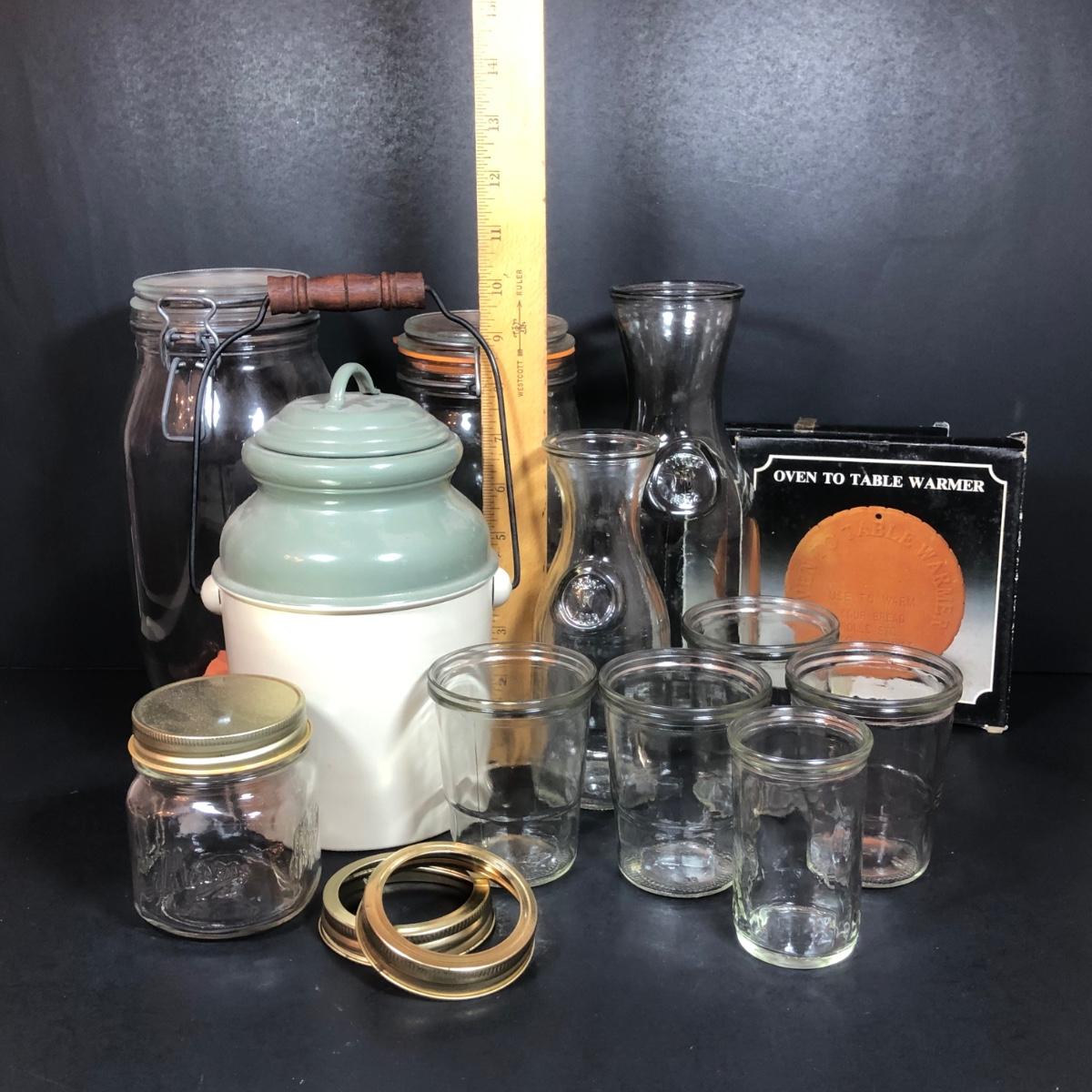 LOT 65F: Ball Juice Glasses, Arc & Parfait Glass Jar Canisters, Terra Cotta Trivets/Food Warmers & More