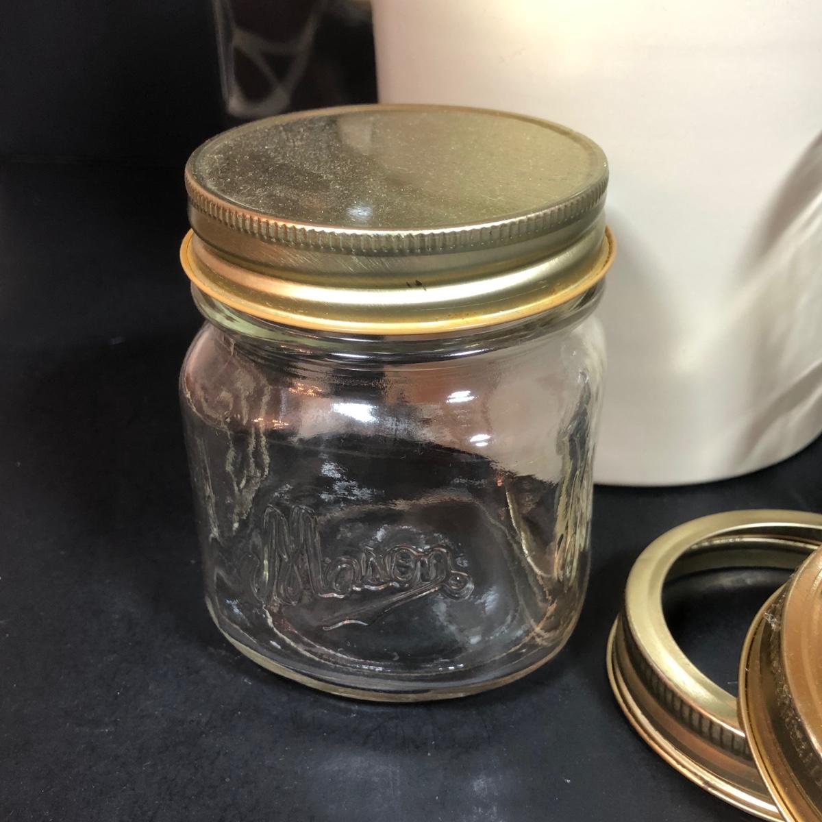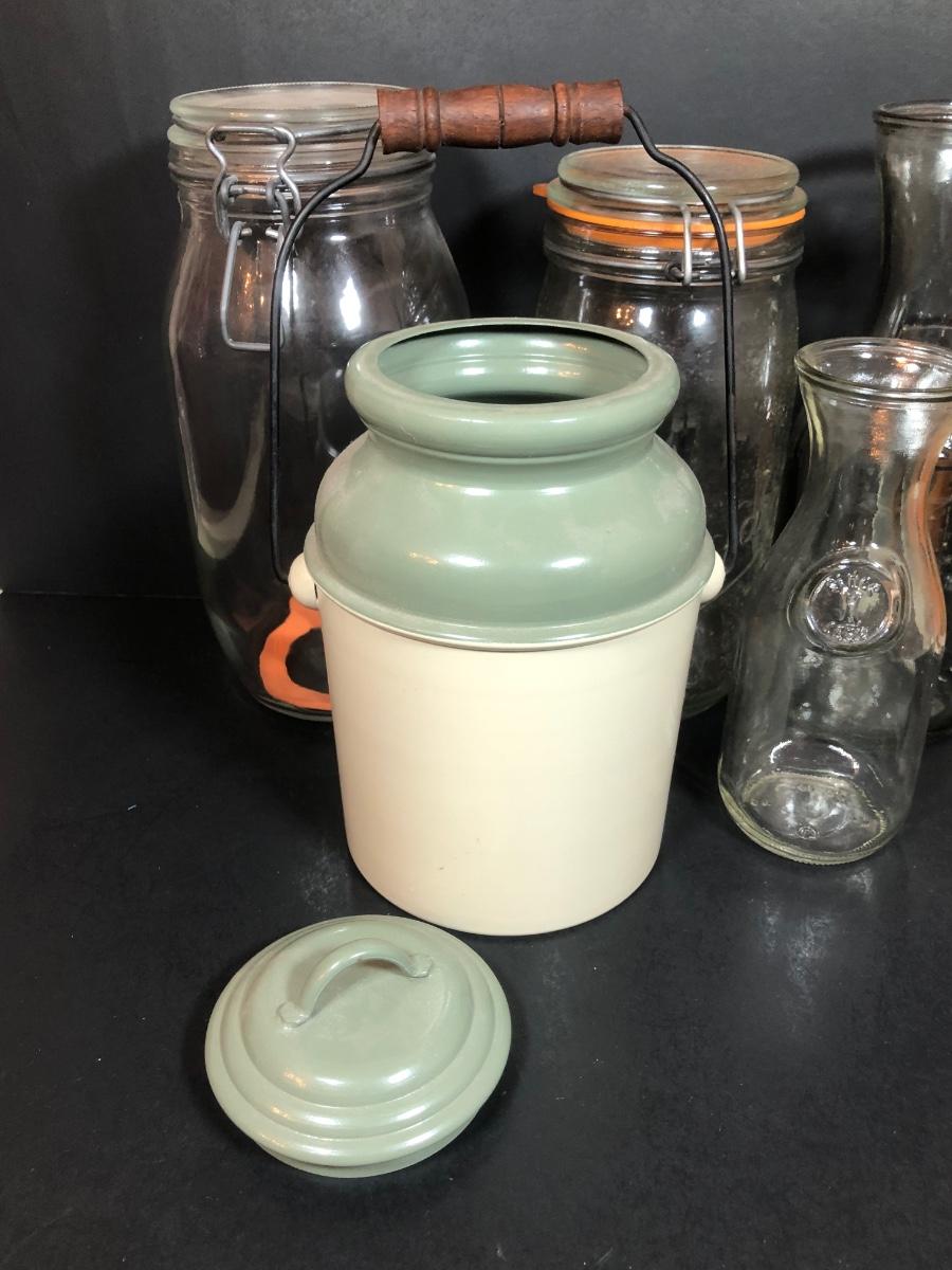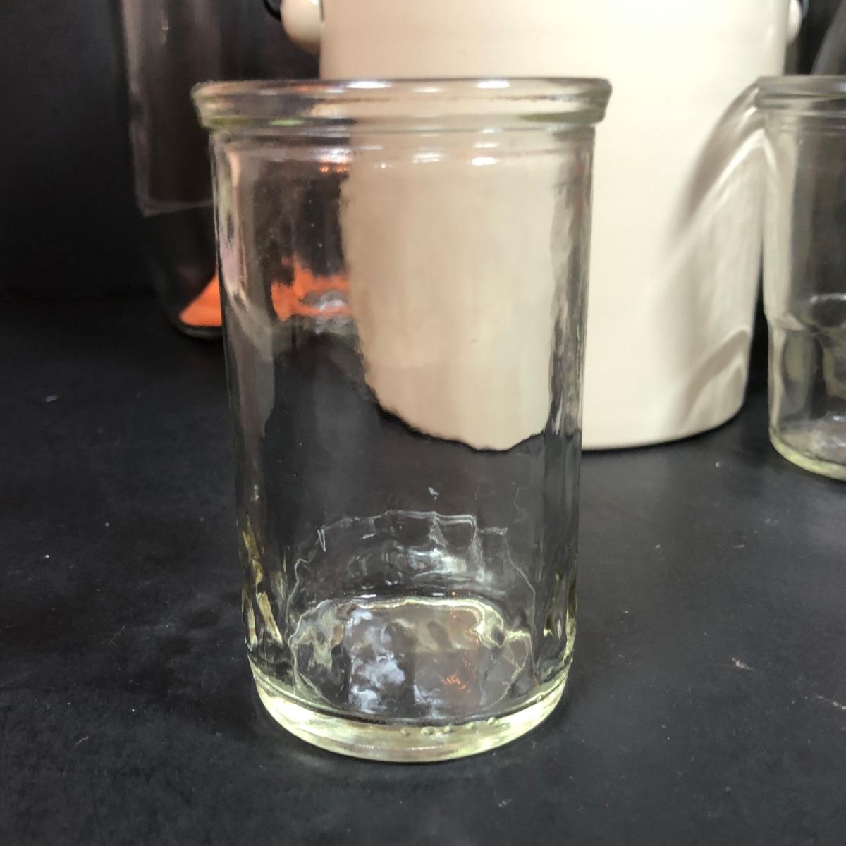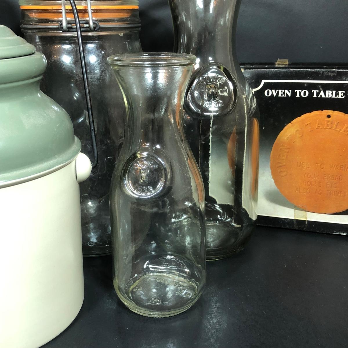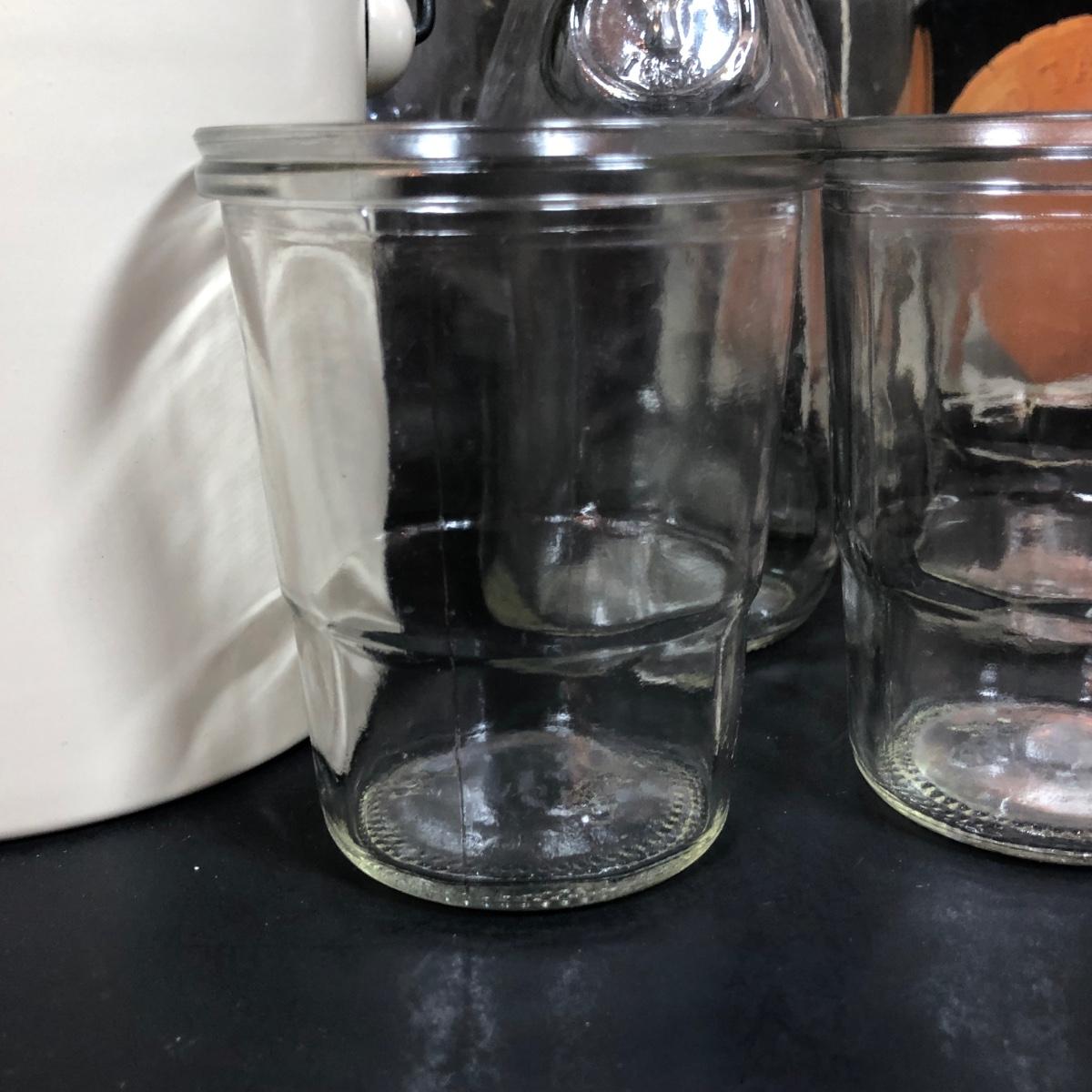 LOT 65F: Ball Juice Glasses, Arc & Parfait Glass Jar Canisters, Terra Cotta Trivets/Food Warmers & More