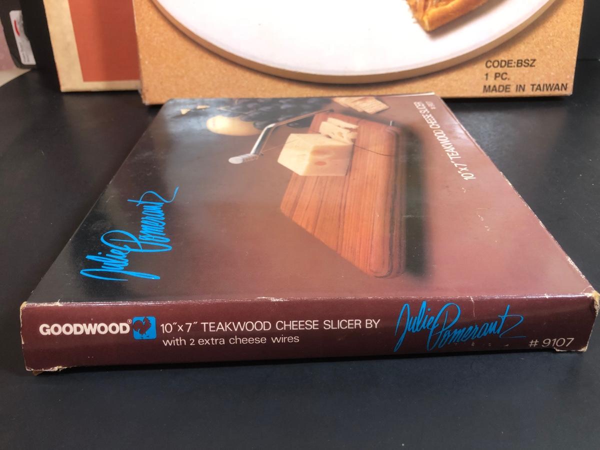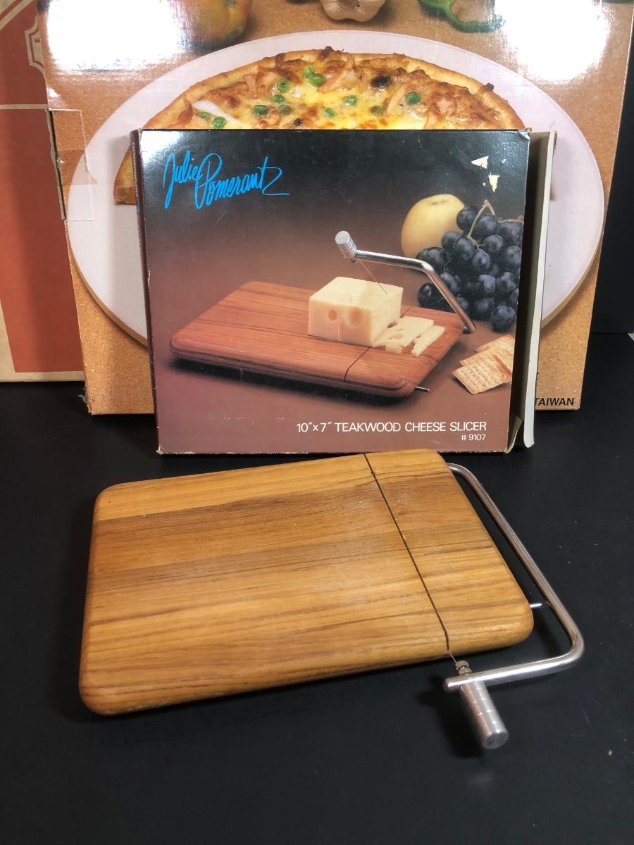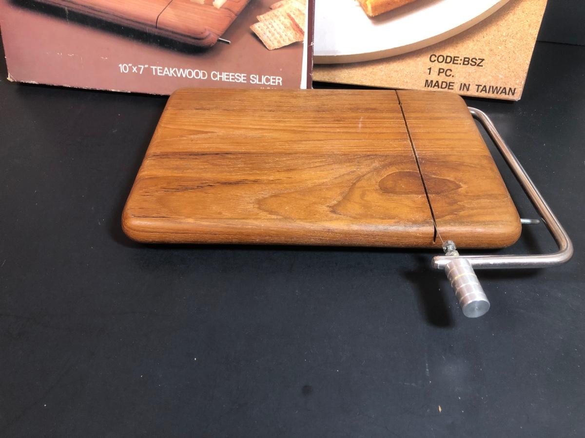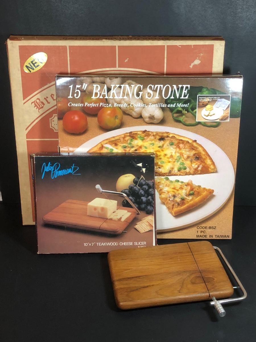 LOT 71L: Goodwood Teakwood Cheese Slicers, 15" Baking Stone & Saladay Bread Stone