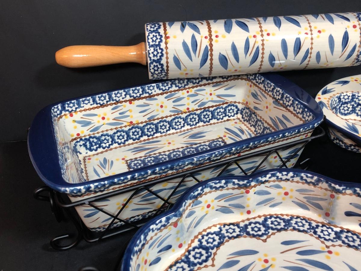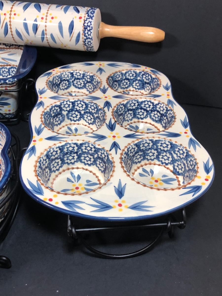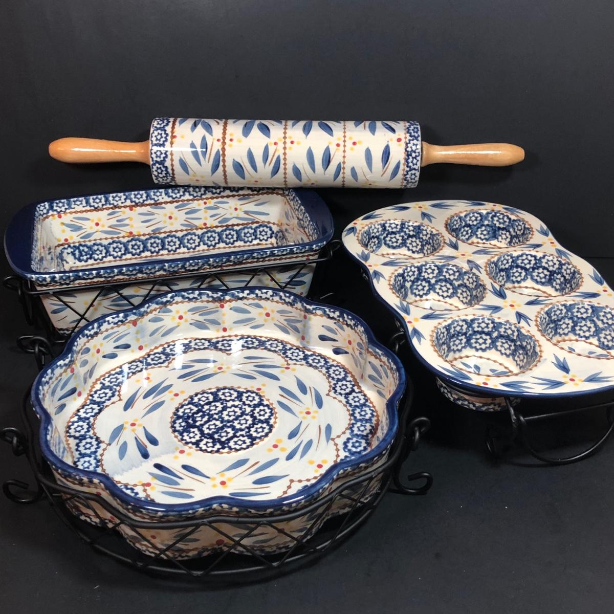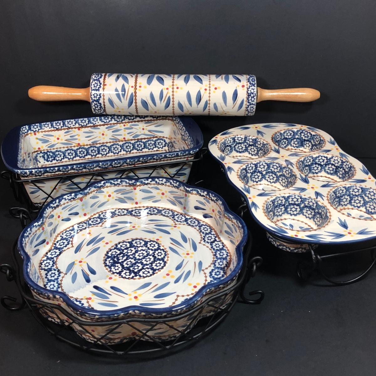 LOT 79K: Temp-Tations by Tara Blue Old World Baking Set - Cupcake/Muffin Pan, Loaf Pan, Rolling Pin & 10" Dish
