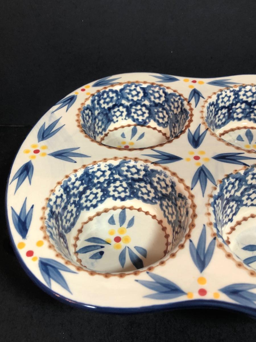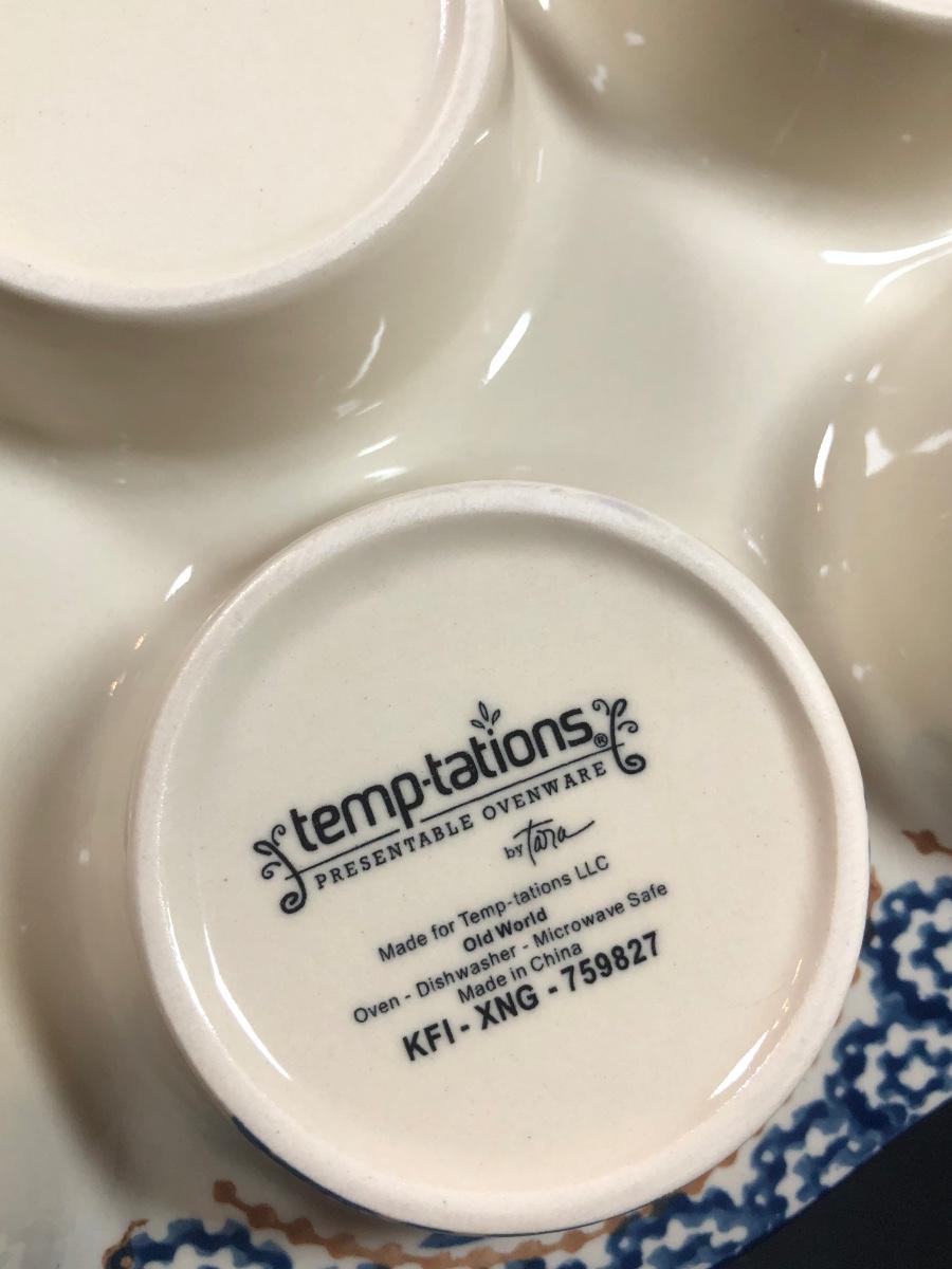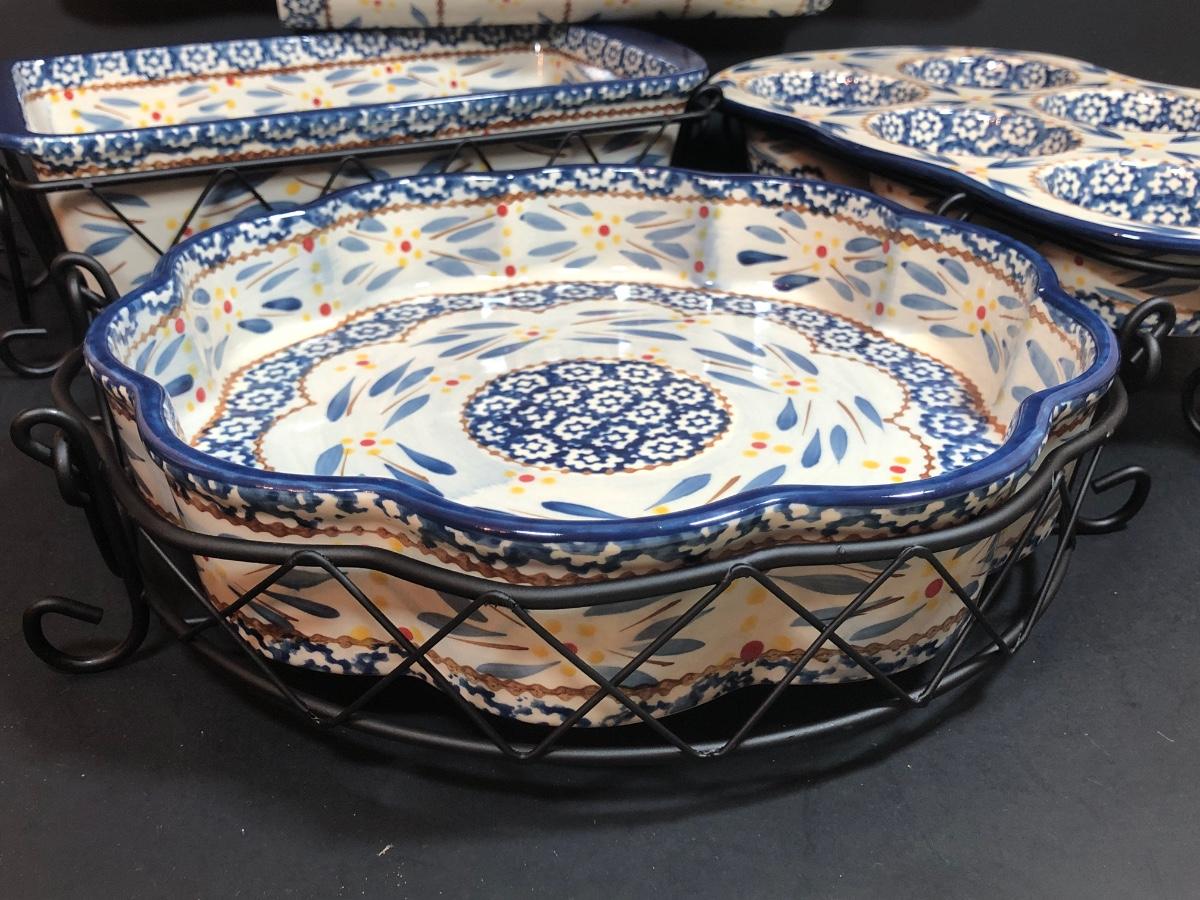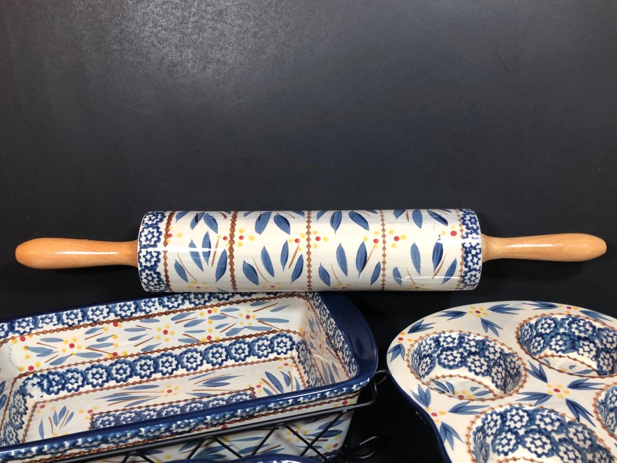 LOT 79K: Temp-Tations by Tara Blue Old World Baking Set - Cupcake/Muffin Pan, Loaf Pan, Rolling Pin & 10" Dish