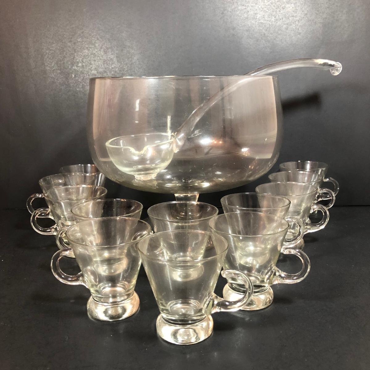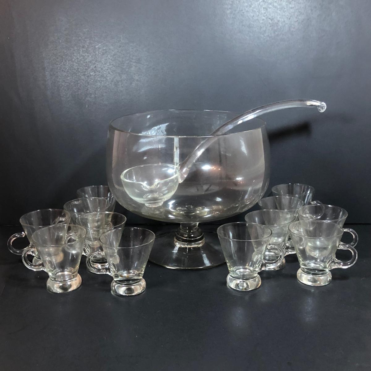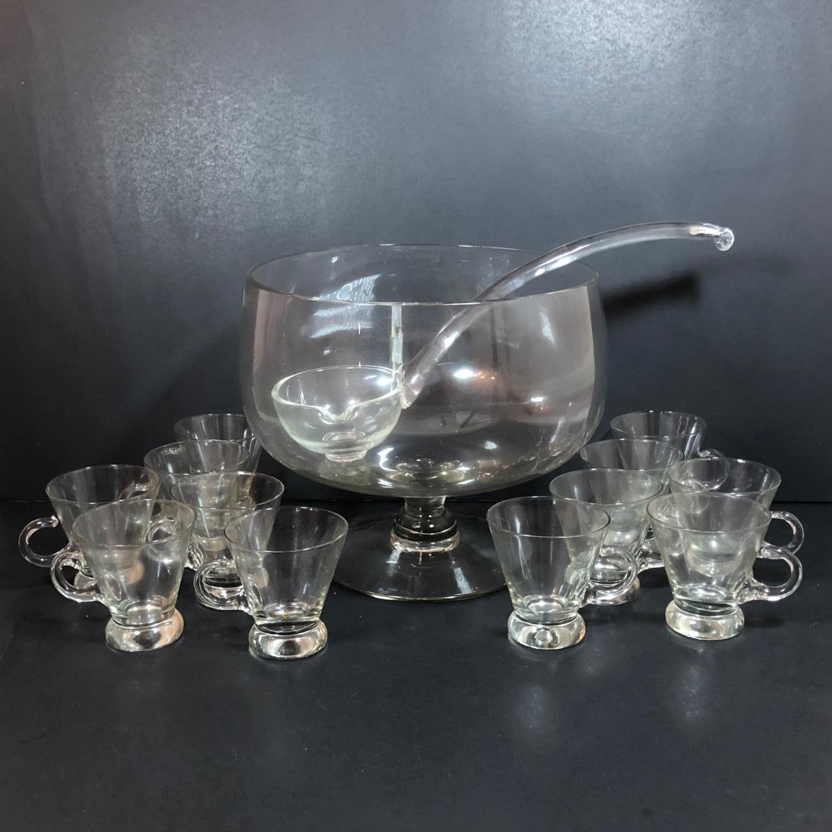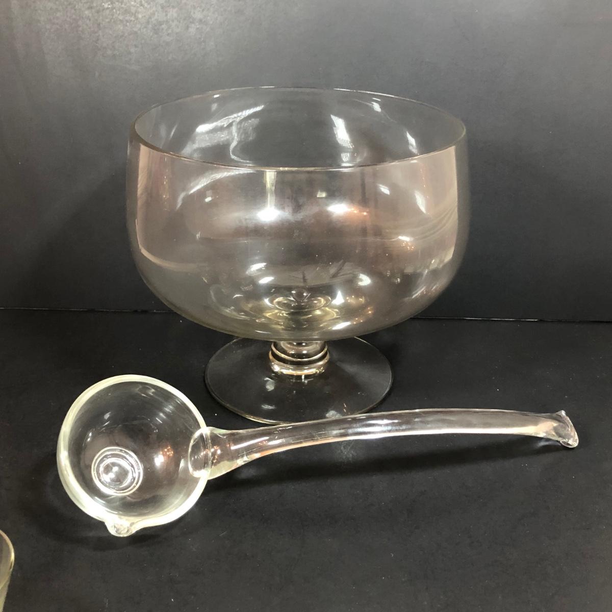 LOT 86D: Vintage Louie Glass Company Punch Bowl w/ Glass Ladle & 12 Cups