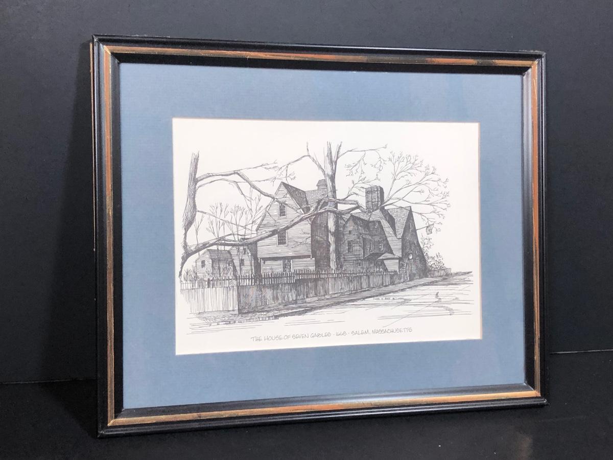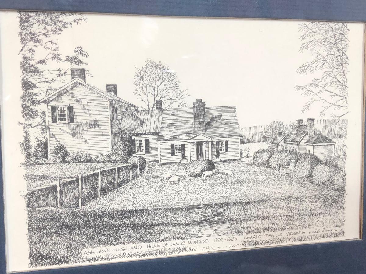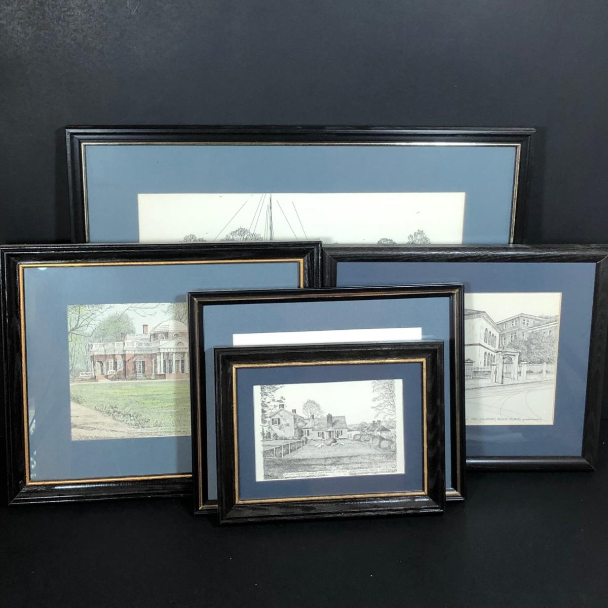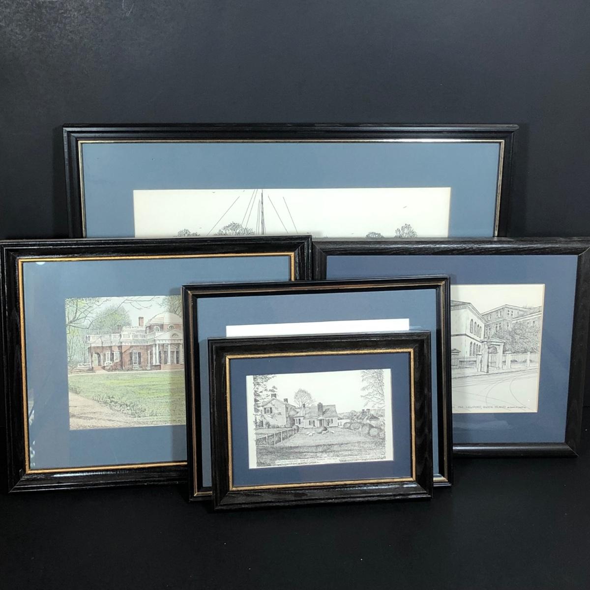 Framed pieces measure 17 x 13, 8 x 6.5, 11.5 x 9.5, 11 x 9 & 10 x 8.5 inches.