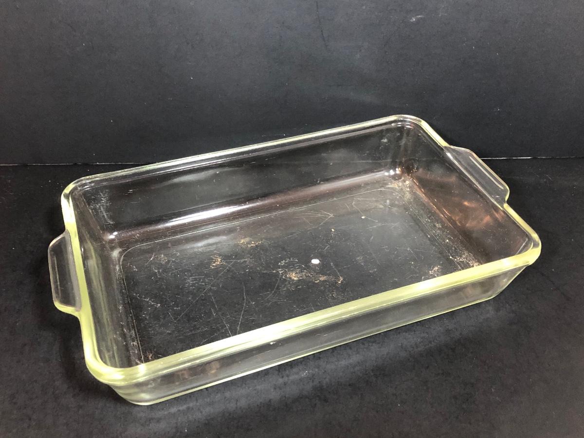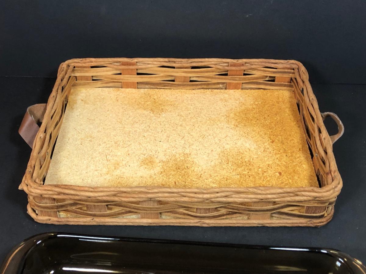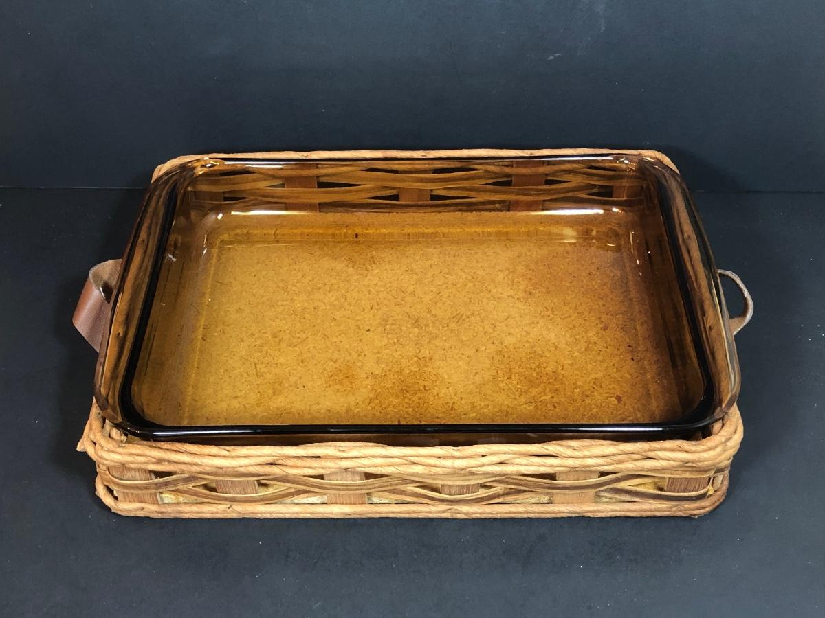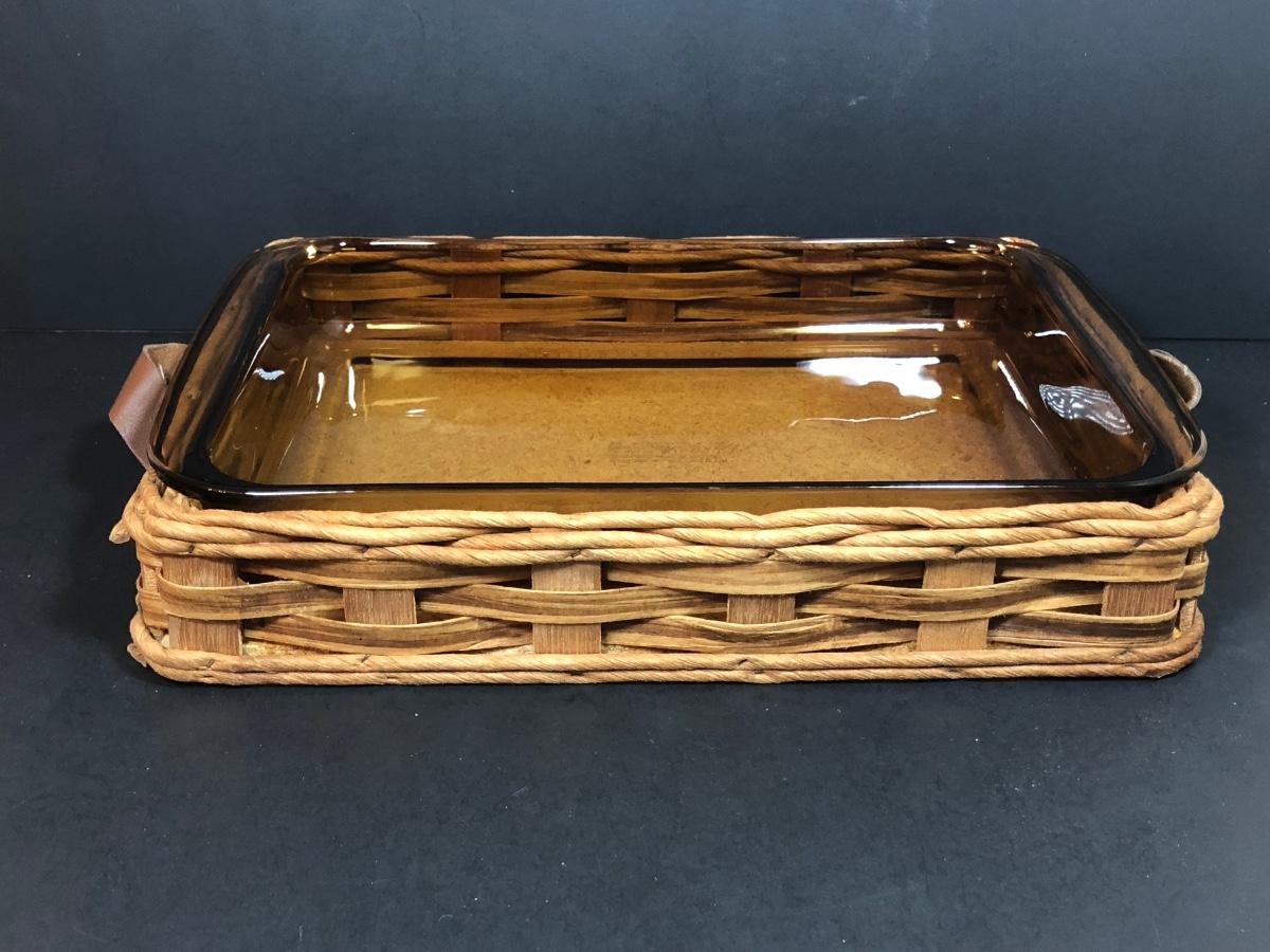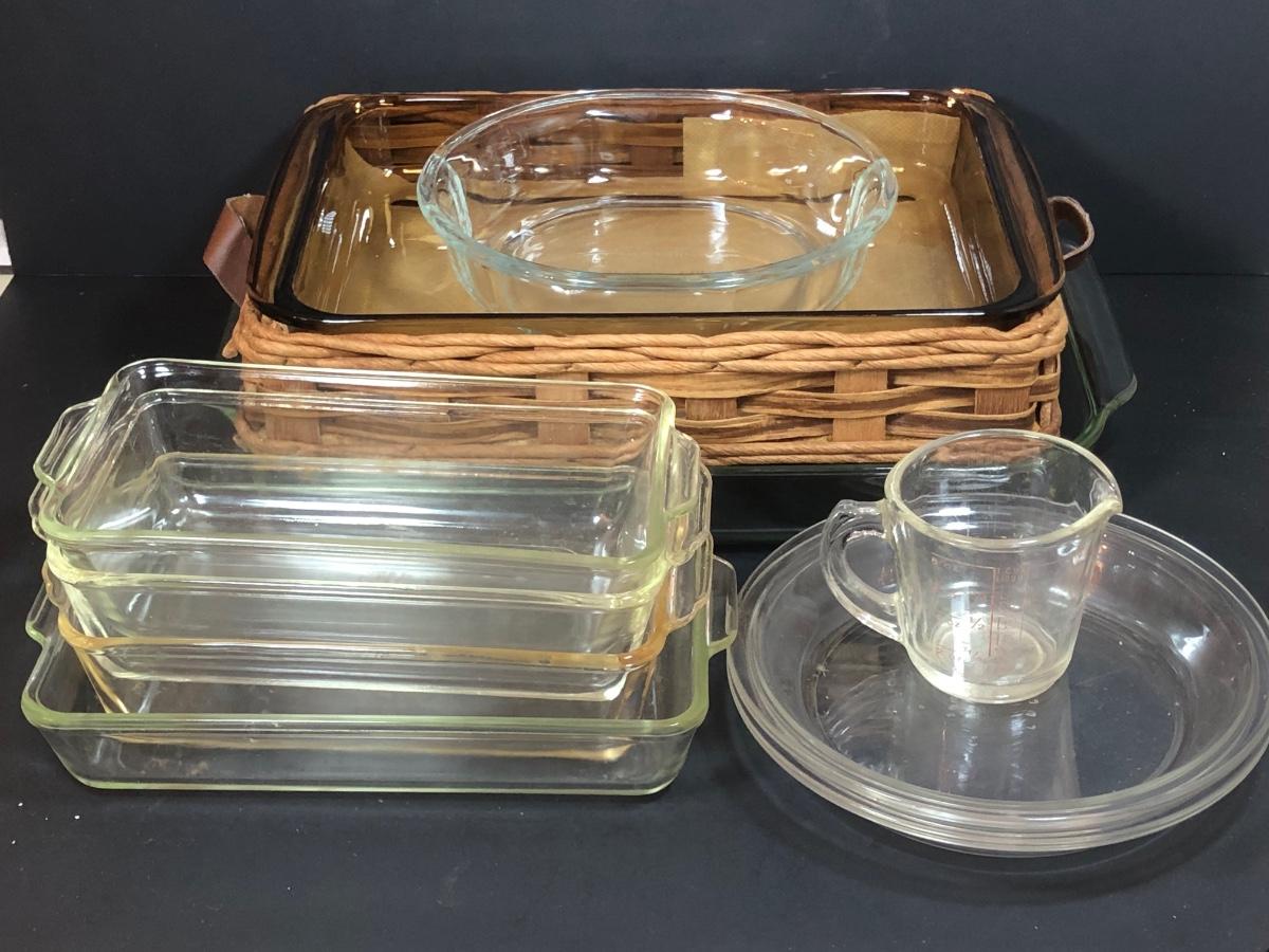 LOT 93K: Glass Pyrex Collection - Square & Round Baking Dishes, Measuring Cup & Tinted Casserole Dish w/ Cork Bottom Basket