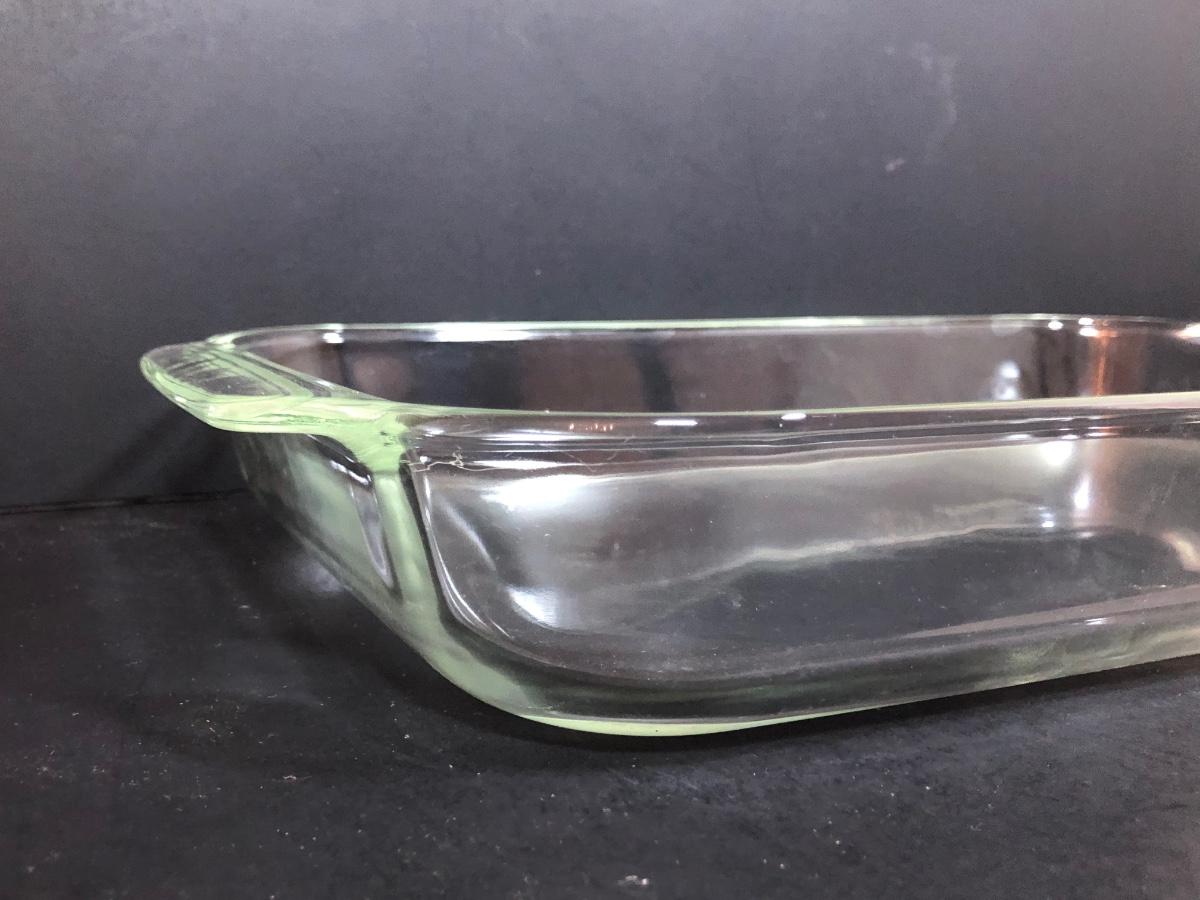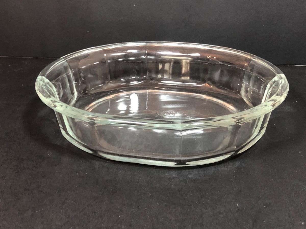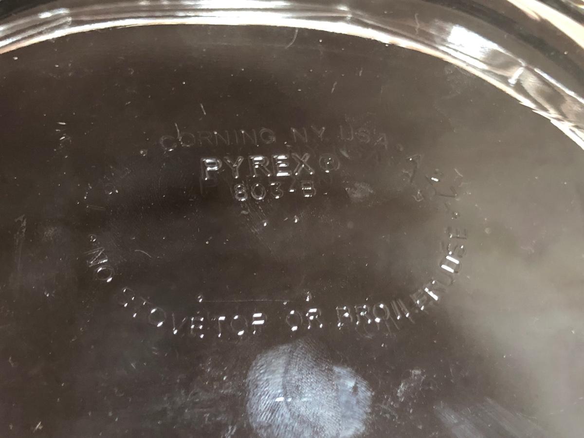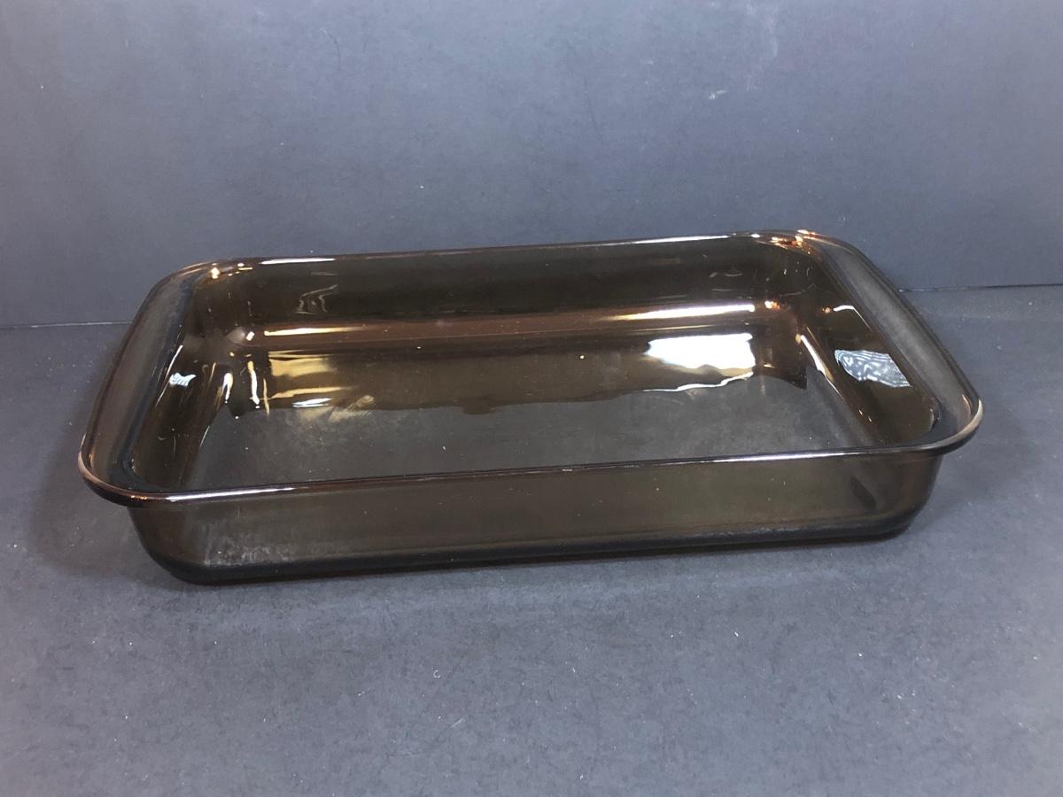 LOT 93K: Glass Pyrex Collection - Square & Round Baking Dishes, Measuring Cup & Tinted Casserole Dish w/ Cork Bottom Basket