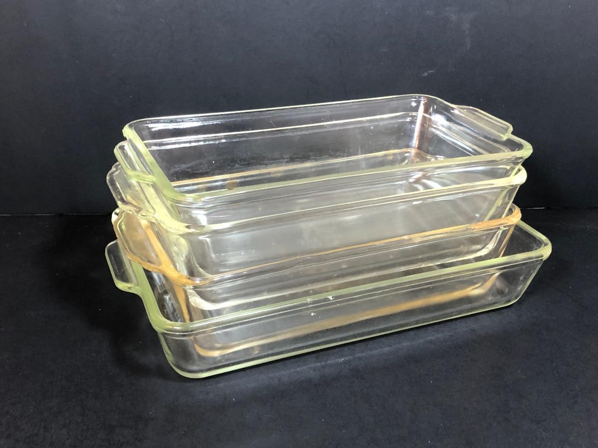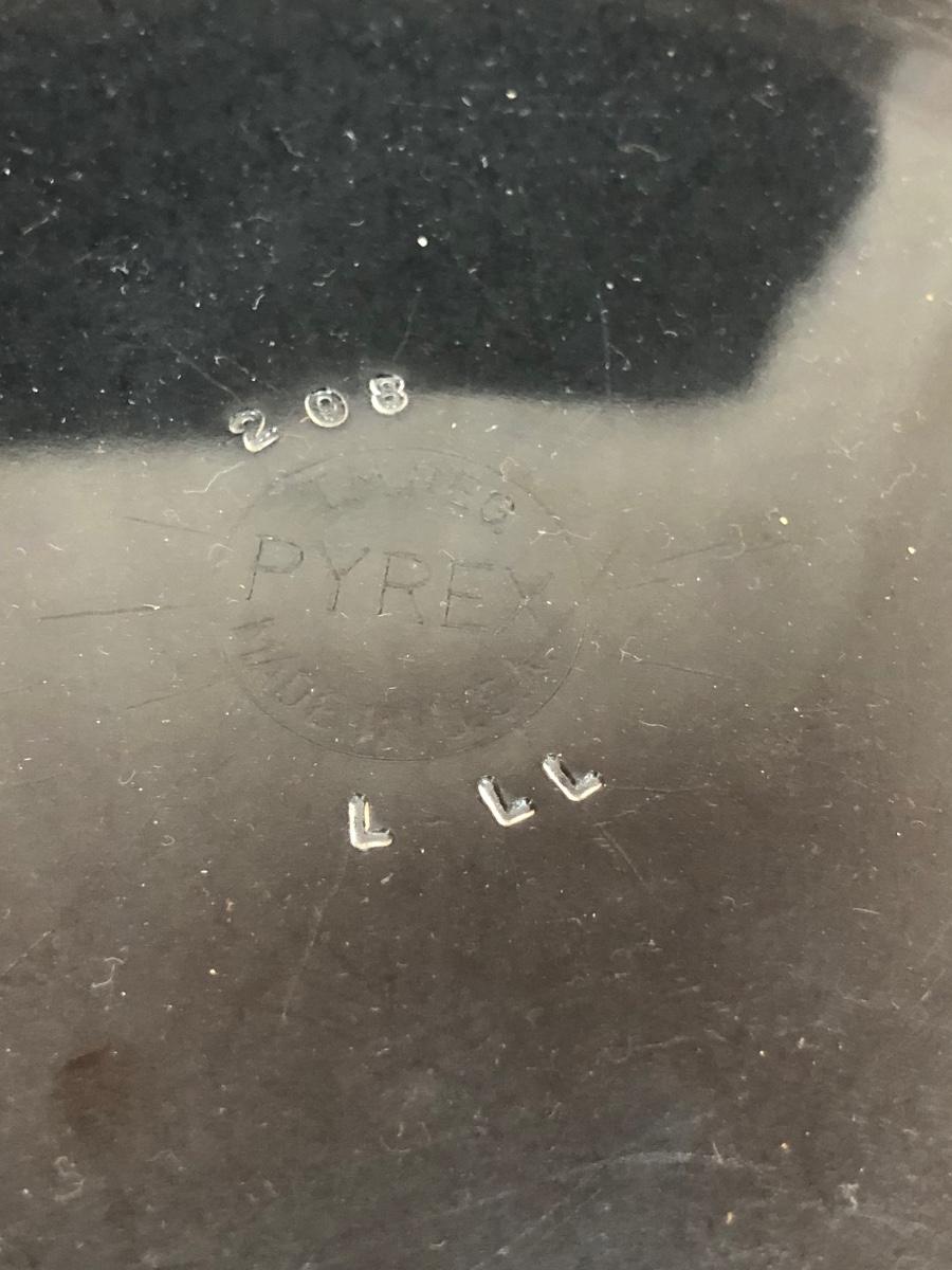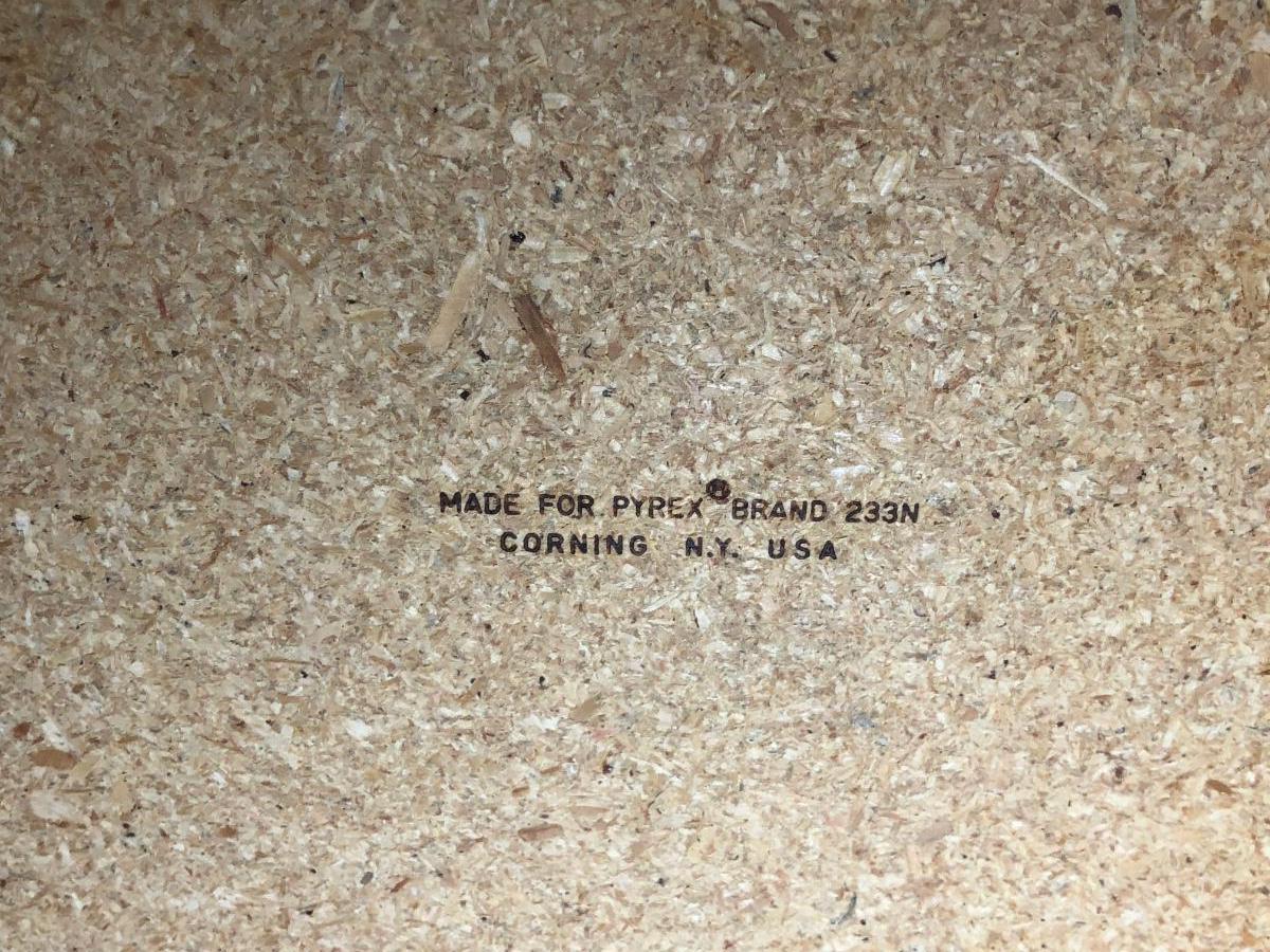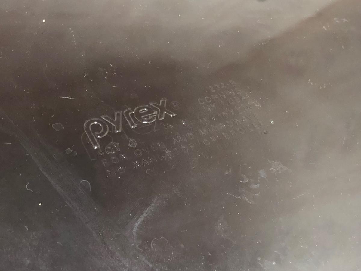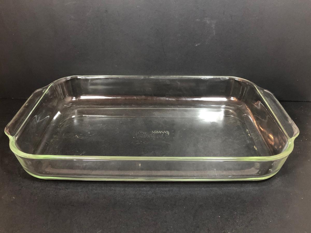 LOT 93K: Glass Pyrex Collection - Square & Round Baking Dishes, Measuring Cup & Tinted Casserole Dish w/ Cork Bottom Basket