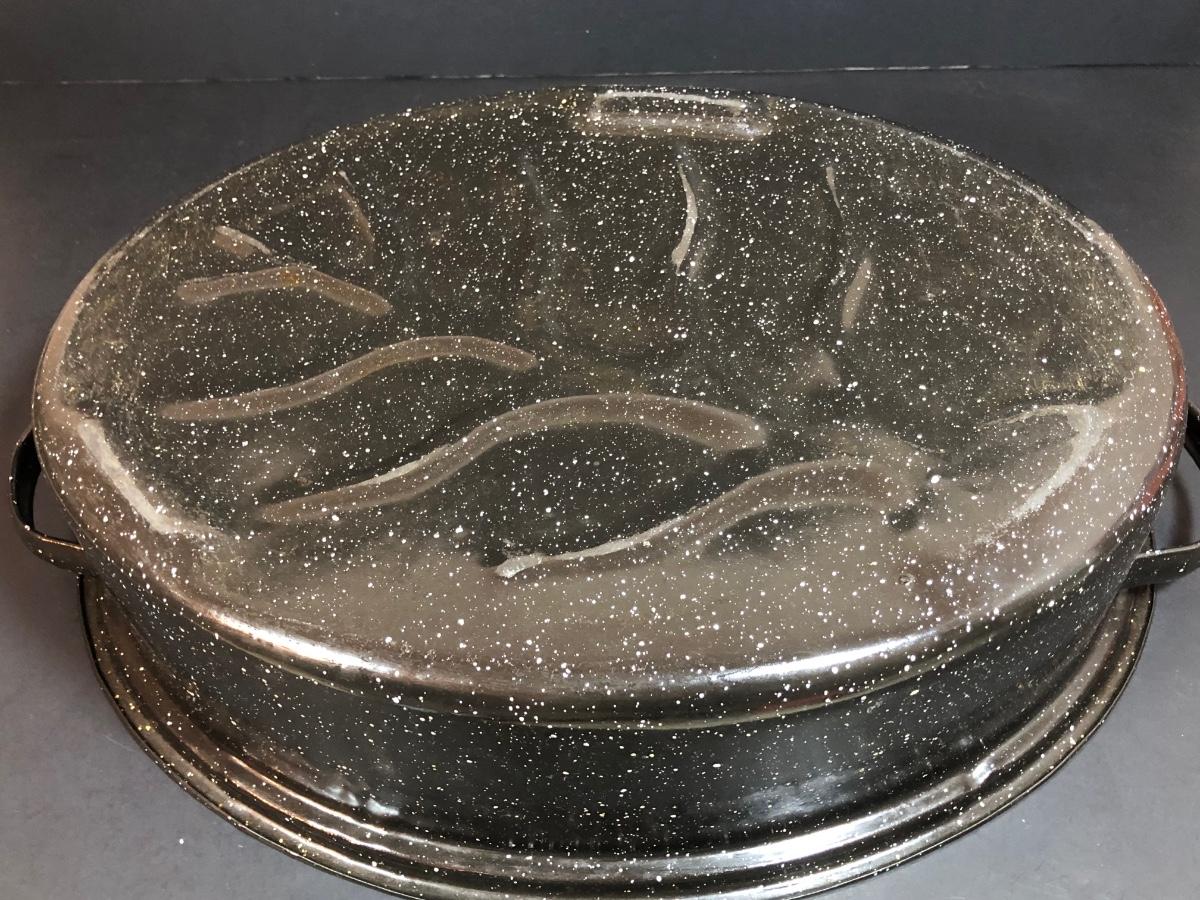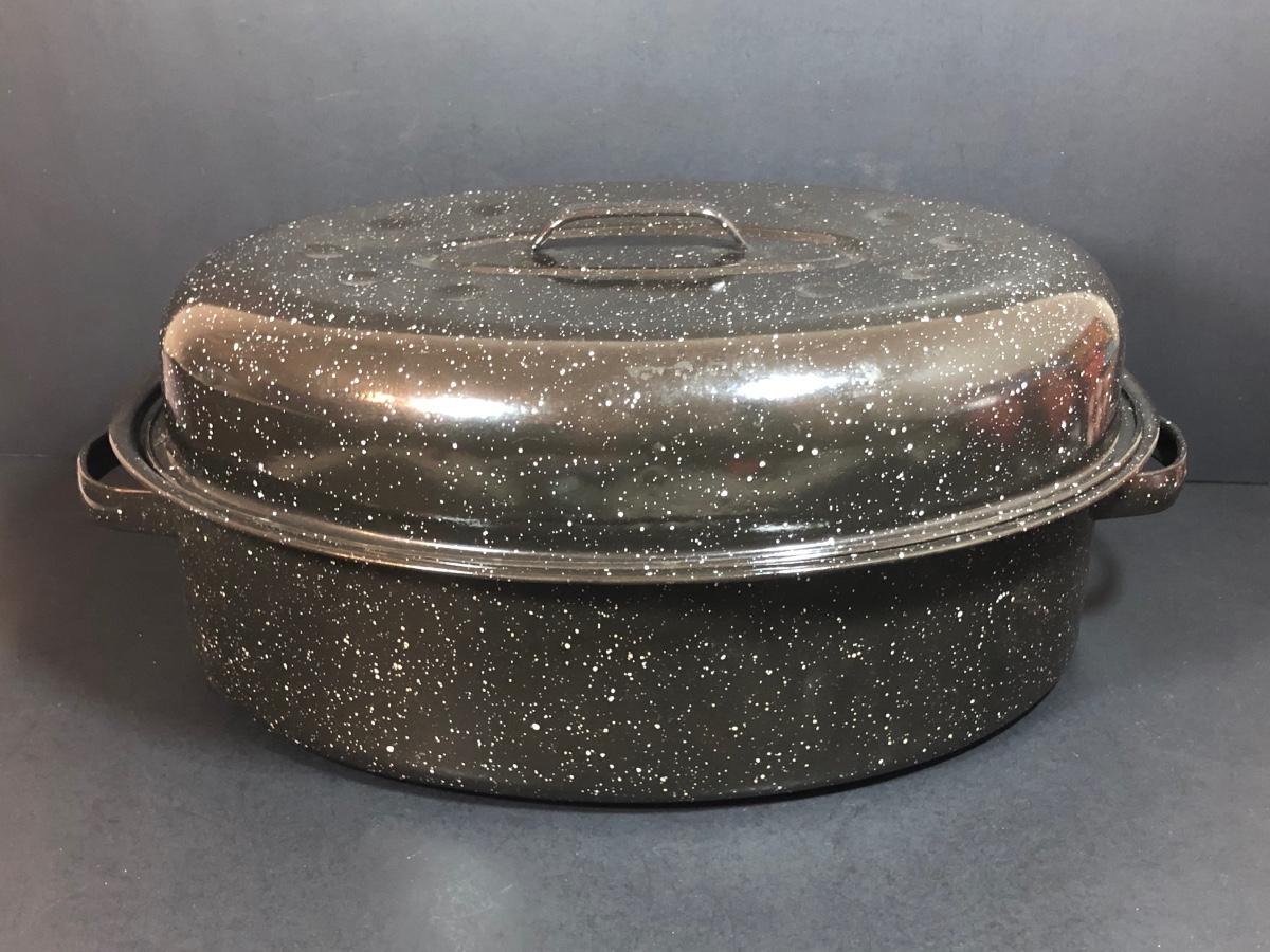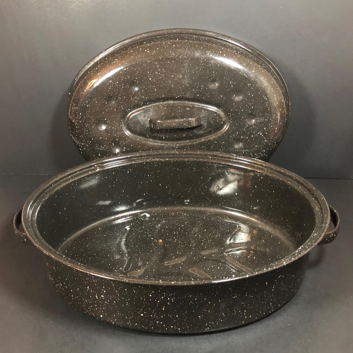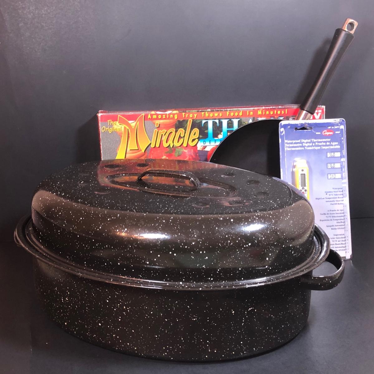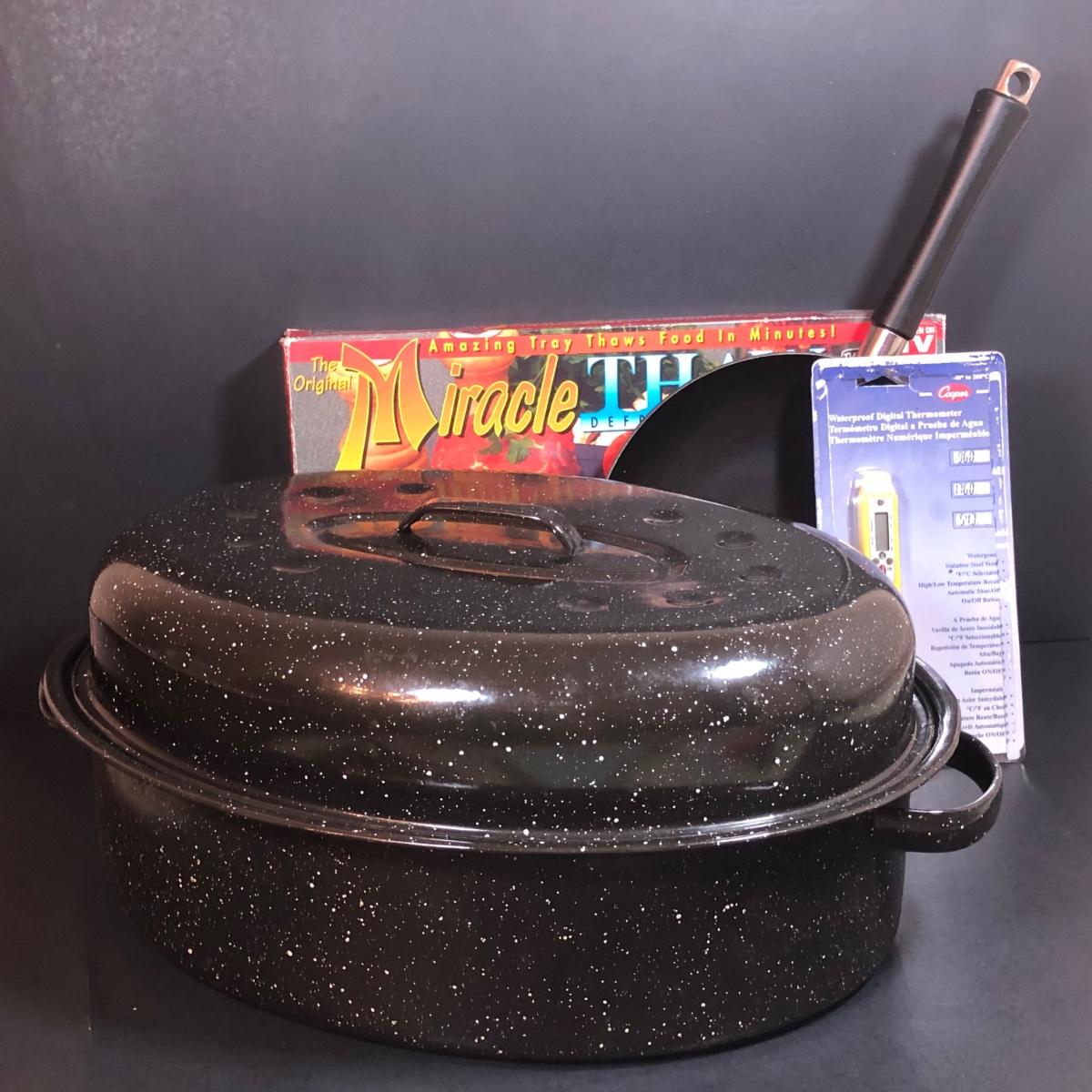 LOT 105D: Enamel Roaster Tin w/ Lid, Nordic Ware Frying Pan, NIB Miracle Thaw Defrosting Tray & Waterproof Digital Thermometer