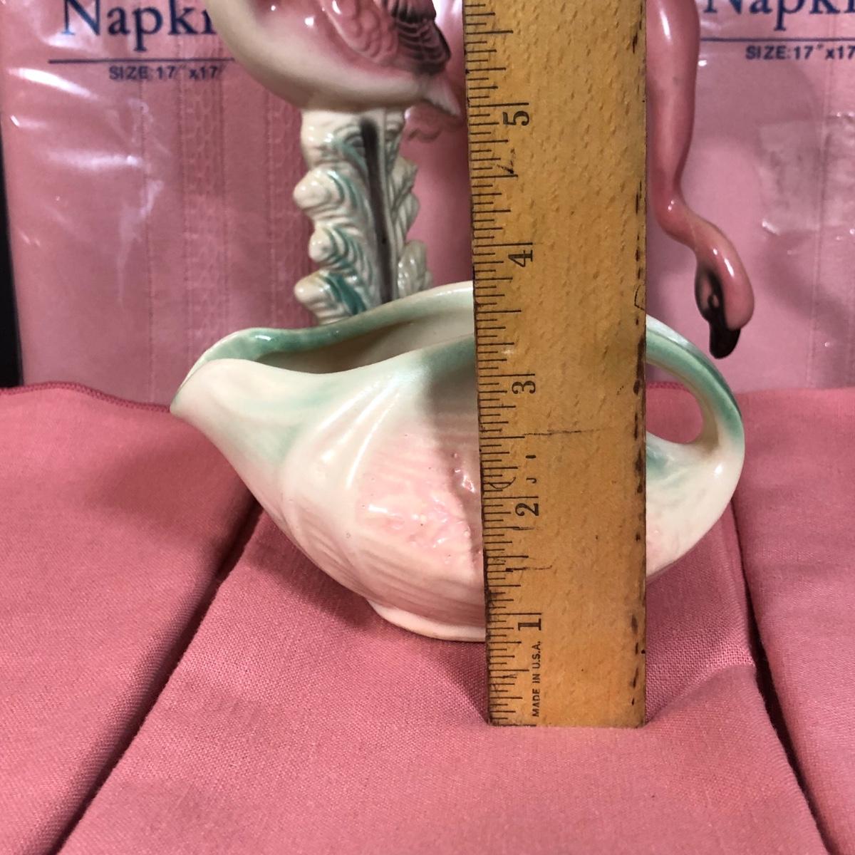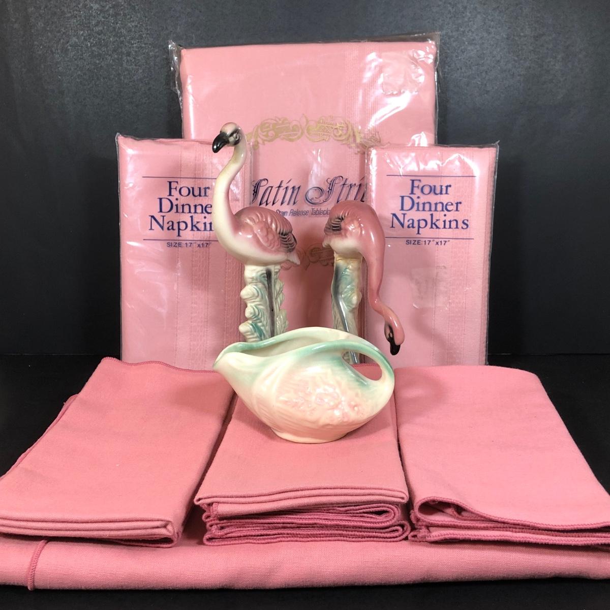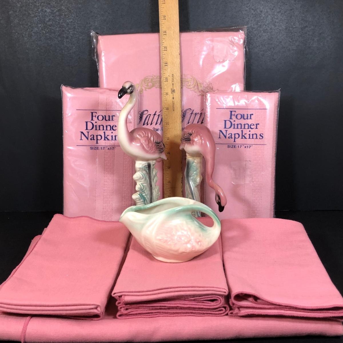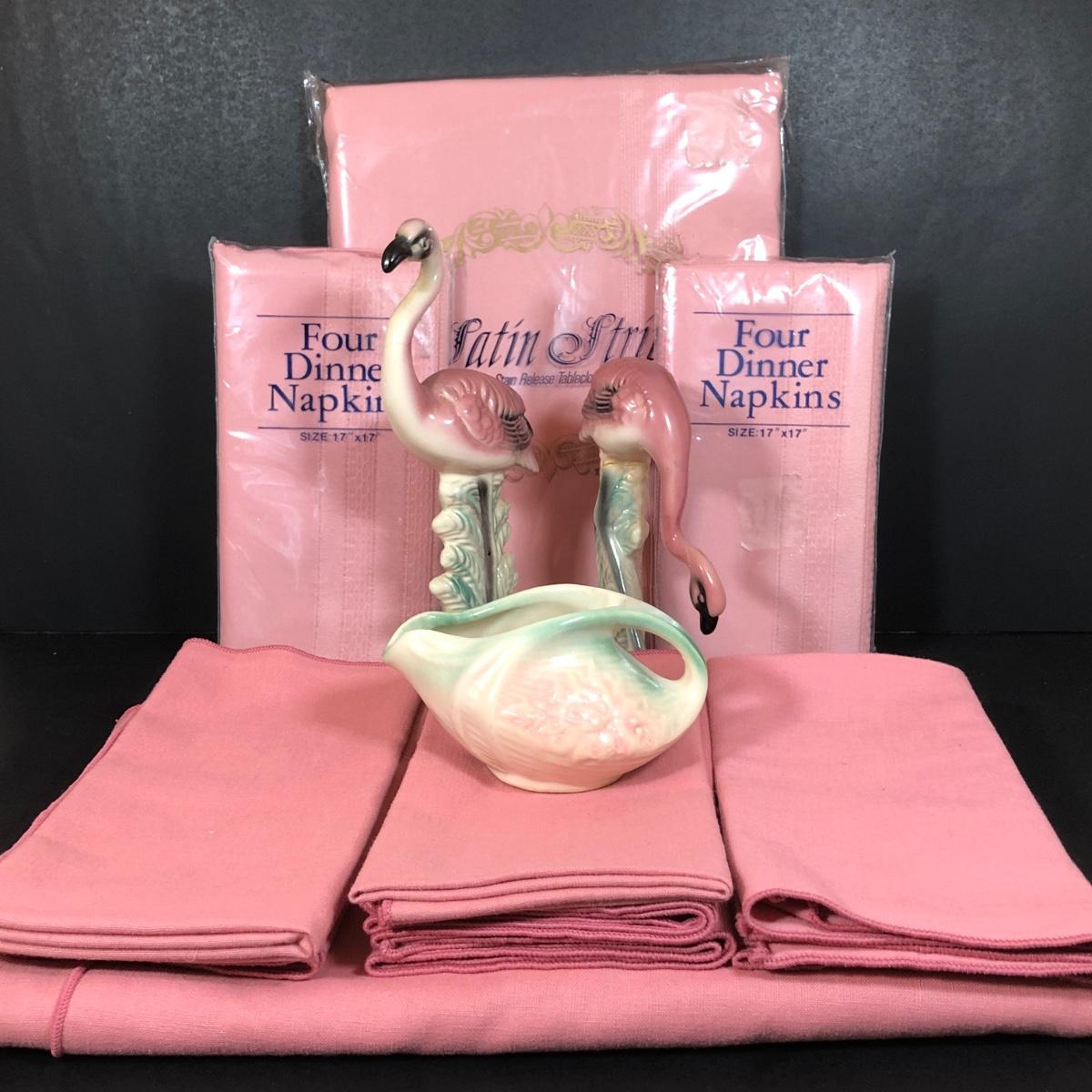 LOT 110K: Vintage 1940s McCoy Pottery Pink/Green Daisy Creamer, Brad Keeler Flamingo Pottery Sculptures & Pink Cloth Napkins & Table Cloths (Some NIP)
