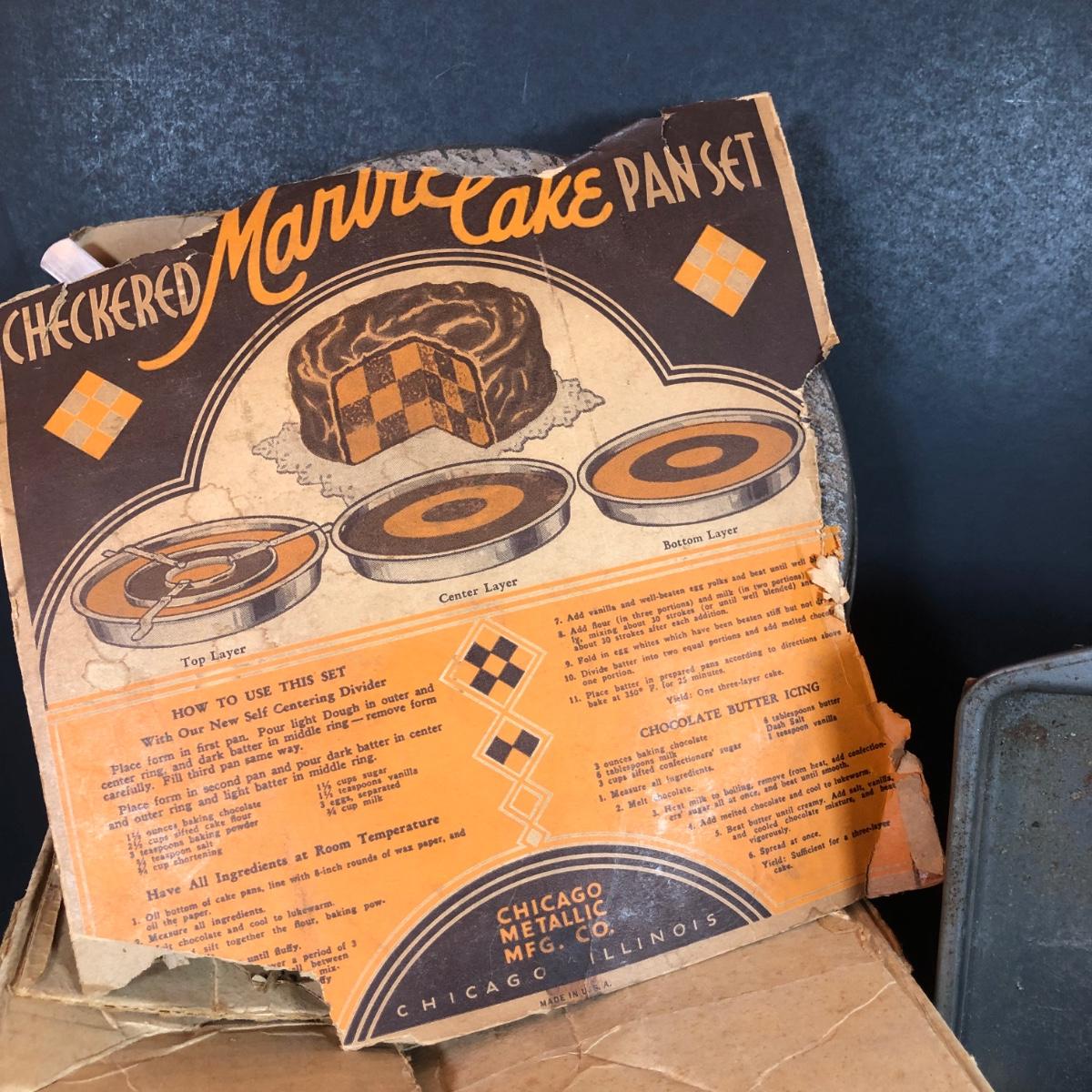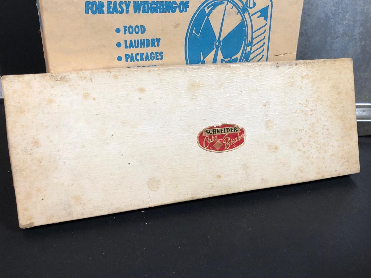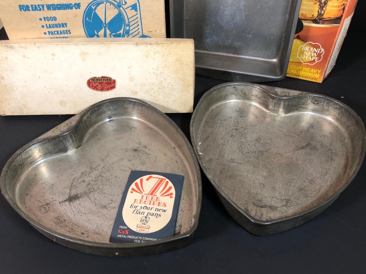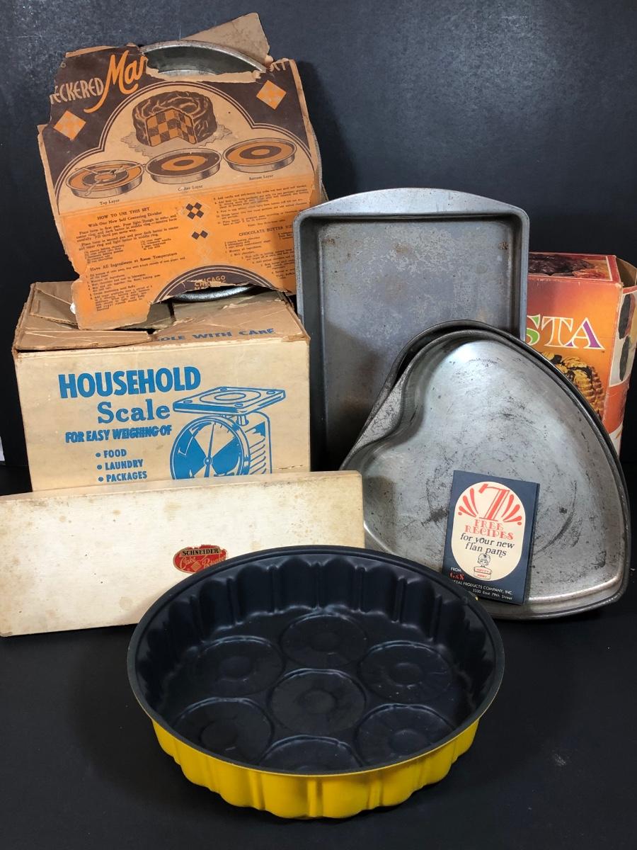 LOT 113F: Vintage Baking Collection - Household Scale, Checkered Marble Cake Pan, Pineapple Upside Down Cake Pan, Schneider Cake Breaker, Nodic Ware Fiesta Bundt Pan & More