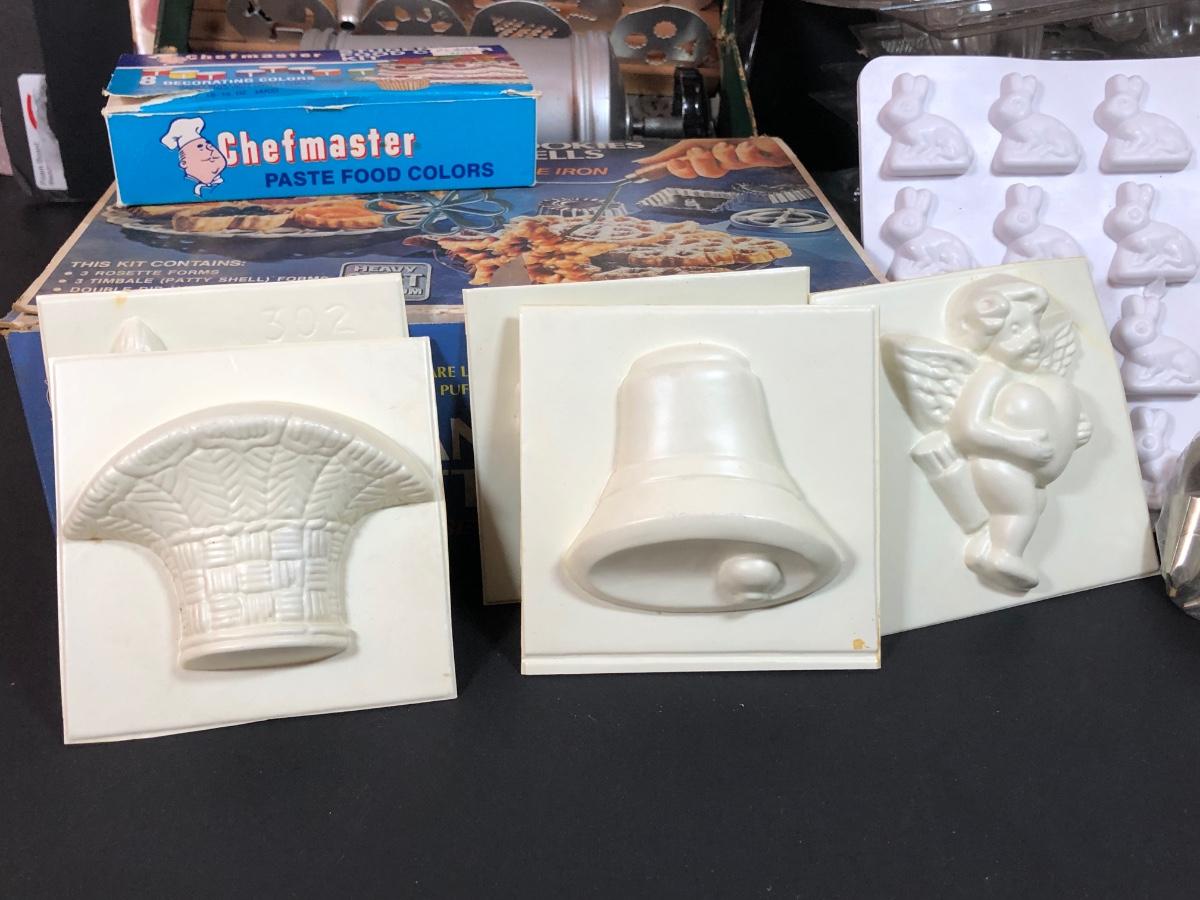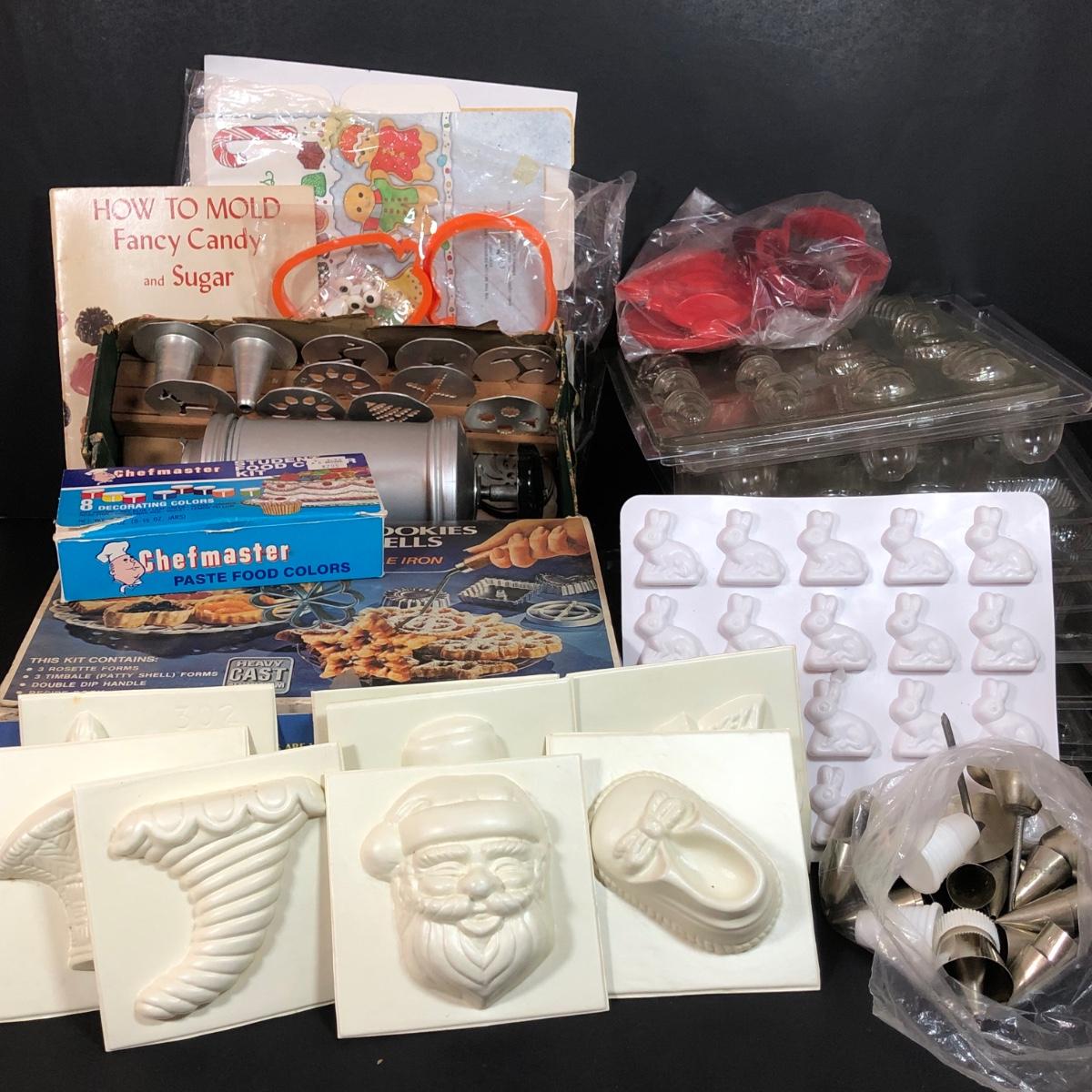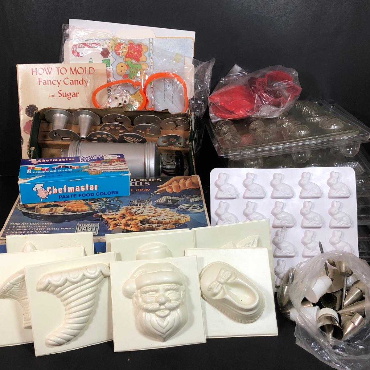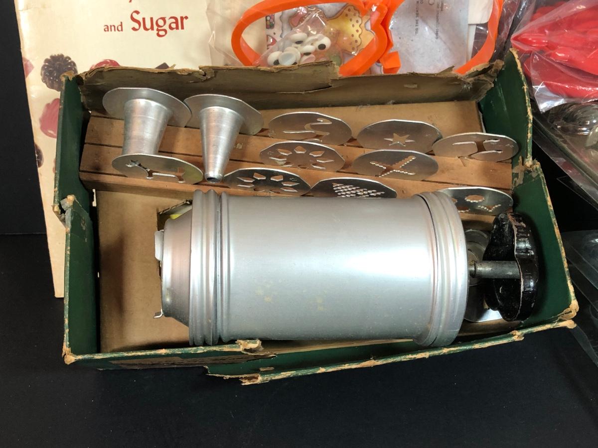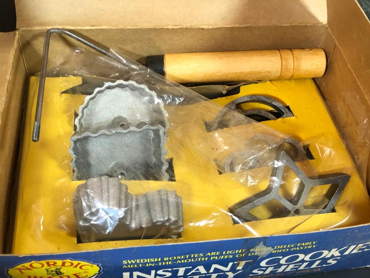 LOT 114F: Vintage Candy Molds, Nordic Ware Double Rosette & Timbale Iron in Box, Mirro "Cooky" & Pastry Press & Glass Thermometers