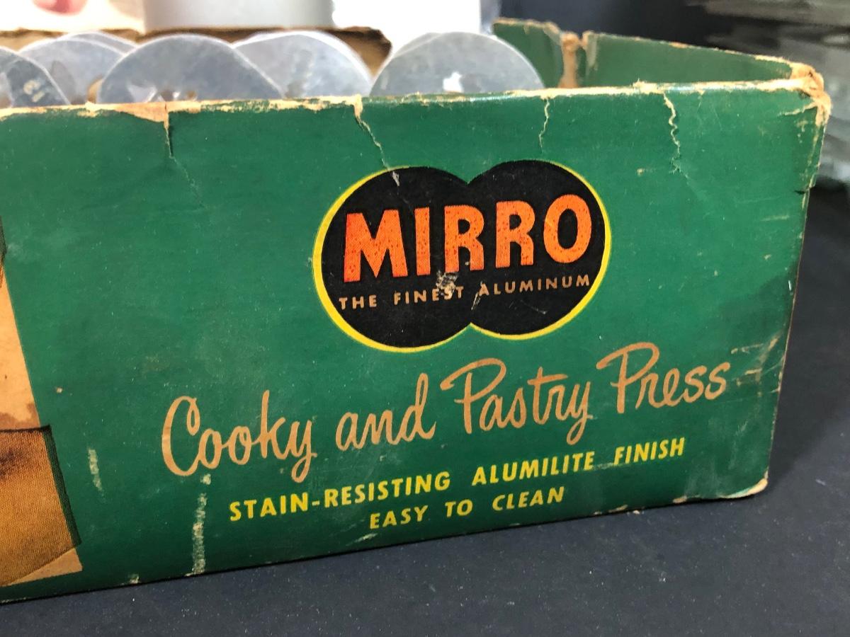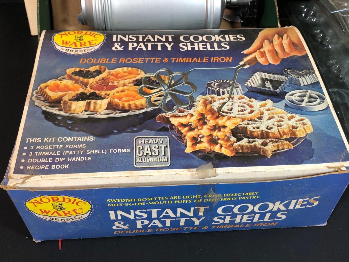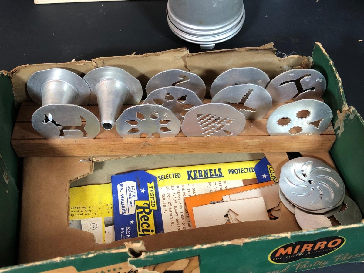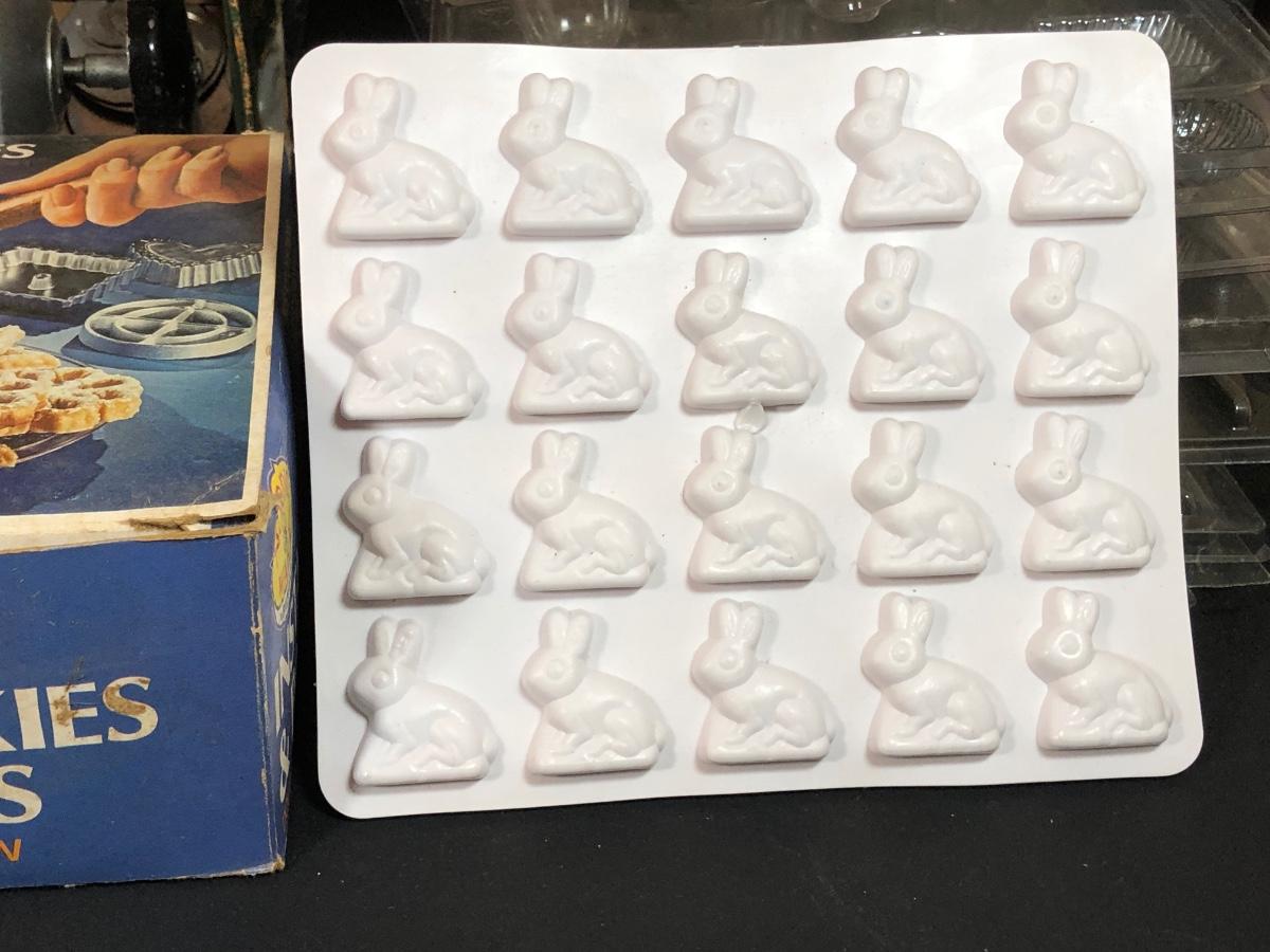 LOT 114F: Vintage Candy Molds, Nordic Ware Double Rosette & Timbale Iron in Box, Mirro "Cooky" & Pastry Press & Glass Thermometers