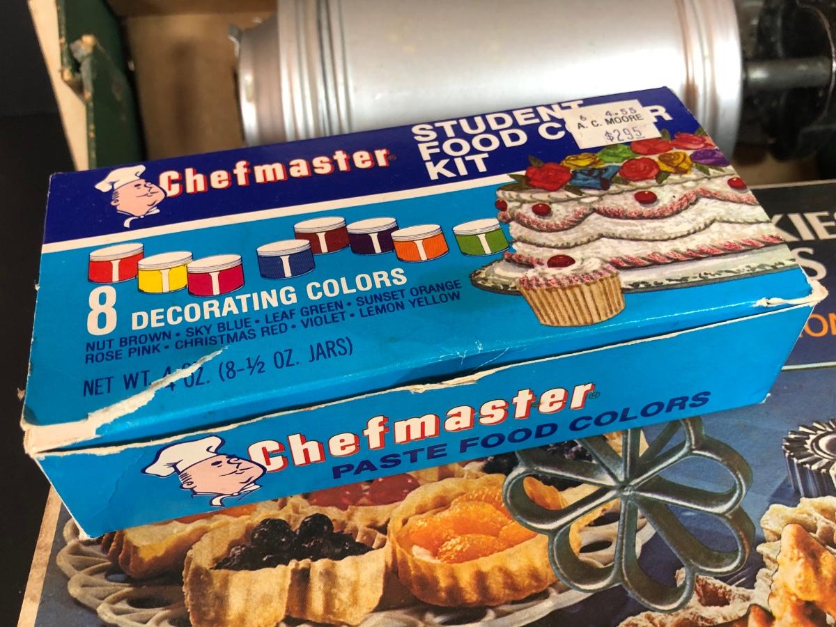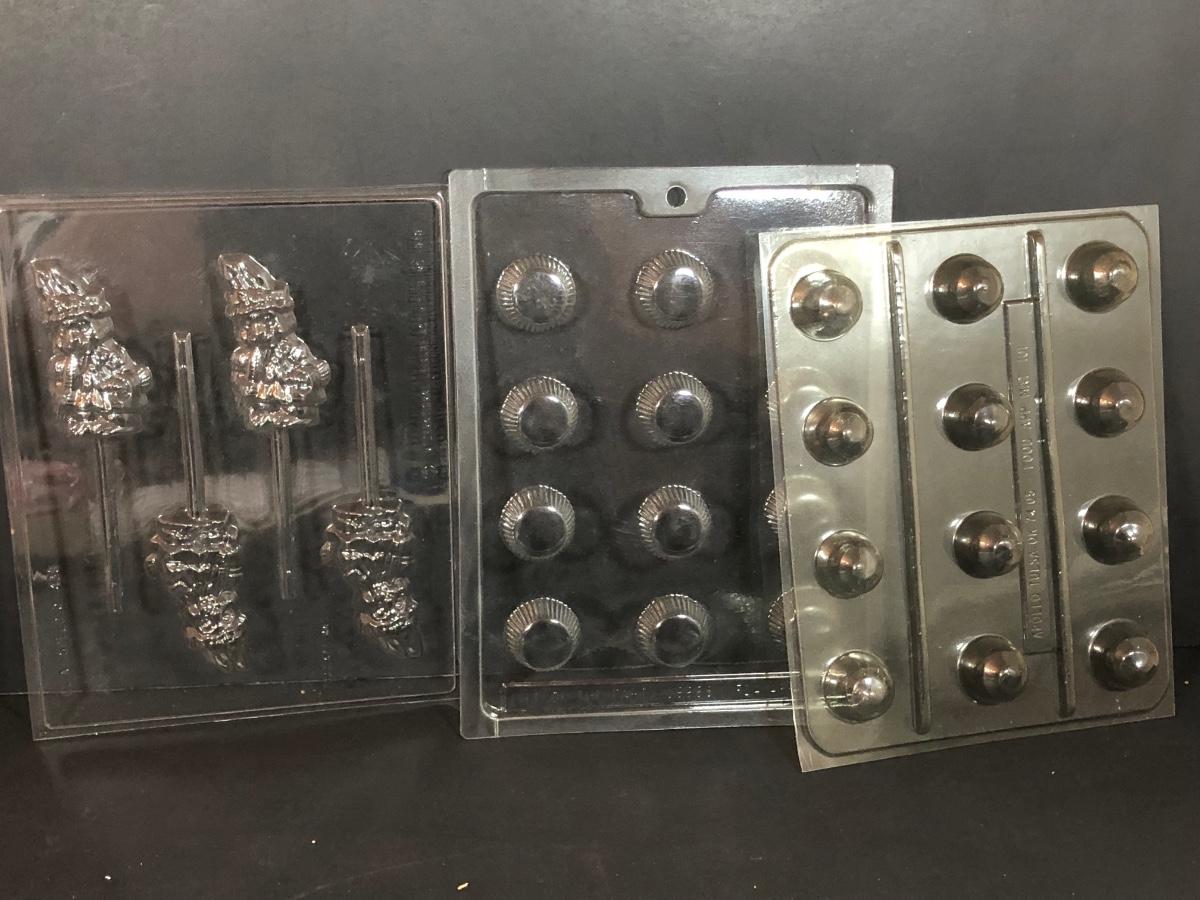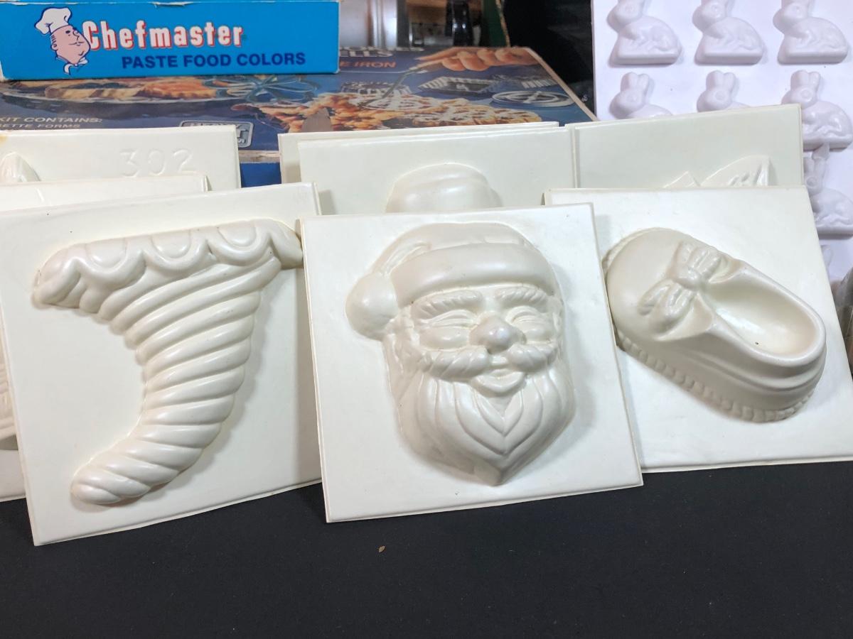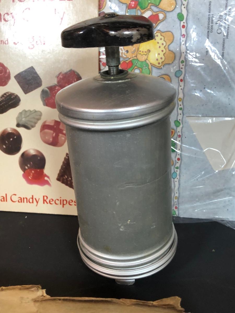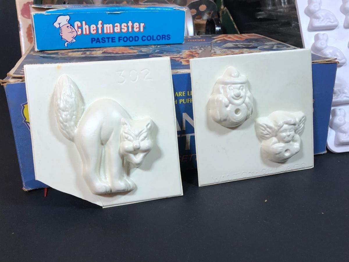 LOT 114F: Vintage Candy Molds, Nordic Ware Double Rosette & Timbale Iron in Box, Mirro "Cooky" & Pastry Press & Glass Thermometers