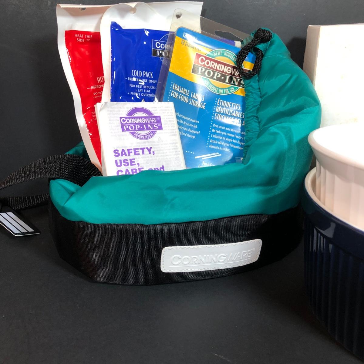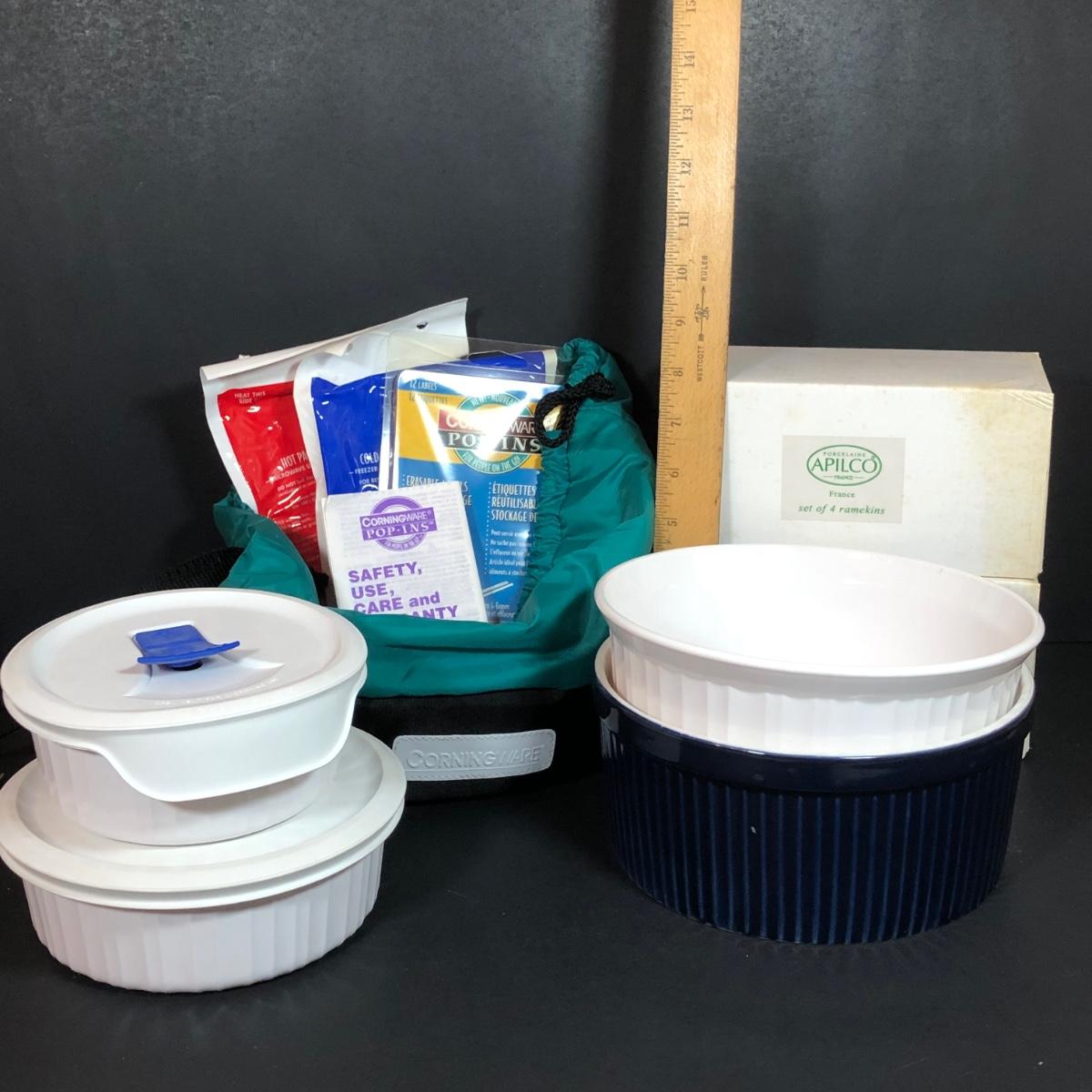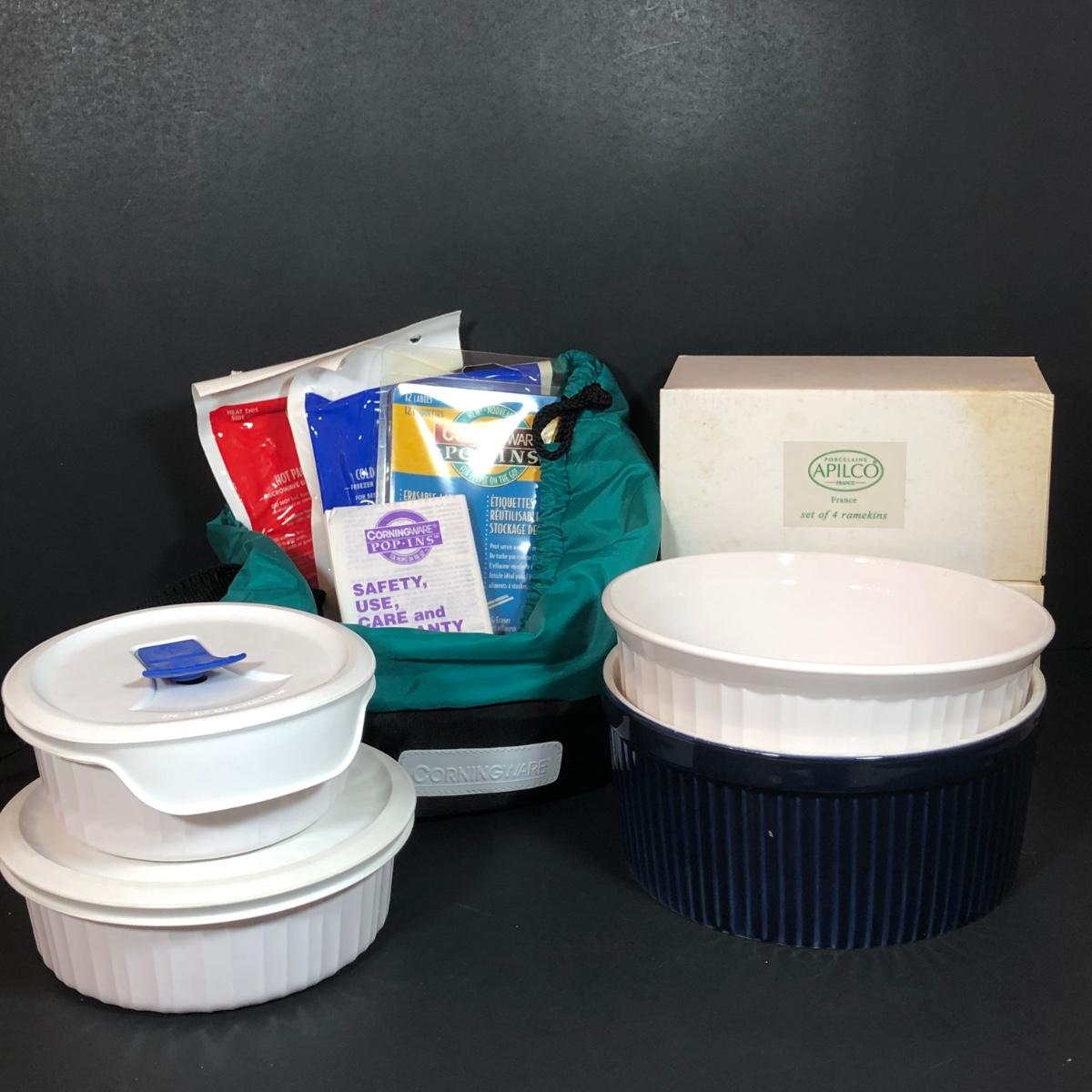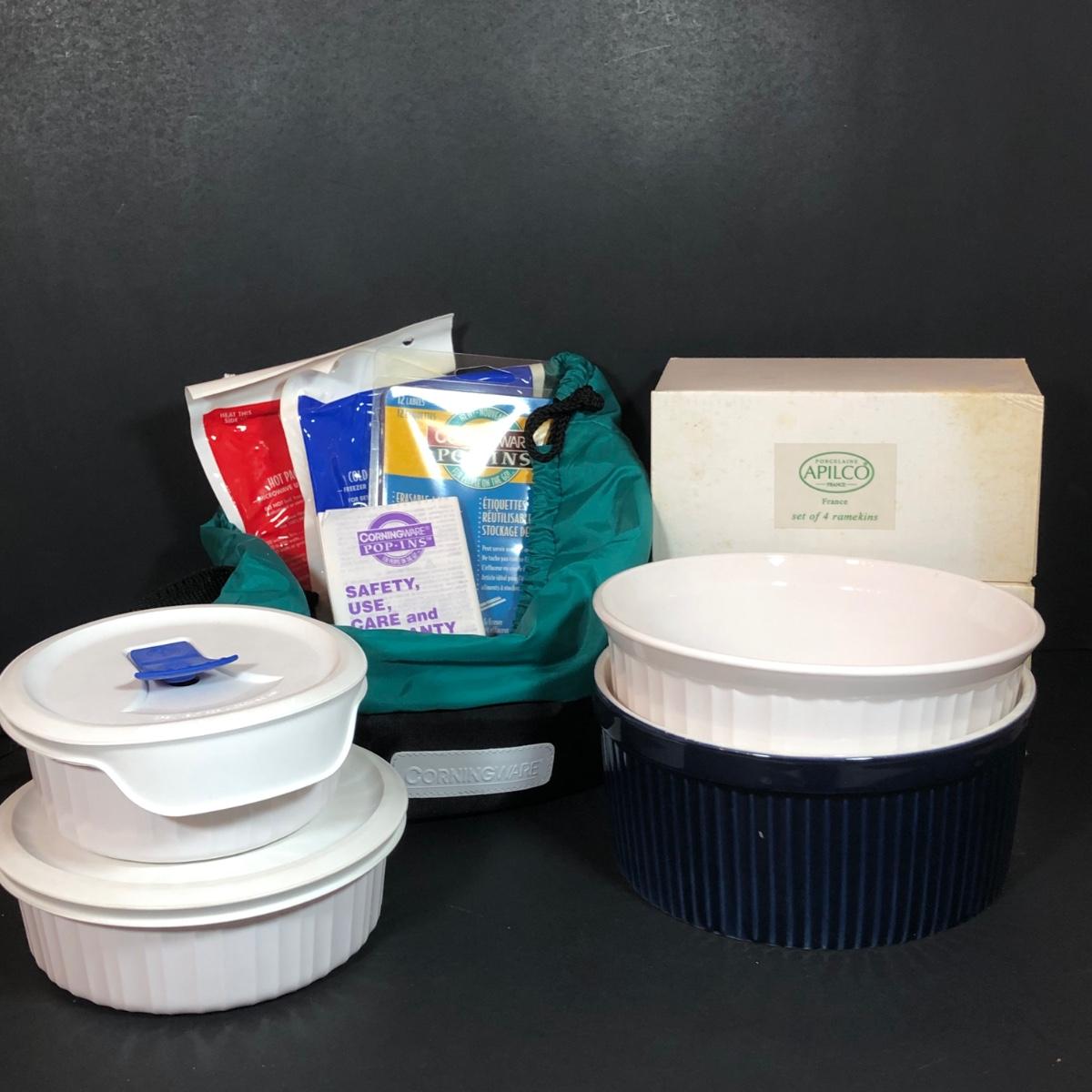 LOT 117K: Corningware Travel Kit w/ Bag & Lids, Aprilco France Porcelain Ramekins in Boxes, Corningware & Technique Souffle Dishes