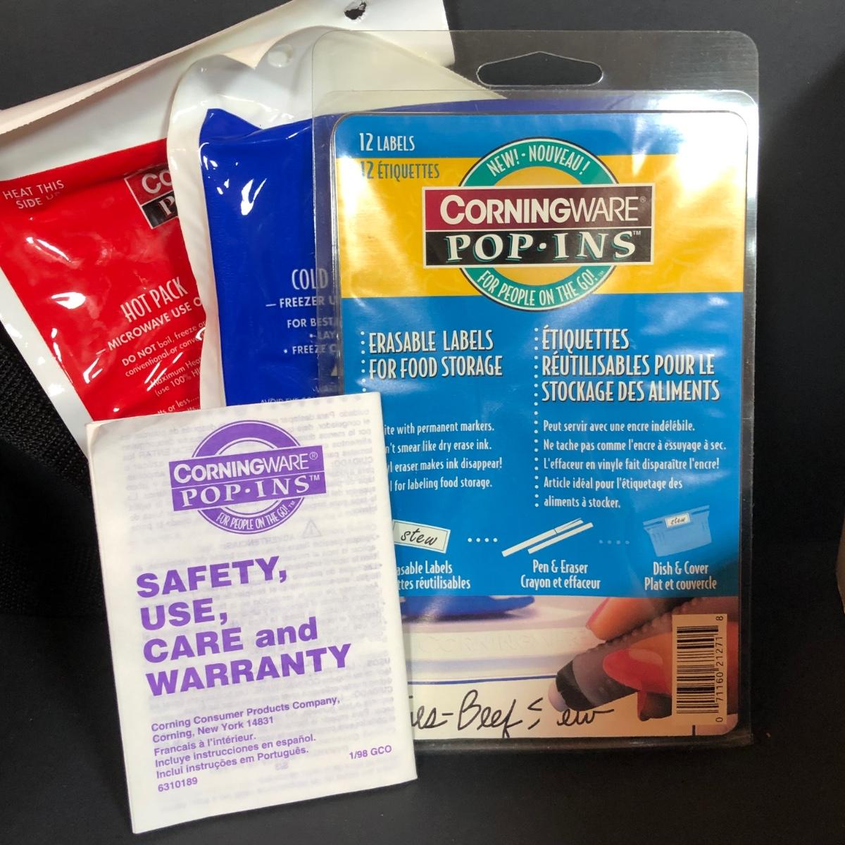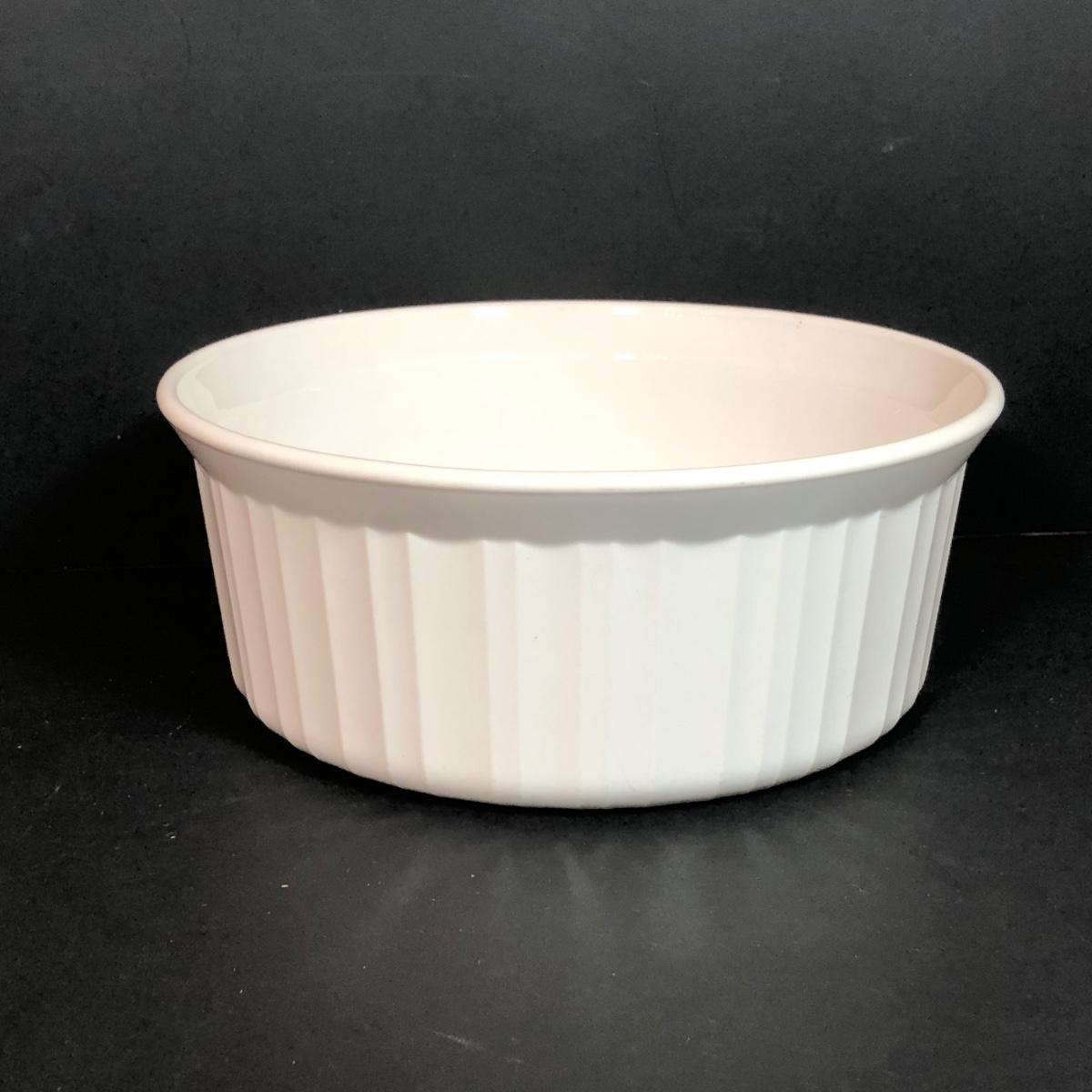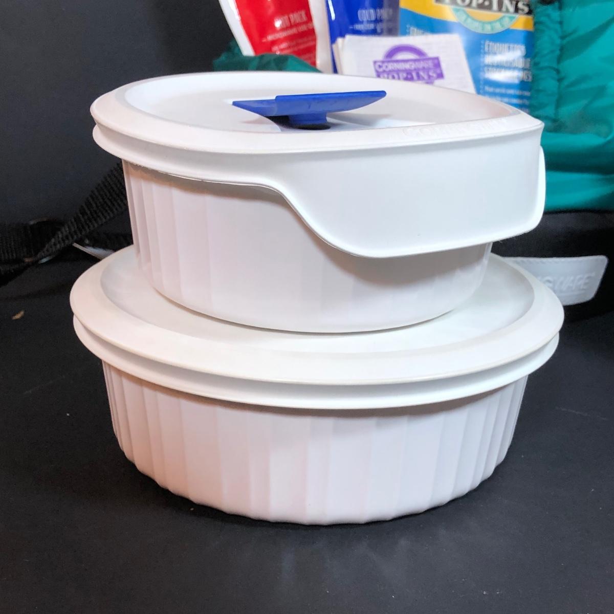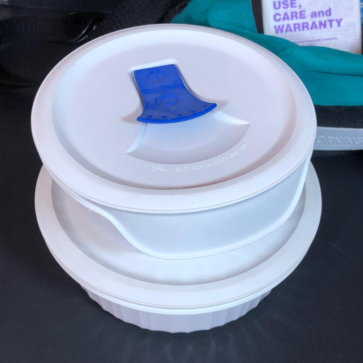 LOT 117K: Corningware Travel Kit w/ Bag & Lids, Aprilco France Porcelain Ramekins in Boxes, Corningware & Technique Souffle Dishes