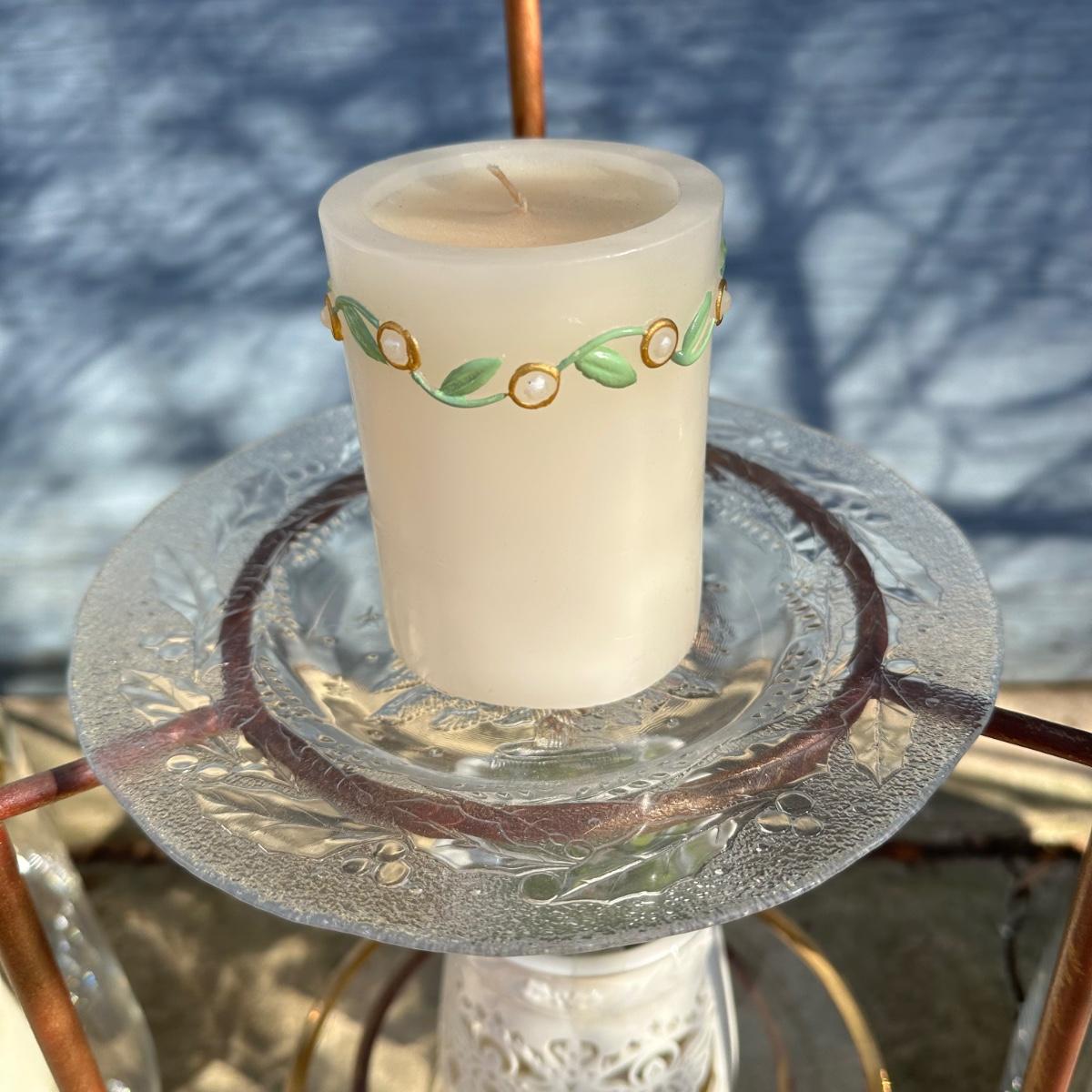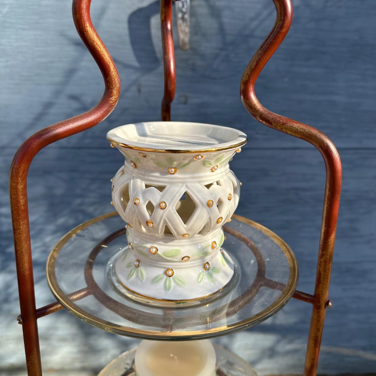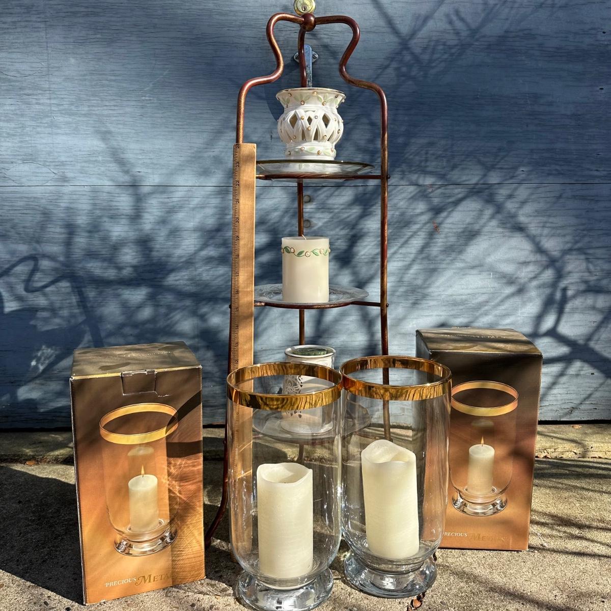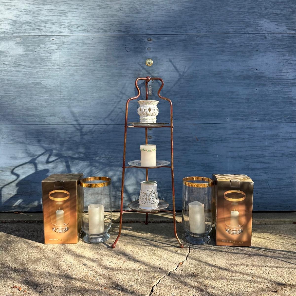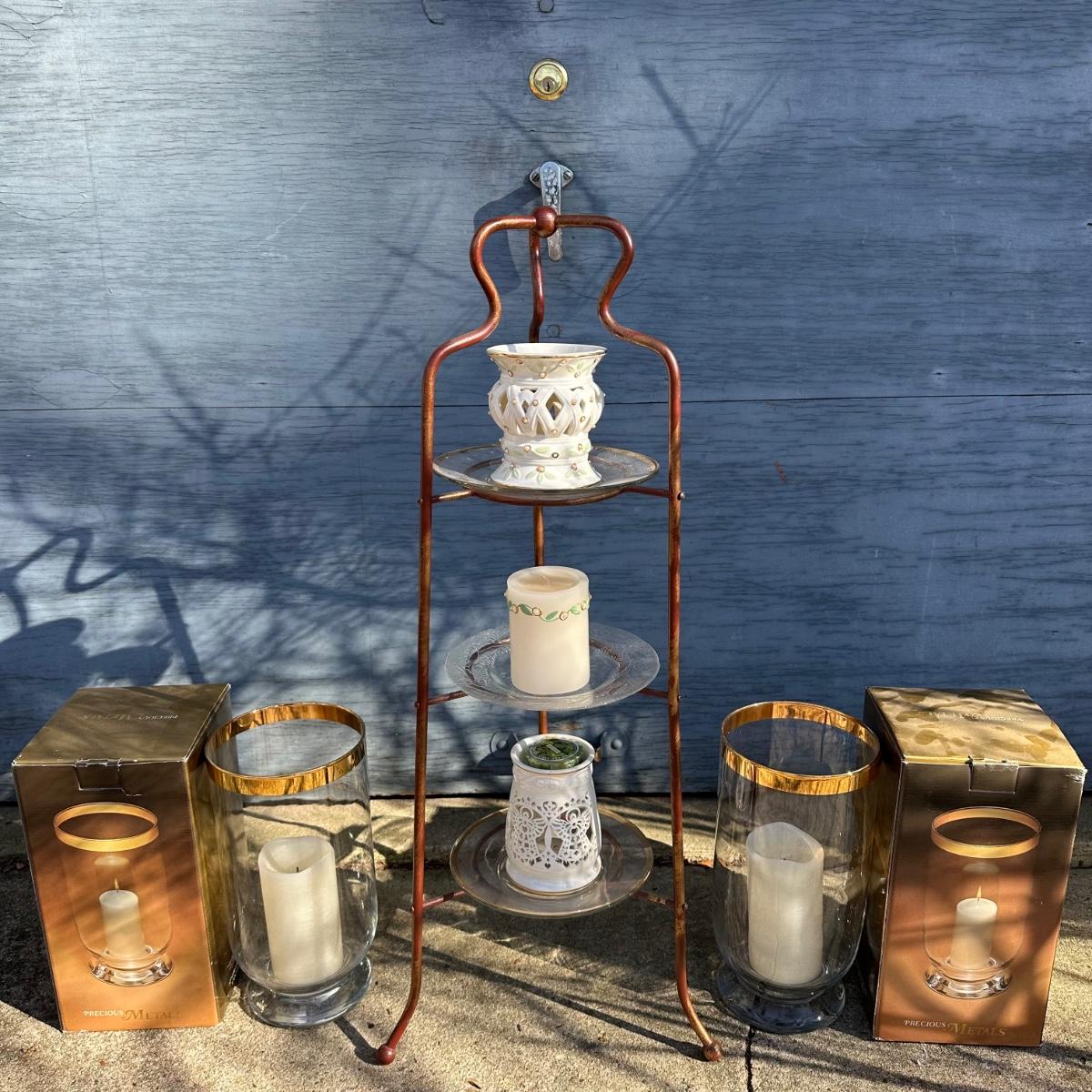 LOT 136L: Vintage 3 Tier Cake Stand w/ Avon Candle Holder, Yankee Candle & More
