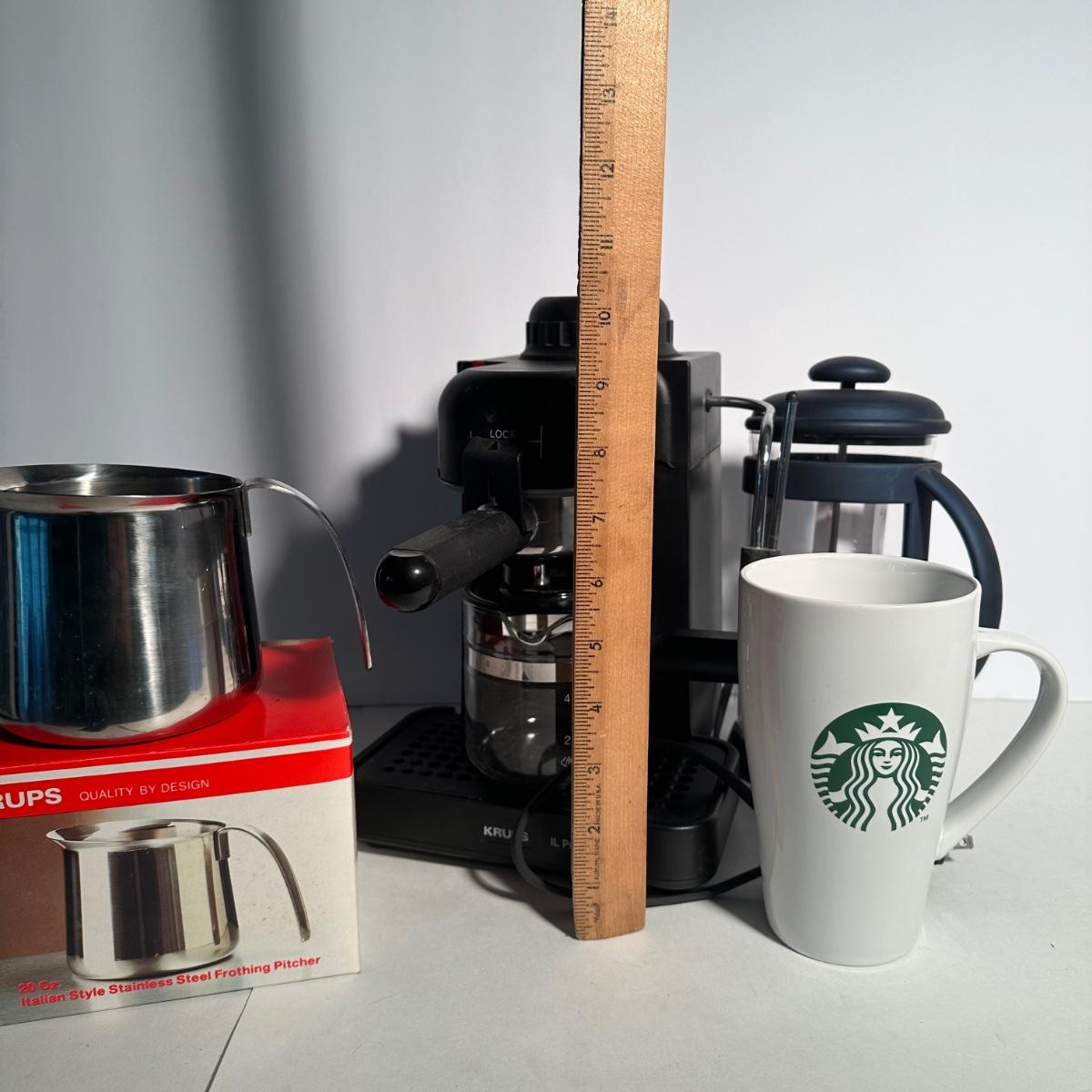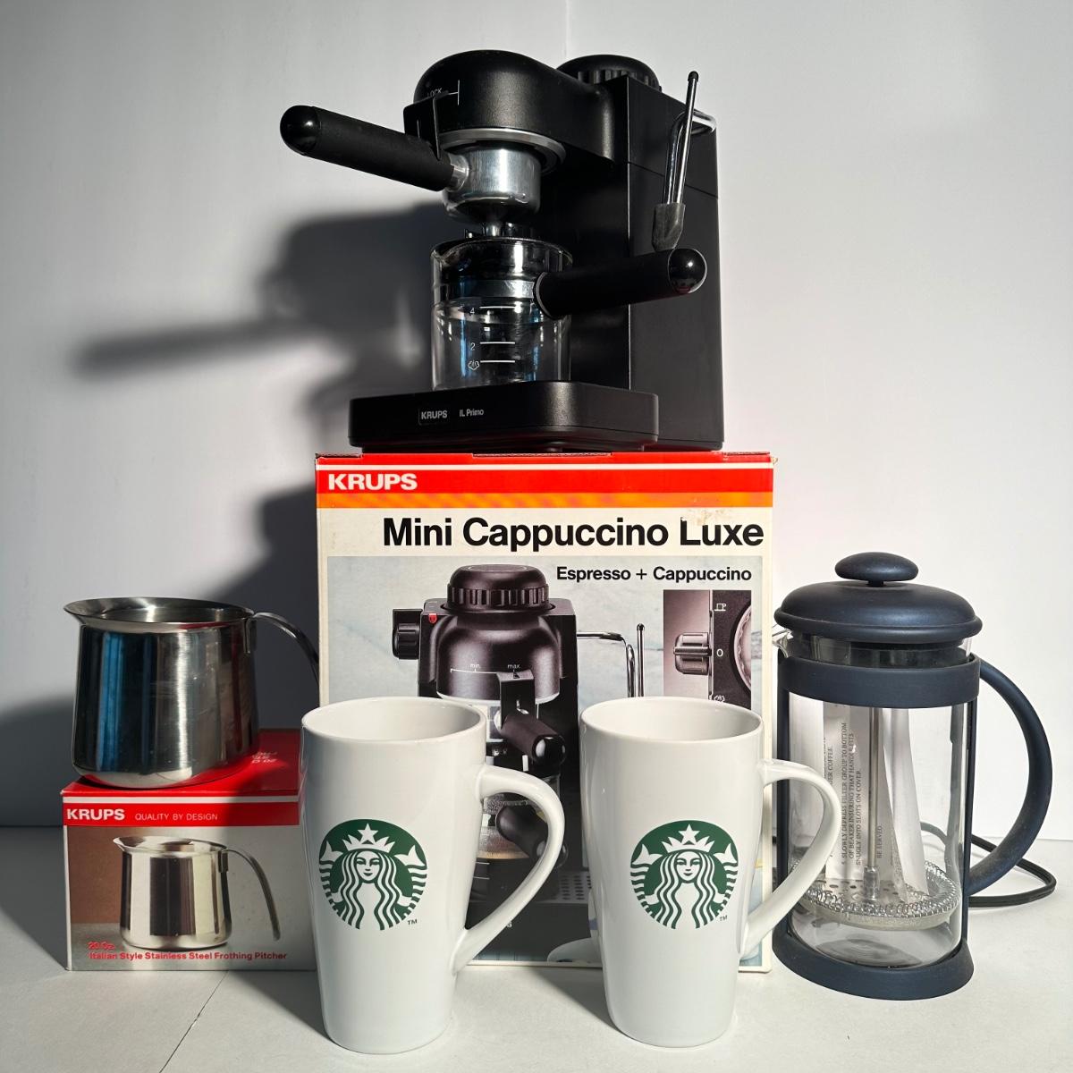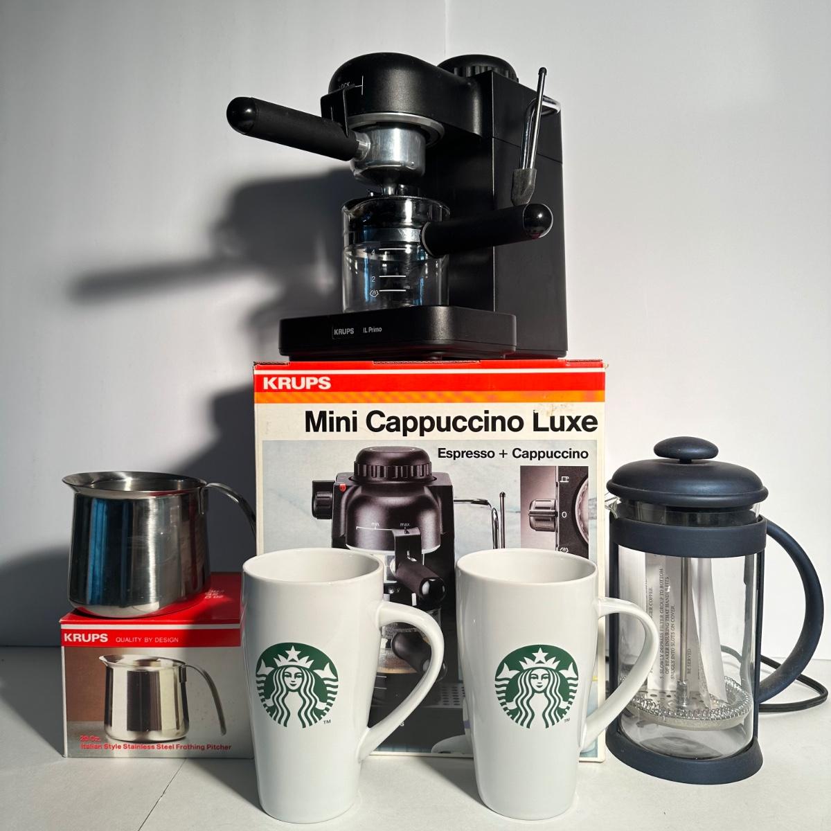 LOT 145F: Krups Mini Cappuccino Luxe w/Frothing Pitcher, French Press & Starbucks Mugs