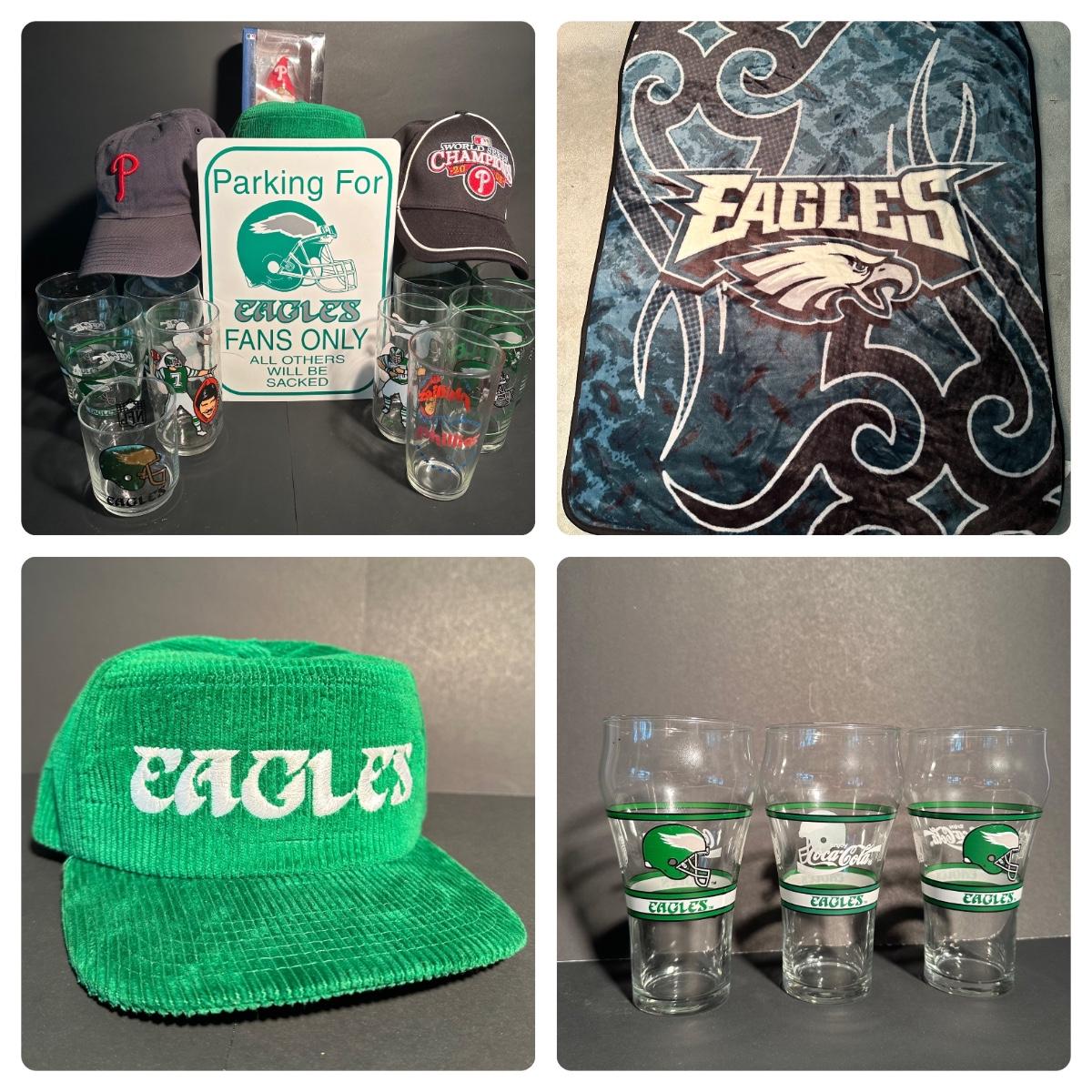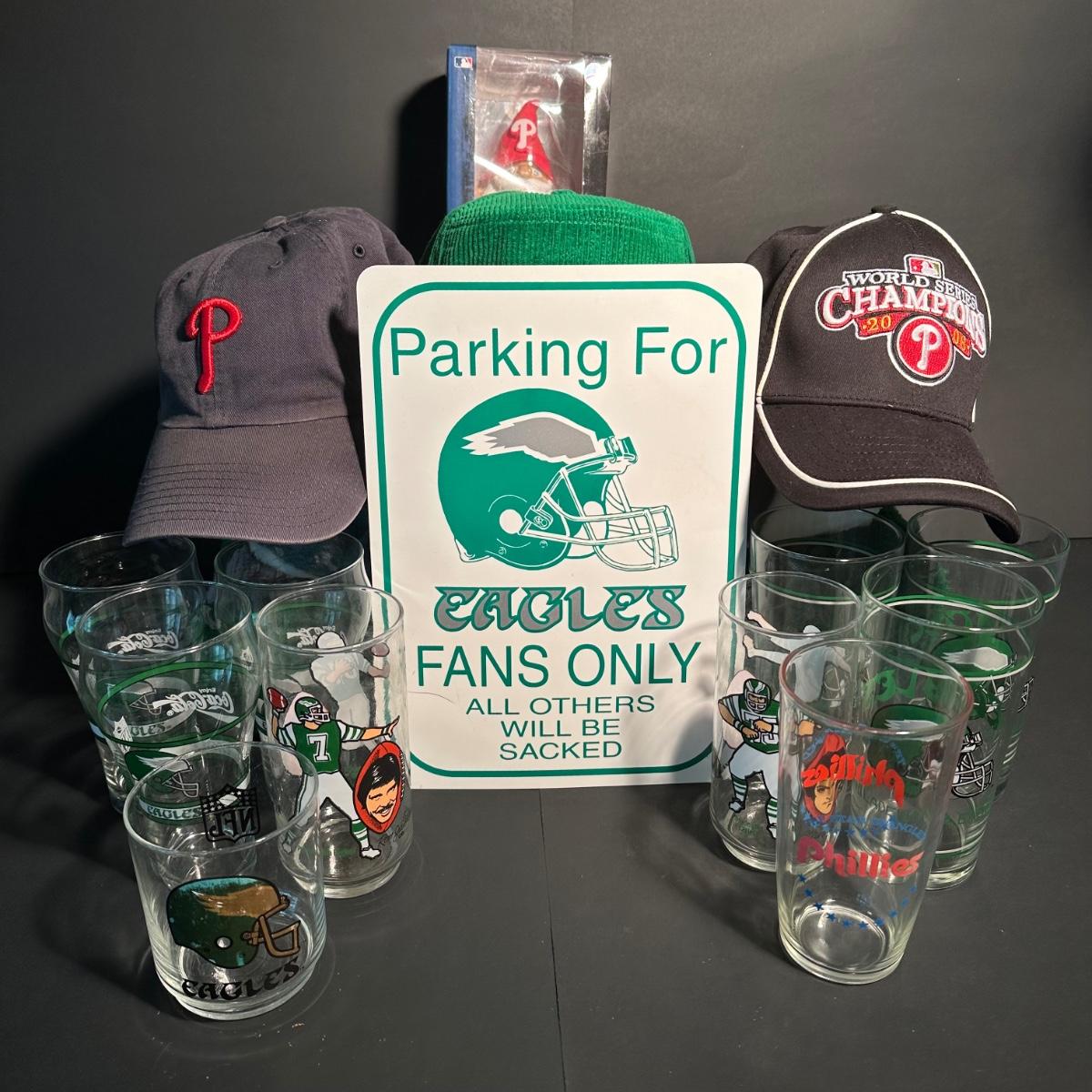 LOT 152L: Vintage Eagles/Phillies Collection - McDonald’s Glasses, Blankets, Team Gnome & Hats